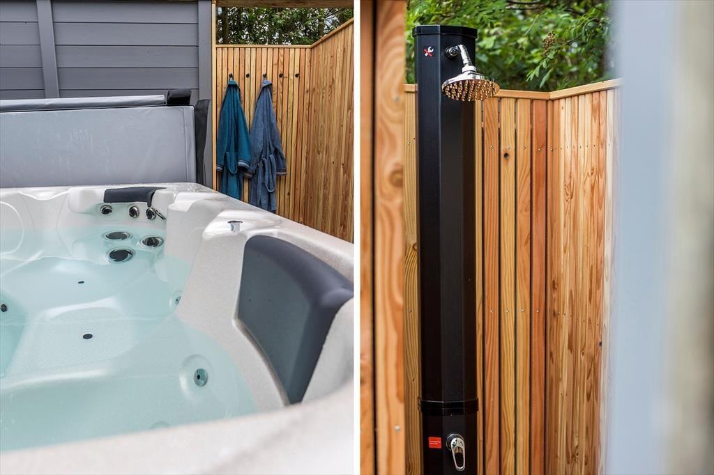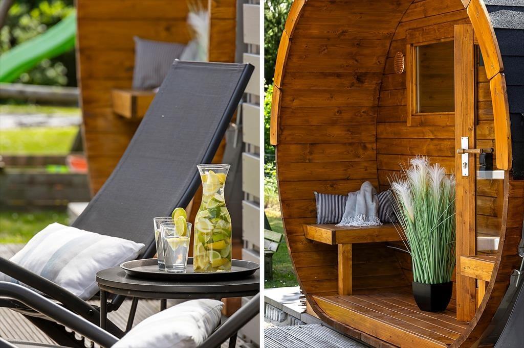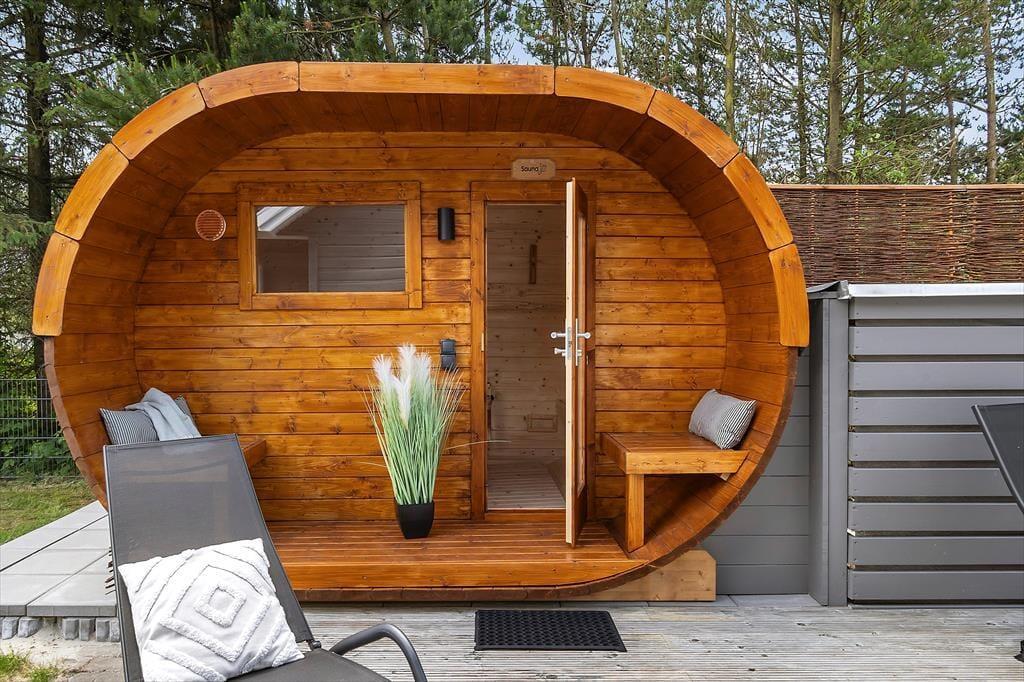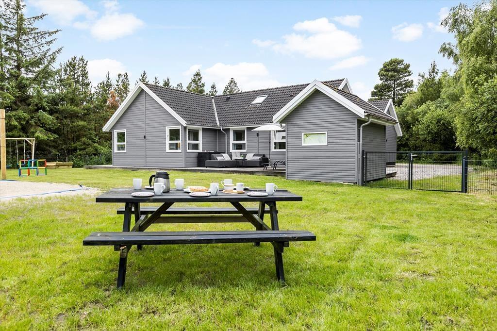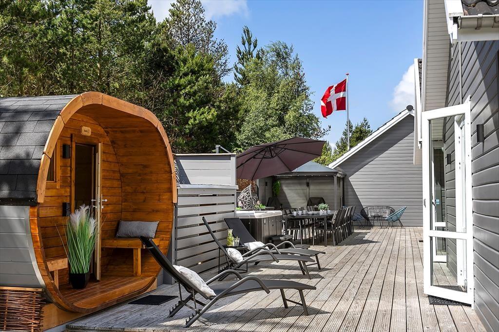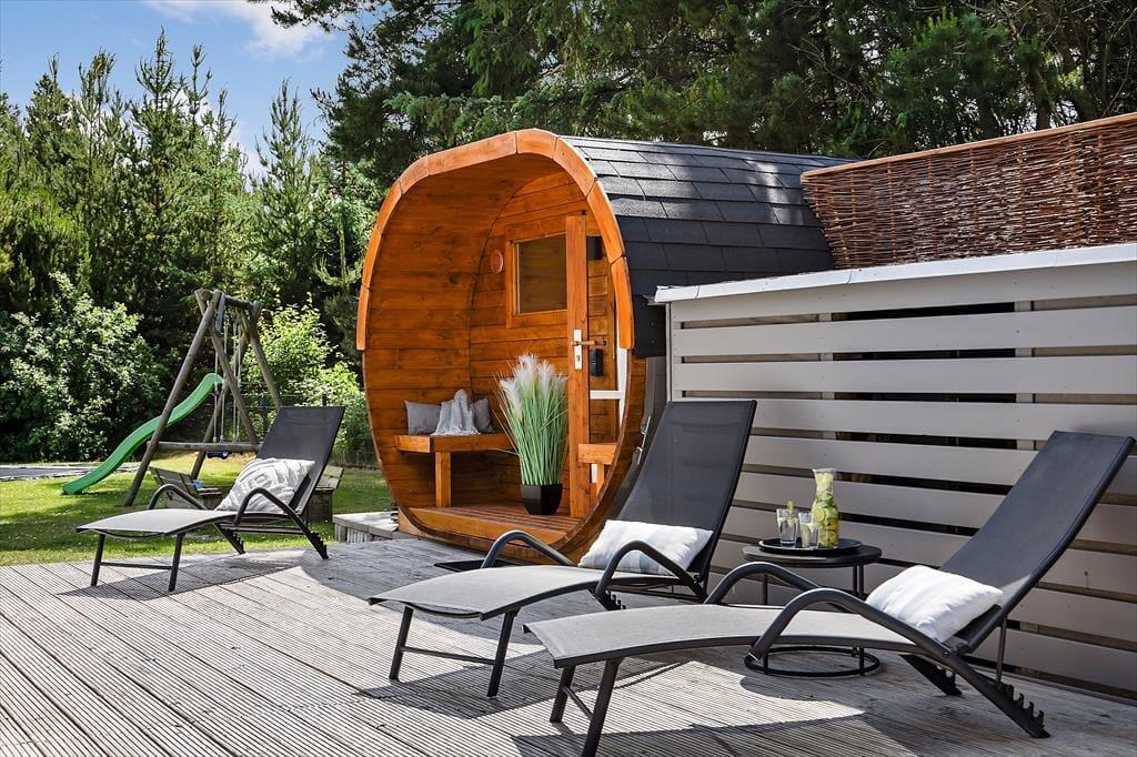 Også ude i det fri er der sket forbedringer for nylig i form af en stor og solrig træterrasse, der ligger syd for sommerhuset. I har adgang til den fra både opholdsrummet og poolafdelingen, og det er en skøn og delvist afskærmet oase, der er udstyret med grill, liggestole og havemøbler af god kvalitet, samt udebruser, en tøndesauna og en skøn udespa. Grunden måler 2.350 m², så I har også masser af plads til parkering og til at boltre jer på græsplænen, der er udstyret med legefaciliteter til børnene. Grundens have er indhegnet, hvilket sikrer at ingen farer vild imens de boltrer igennem den og får afbrændt masser af energi.