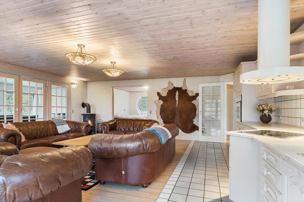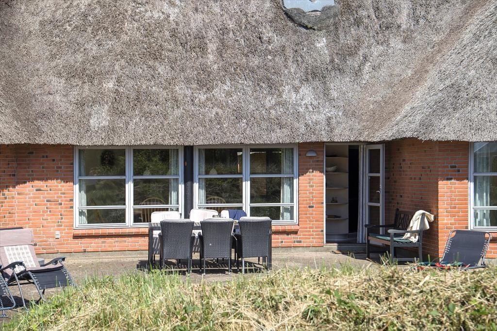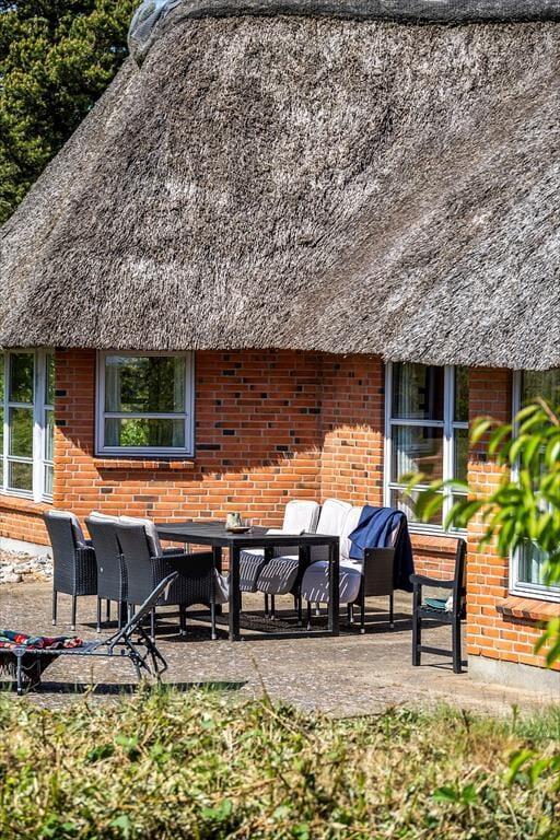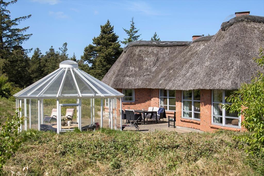 Huset er opført i 1996 og tager sig flot og indbydende ud med rødstensfacade, stråtag og hvide sprossevinduer. Det gode førstehåndsindtryk fortsætter, når du træder indenfor i ferieboligen, hvor pladsen er særdeles generøs. De sammenhængende opholdsrum sætter en dejlig ramme om det hyggelige samvær på ferieturen, og du kan sidde og nyde den omgivende natur gennem de store vinduespartier. Bemærk desuden, at der er udgang til terrasser og have fra alle husets opholdsrum. Der er to soveværelser i stueplan, mens de øvrige to er placeret på førstesalen. Huset er som noget helt særligt udstyret med to køkkener, og med tre badeværelser – det ene med sauna og et wellnessrum med spabad og motionsudstyr – er der skruet ekstra op for velværefaktoren. Du får også et aktivitetsrum med poolbord og bordfodbold.
