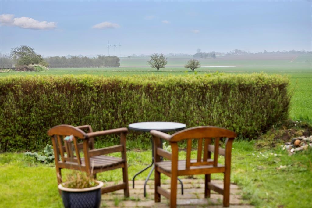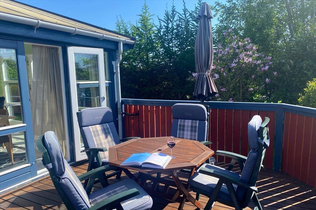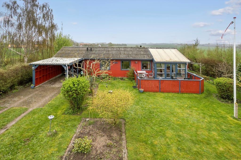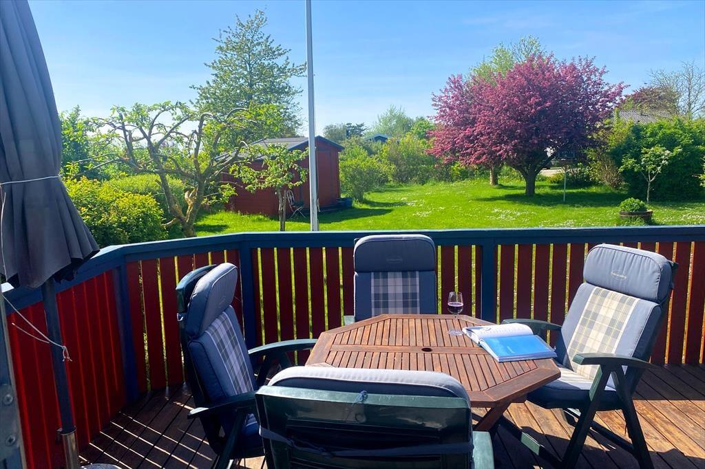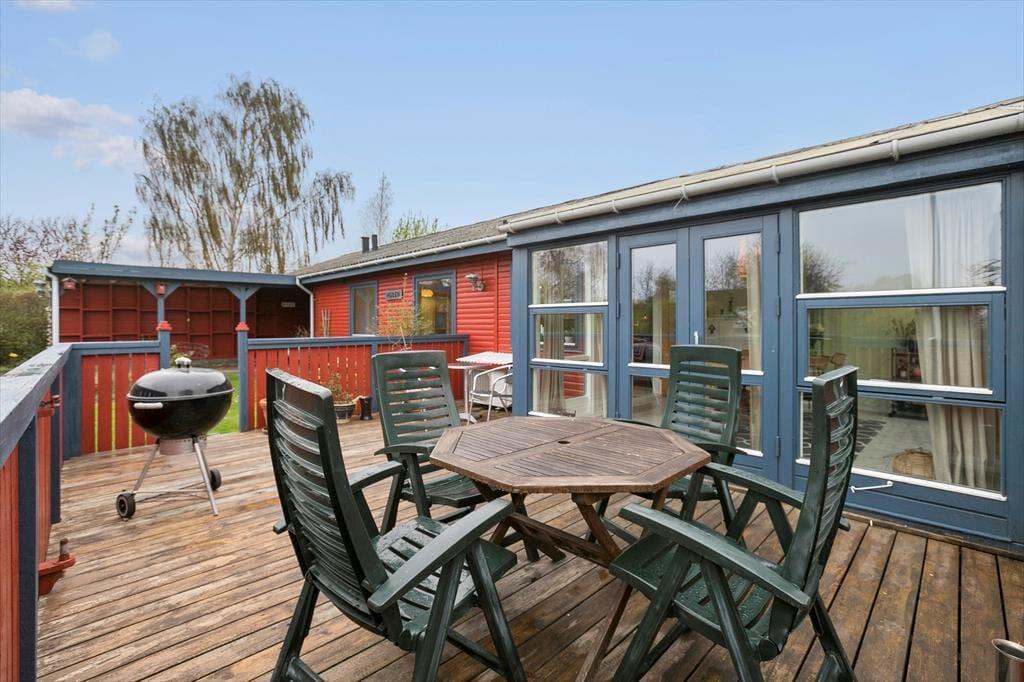 Huset har en 1.130 m2 stor grund, med en ugeneret have, en vestvendt afskærmet Træterrasse som inviterer til total afslapning. Desuden er der en åben østvendt fliseterrasse hvor morgensolen kan nydes. Ved huset er der havemøbler, parasol, grill, bålfad og diverse spil