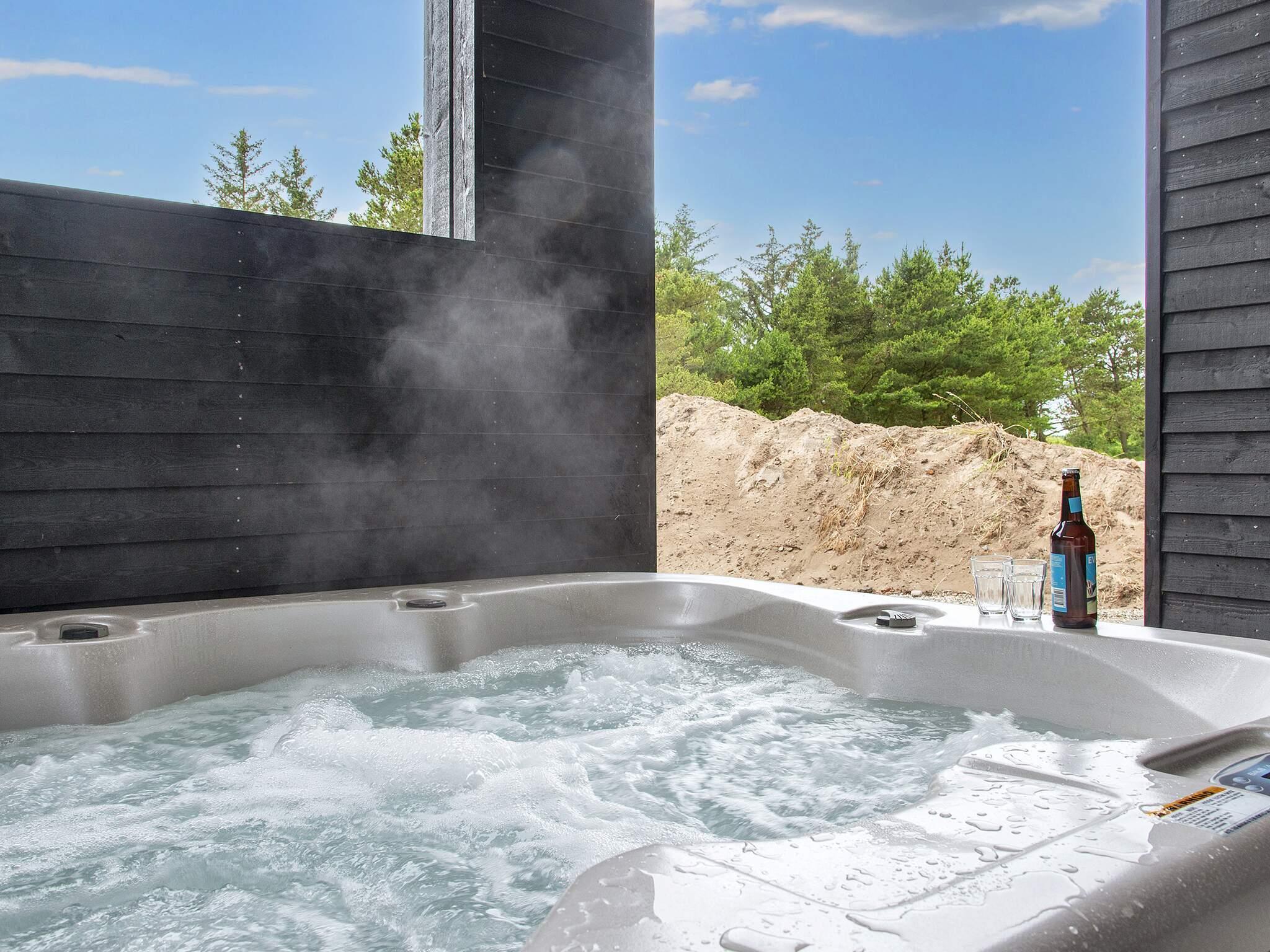 På husets ene terrasse er der indrettet et luksuriøst wellness-område under halvtag med stort spabad. Området er afskærmet for indsigt og indrettet med stil og klar til at nyde et glas bobler i spabadet. Det andet terrasseområde er indrettet med havemøbler. Der er privat parkering ved huset.