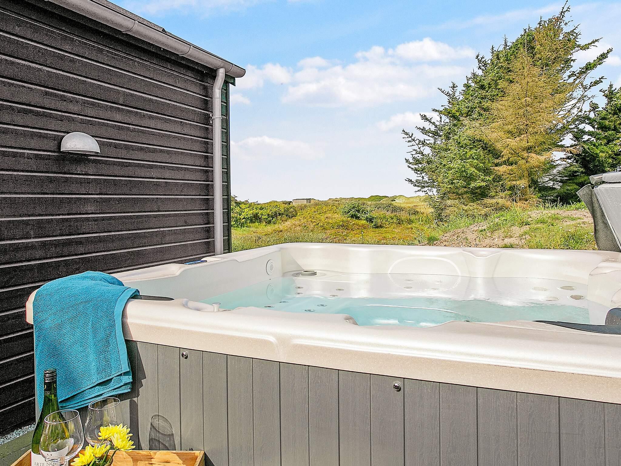 Fortsat fra poolområdet ud på terrassen finder I sommerhusets helt eget wellnessområde. Her kan du nyde kølige aftener i terrassens udendørs spabad og derefter varme dig i den udendørs sauna.