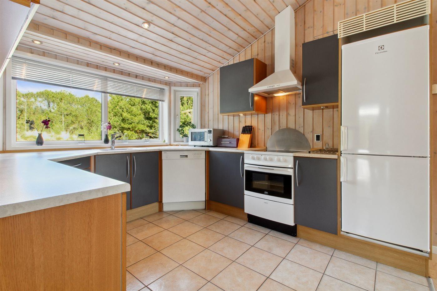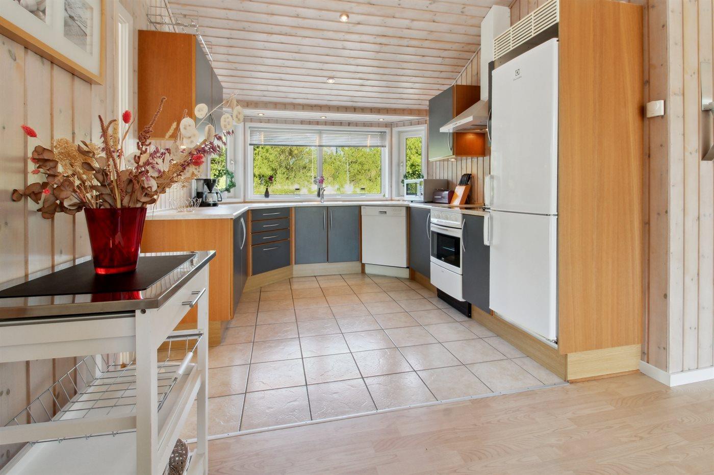 Køkkenet er udstyret med 1 køleskab. Der er 4 keramiske kogeplader, varmluftovn, mikrobølgeovn samt opvaskemaskine Der er gulvvarme i køkkenet.