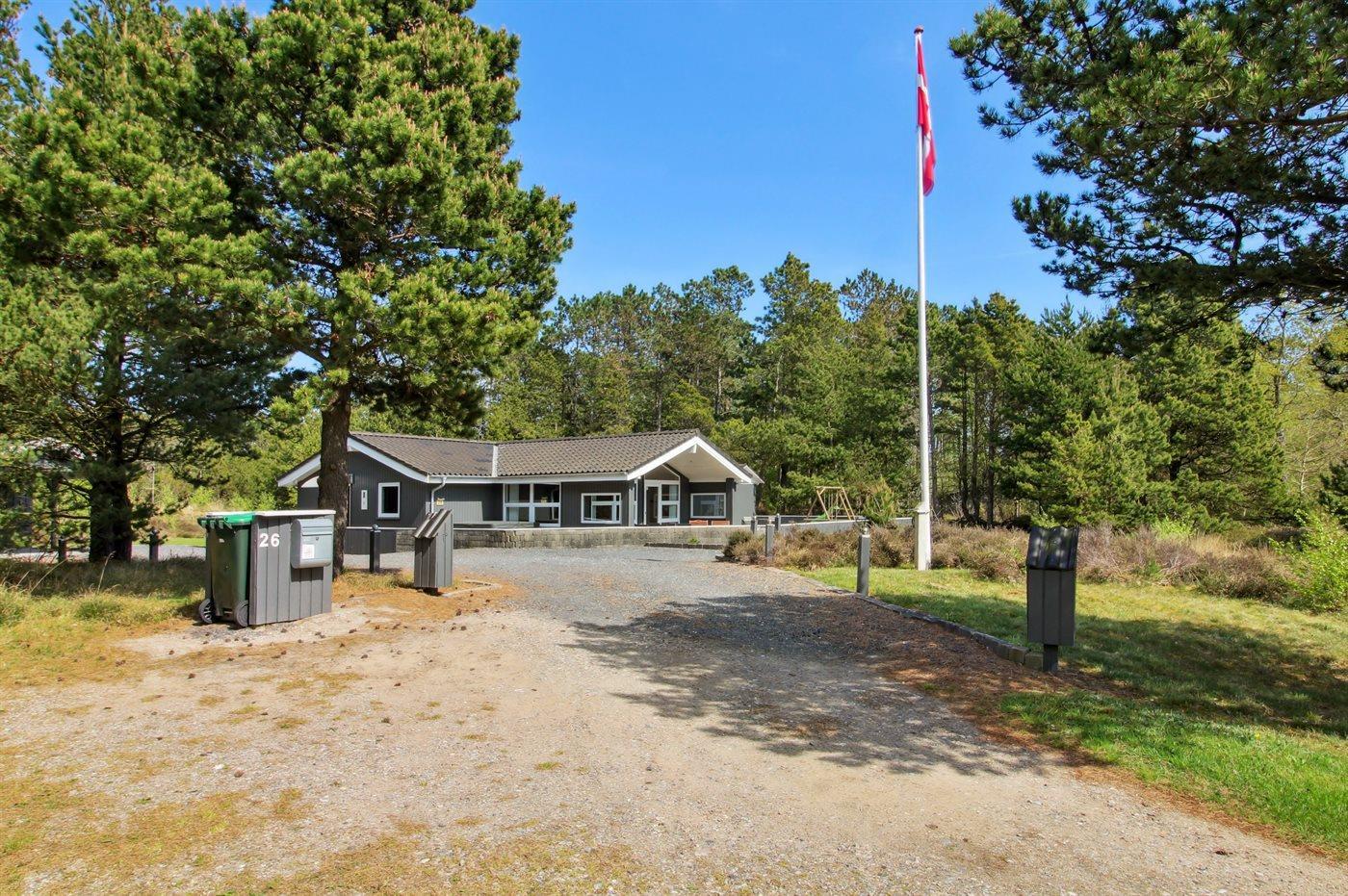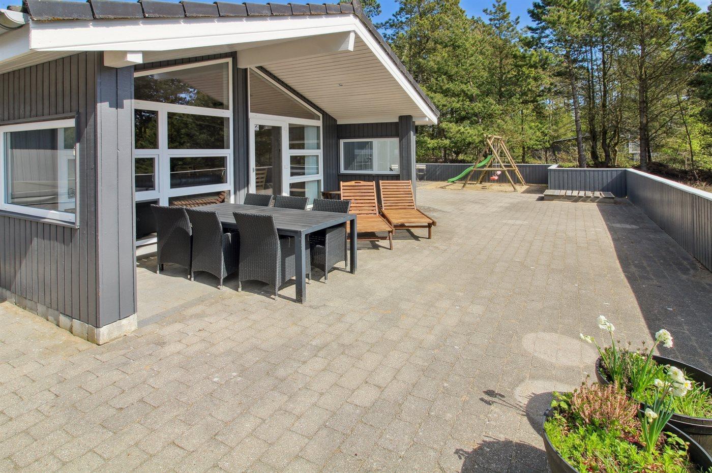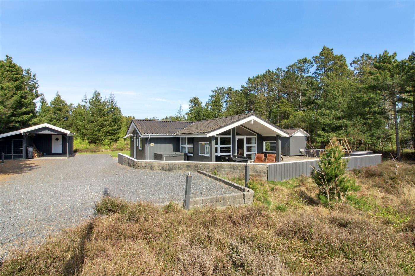 Huset er opført på en stor lyngklædt grund, delvist omgivet af lægivende beplantning, som sørger for ro og privatliv. Den rummelige terrasse skaber perfekte rammer for udendørsliv i alle døgnets lyse timer.