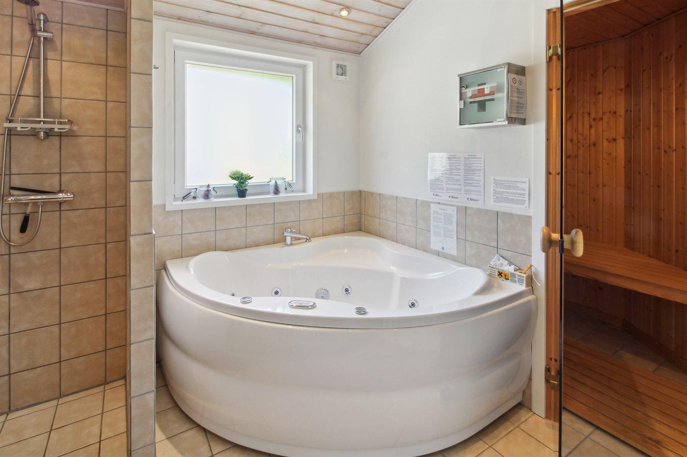 Der er 1 badeværelse med bruseniche og 1 toilet.. Der er gulvvarme på 1 badeværelse. I saunaen er der mulighed for afslapning.
