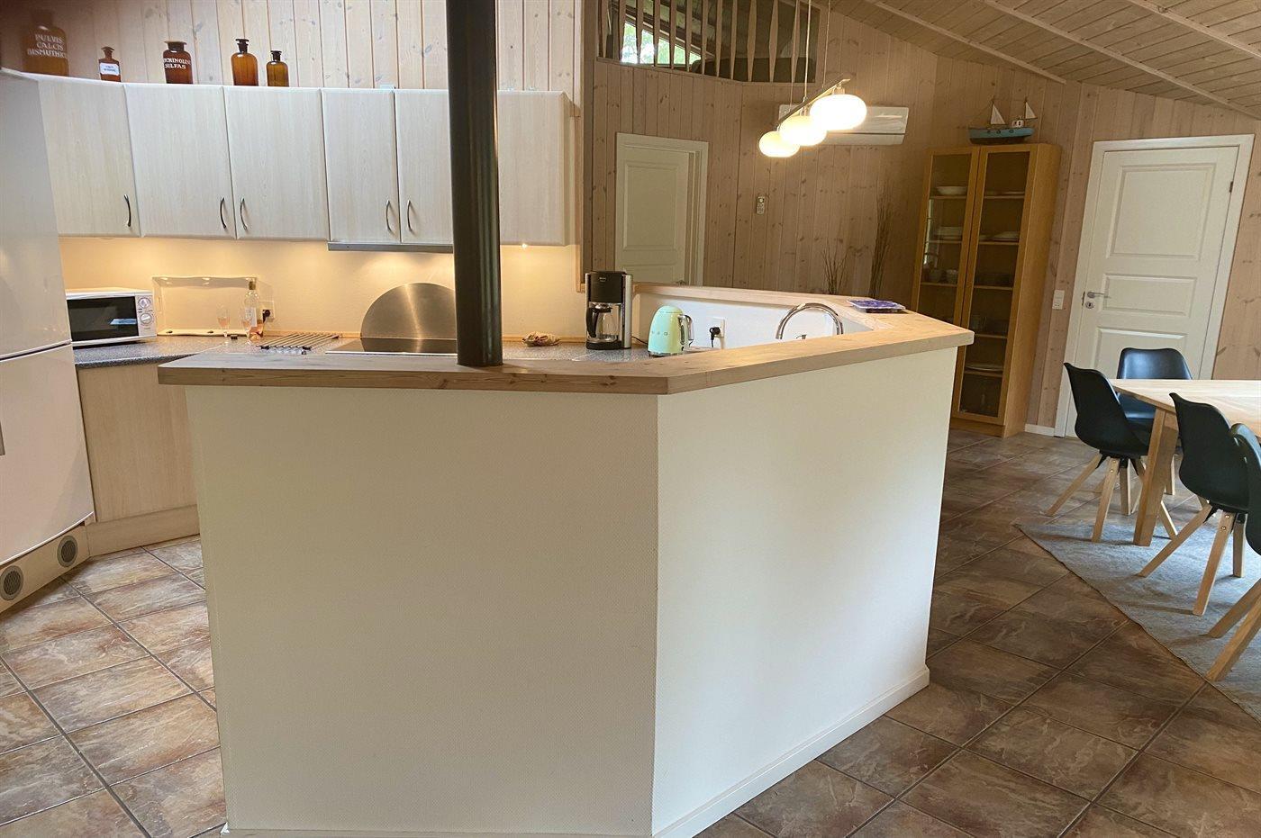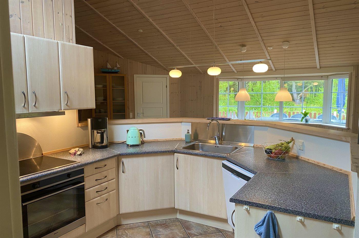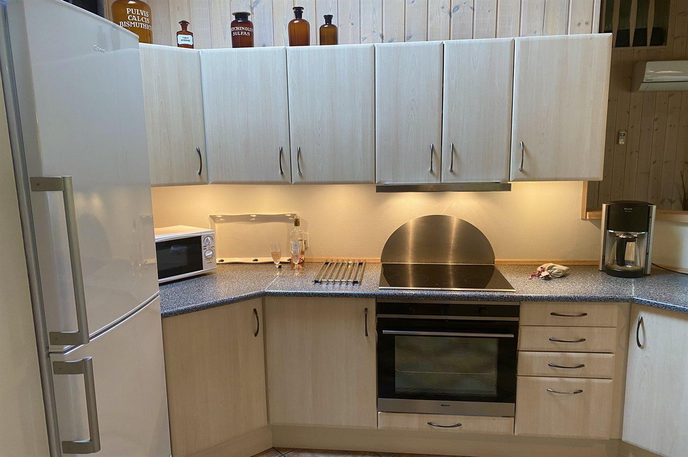 Køkkenet er udstyret med 1 køleskab. Der er 4 keramiske kogeplader, varmluftovn, mikrobølgeovn samt opvaskemaskine Der er gulvvarme i køkkenet.