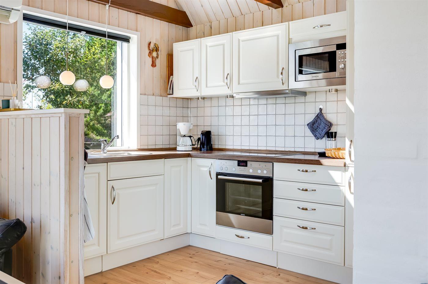 Køkkenet er udstyret med 1 køleskab. Der er 4 keramiske kogeplader, varmluftovn, mikrobølgeovn samt opvaskemaskine.