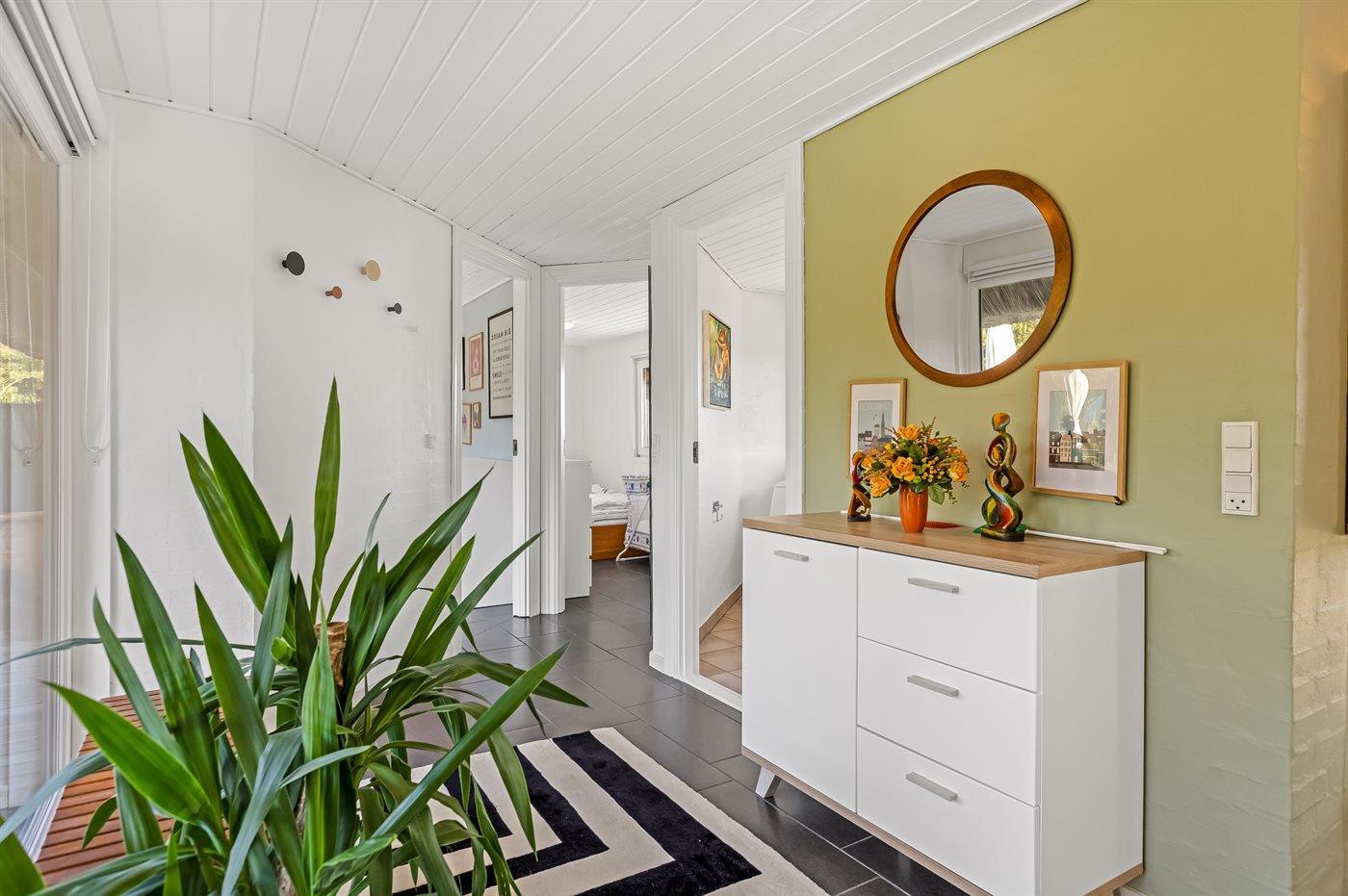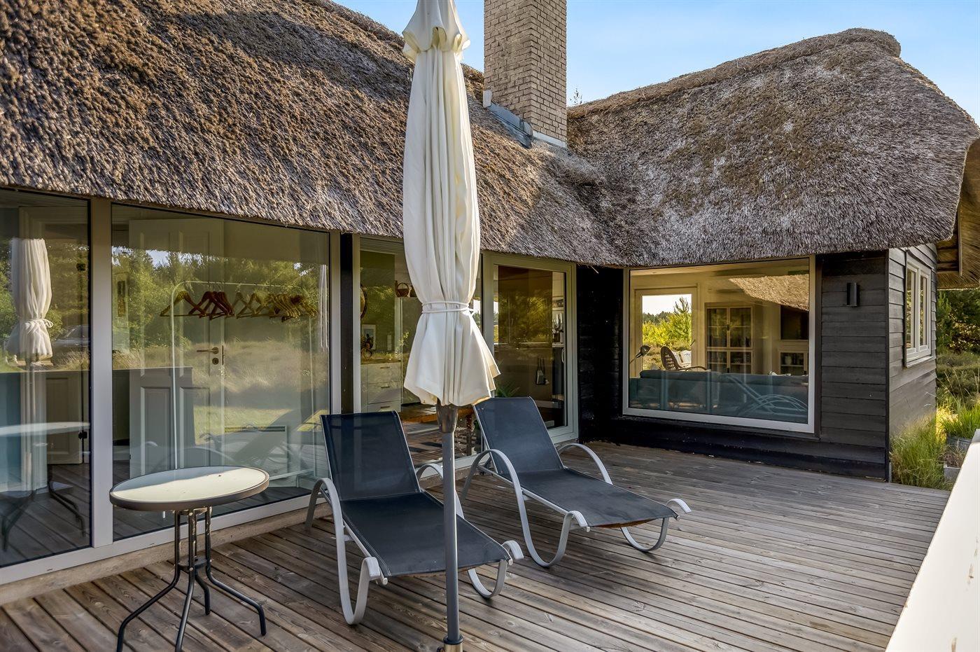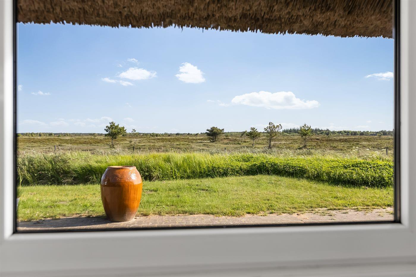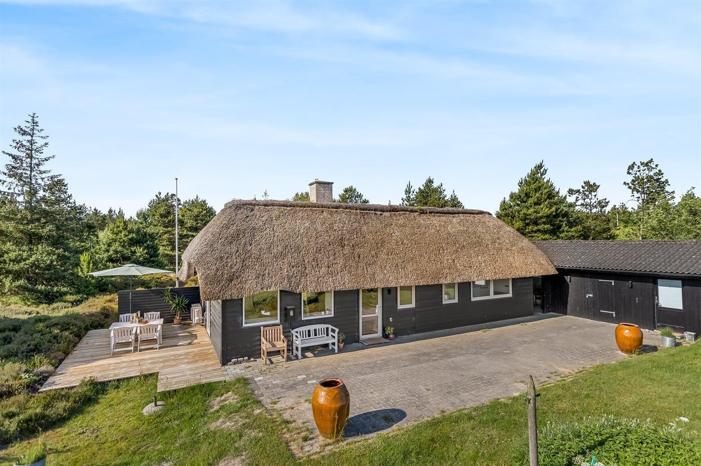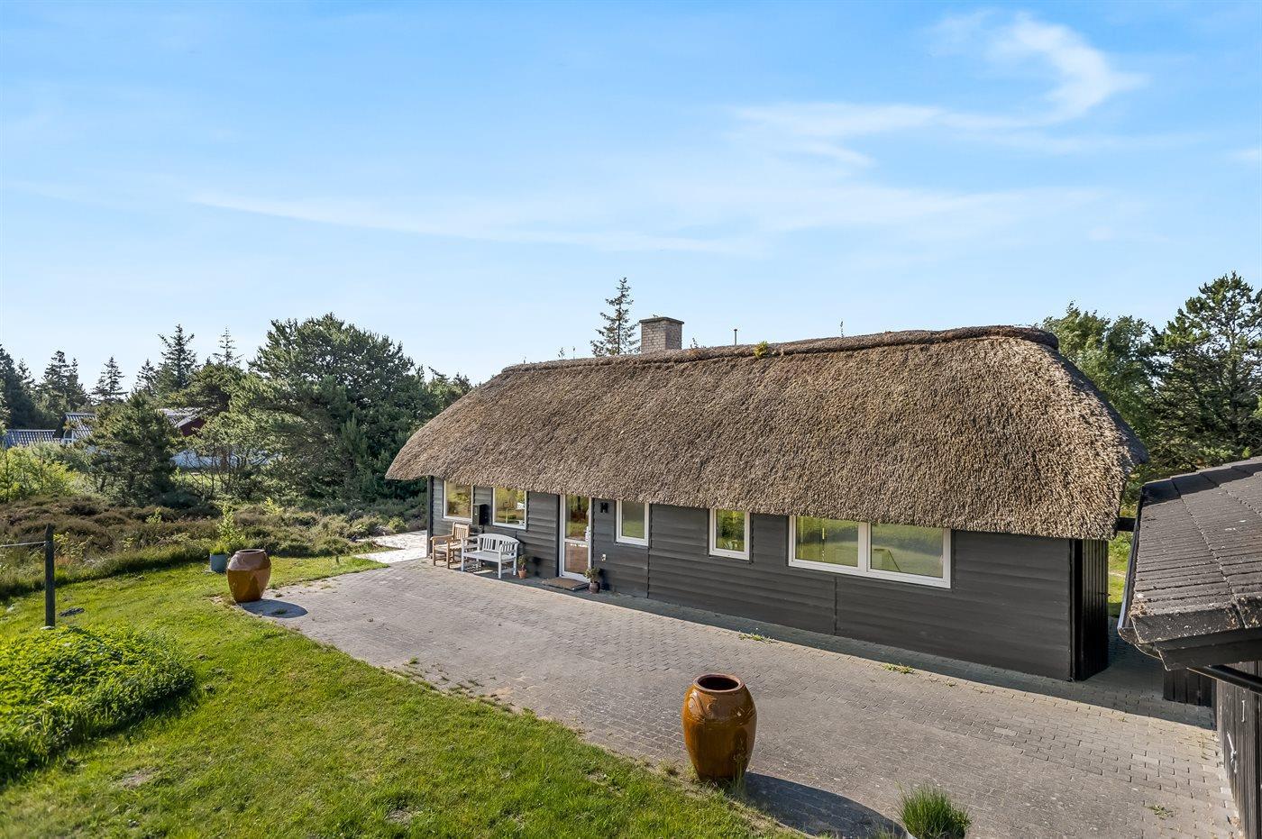 Et sommerhus med stråtag beliggende på en stille vej i Kongsmark - med udsigt til de fredede arealer med sit rige dyreliv.