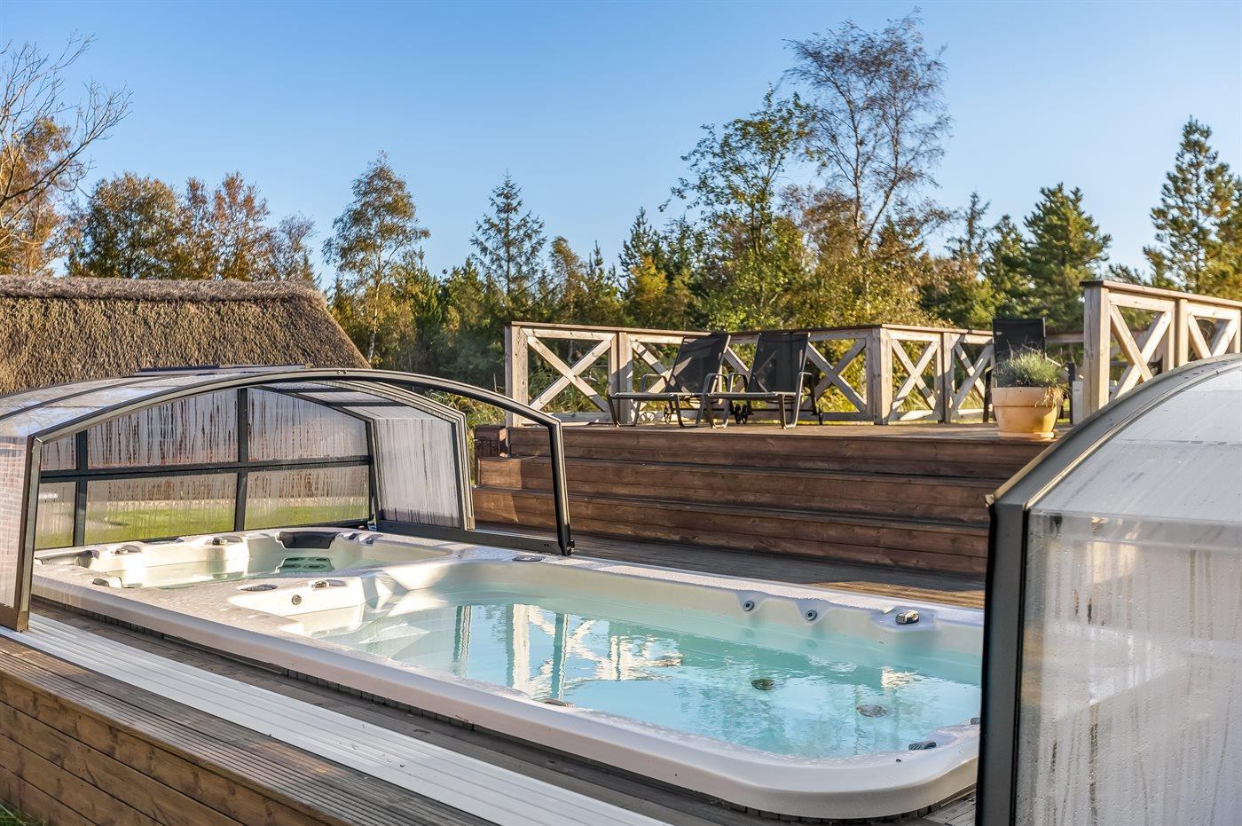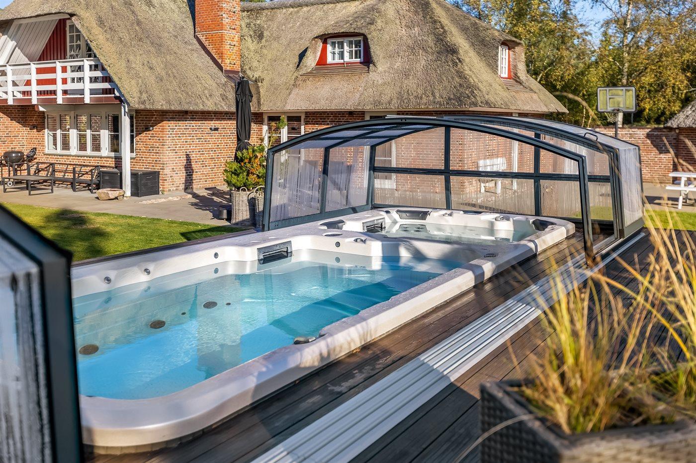 Der er mulighed for afslapning i udendørs swimspa til 5 personer. Et kombineret svømmebassin og spabad med mulighed for at spille sin egen musik i det indbyggede bluetooth musikanlæg til sin udendørs wellness. Motionér med svømmetræning i 26,5 grader varmt vand. Efter træningen kan der afsluttes med skøn vandmassage i spabadets op til 38 grader varme bobler (spaen står med en grundtemperatur på 26,5 grader). Det separate spabad rummer 1 liggeplads og 4 siddepladser. For at give optimal vandstrøm til svømmetræningen, er der installeret ekstra dyser og pumpekraft. Dermed bestemmer man selv hvor kraftig en vandstrøm man kan eller vil svømme imod.
