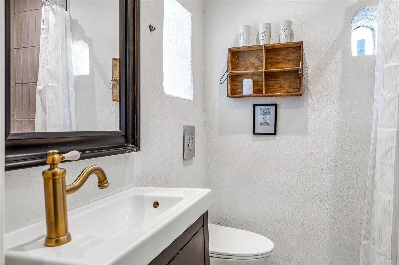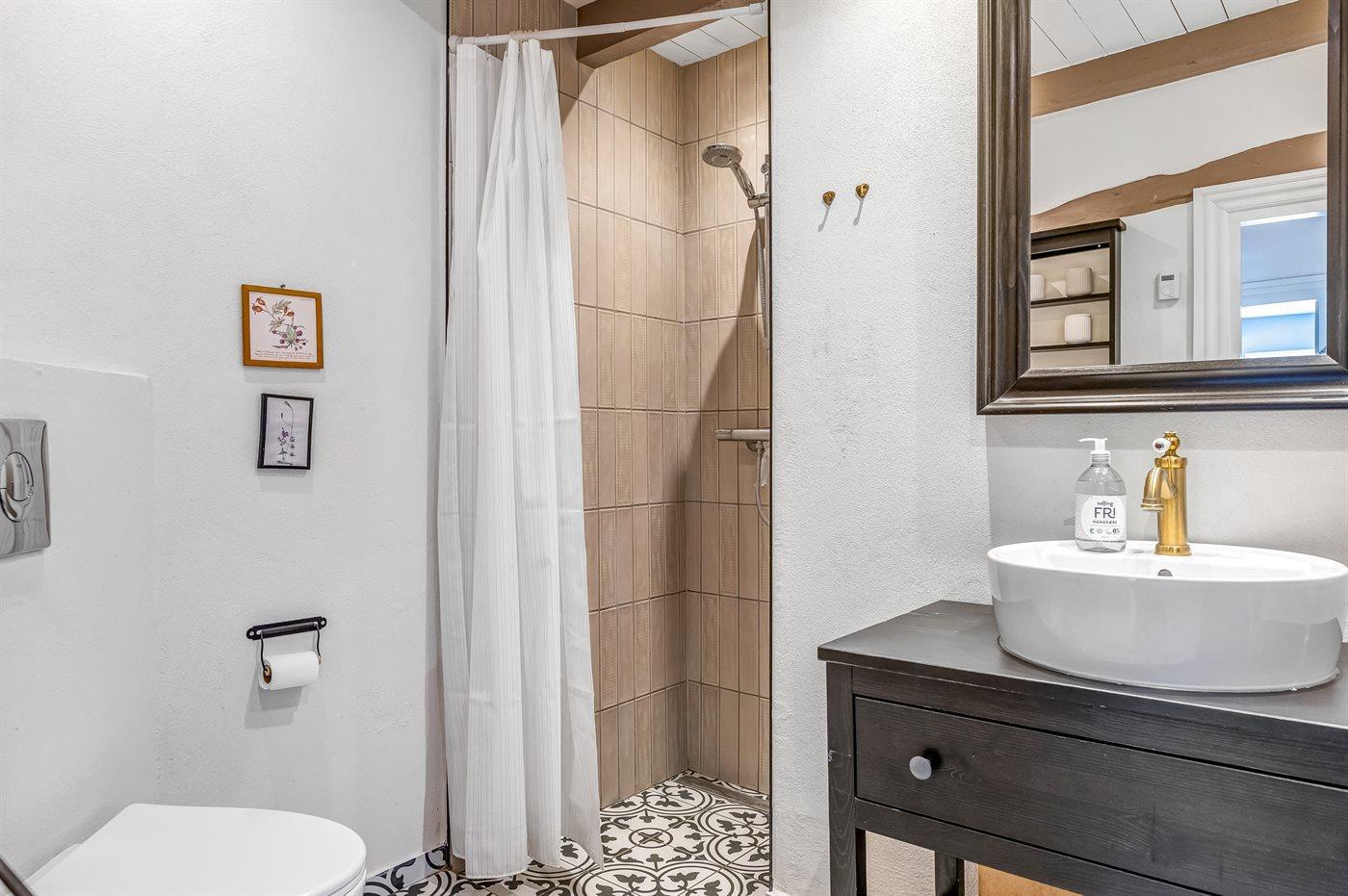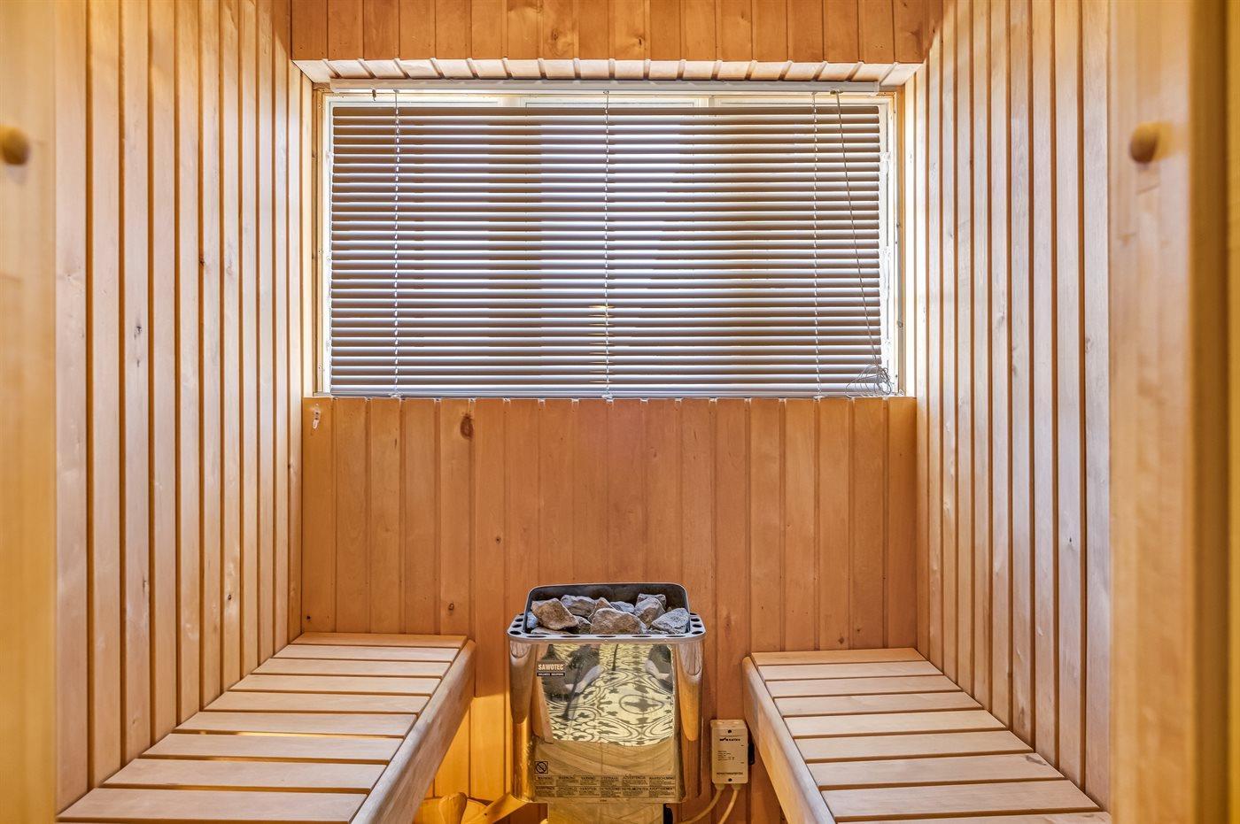 Der er 3 badeværelser med bruseniche og toilet, alle med gulvvarme. I det ene badeværelse der mulighed for afslapning i den tilstødende sauna.