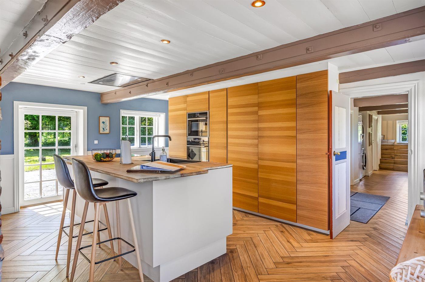 Køkkenet ligger i åben forbindelse med spisestuen og er udstyret med 2 køleskabe, 4 induktions-kogeplader, 2 varmluftovne, mikrobølgeovn samt opvaskemaskine. Ferieboligen har desuden vaskemaskine og tørretumbler samt fryser med kapacitet på 60 liter.