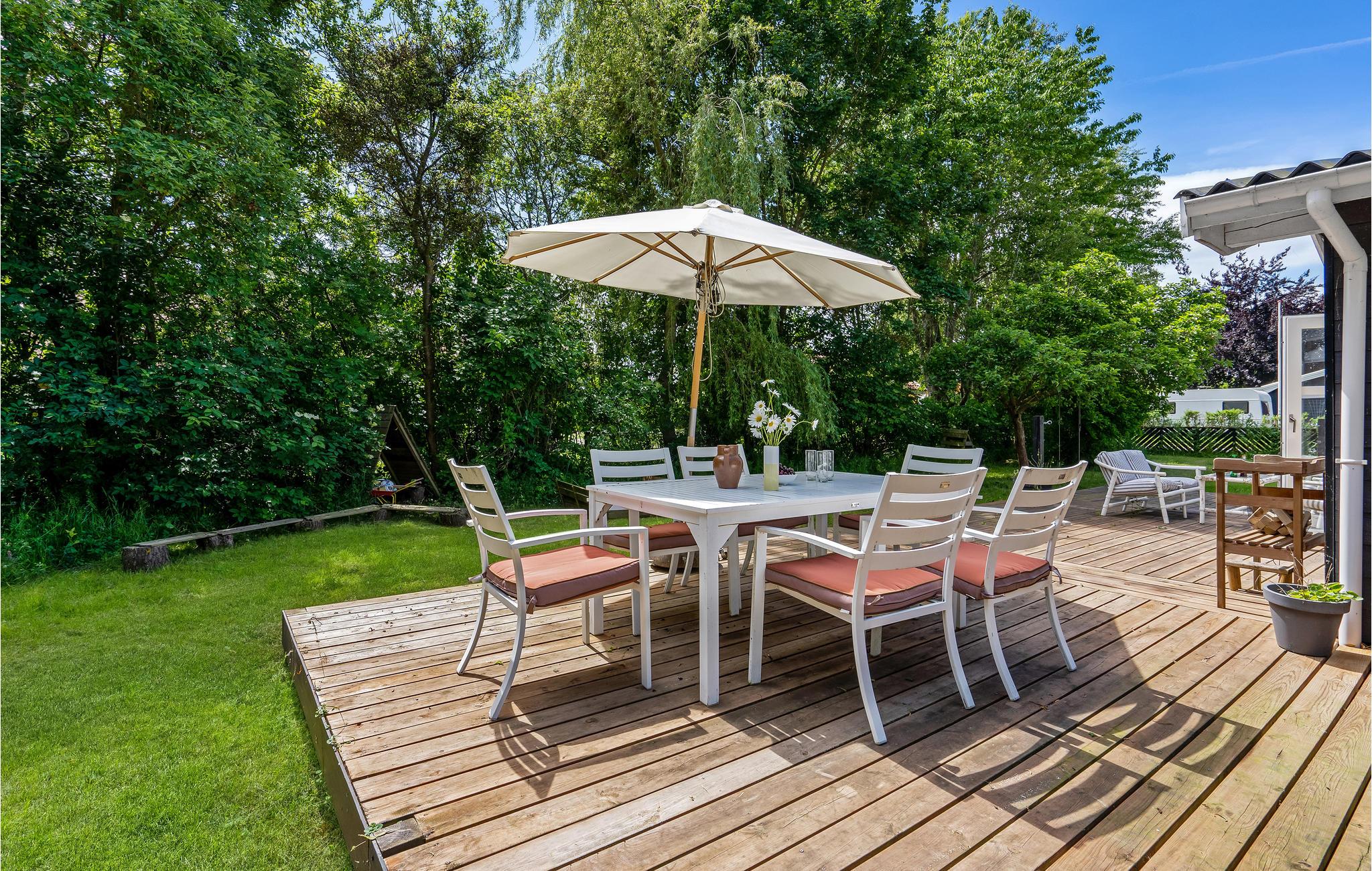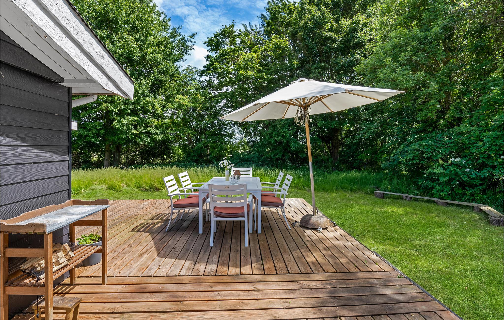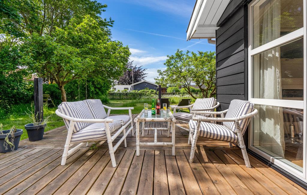 Fra stuen træder I ud på den store terrasse med flere gode kroge med sol og skygge, hvor I kan slappe af og have det rart. Læn jer tilbage i liggestolene med en kold forfriskning, mens børnene og jeres hund leger på grunden. De små får et godt spillerum, hvor de kan vælge mellem gynger, sandkasse eller gemmeleg i hjørnerne.