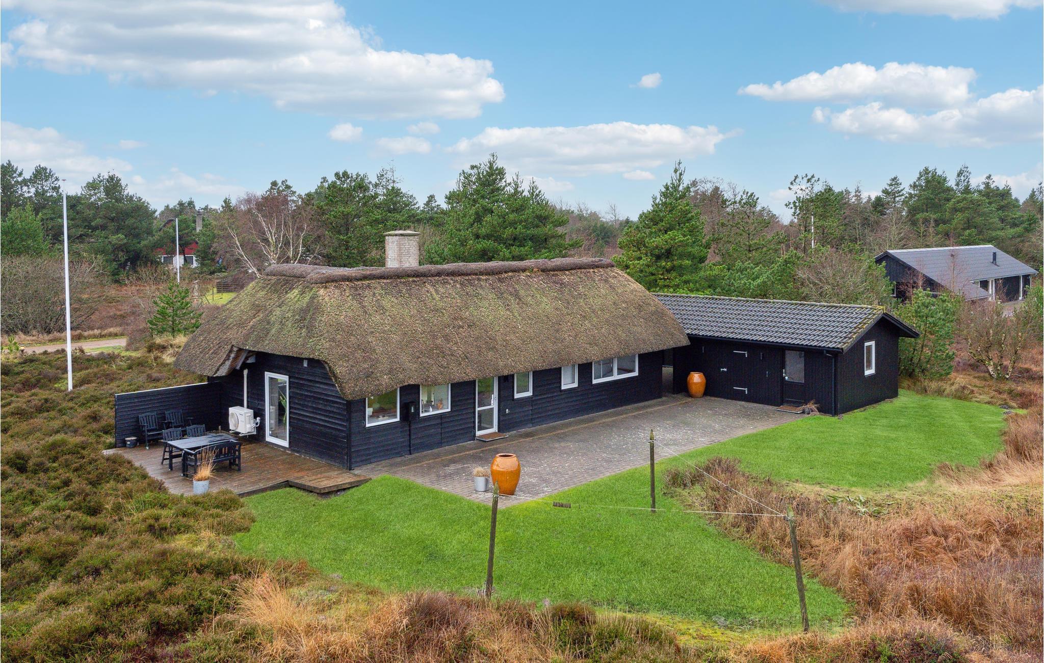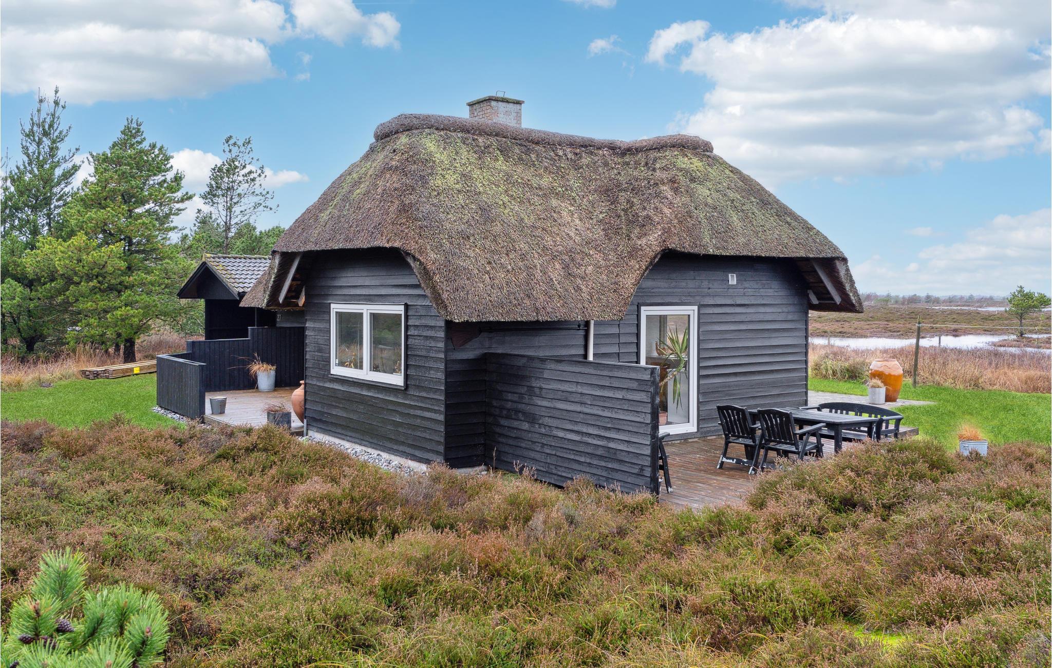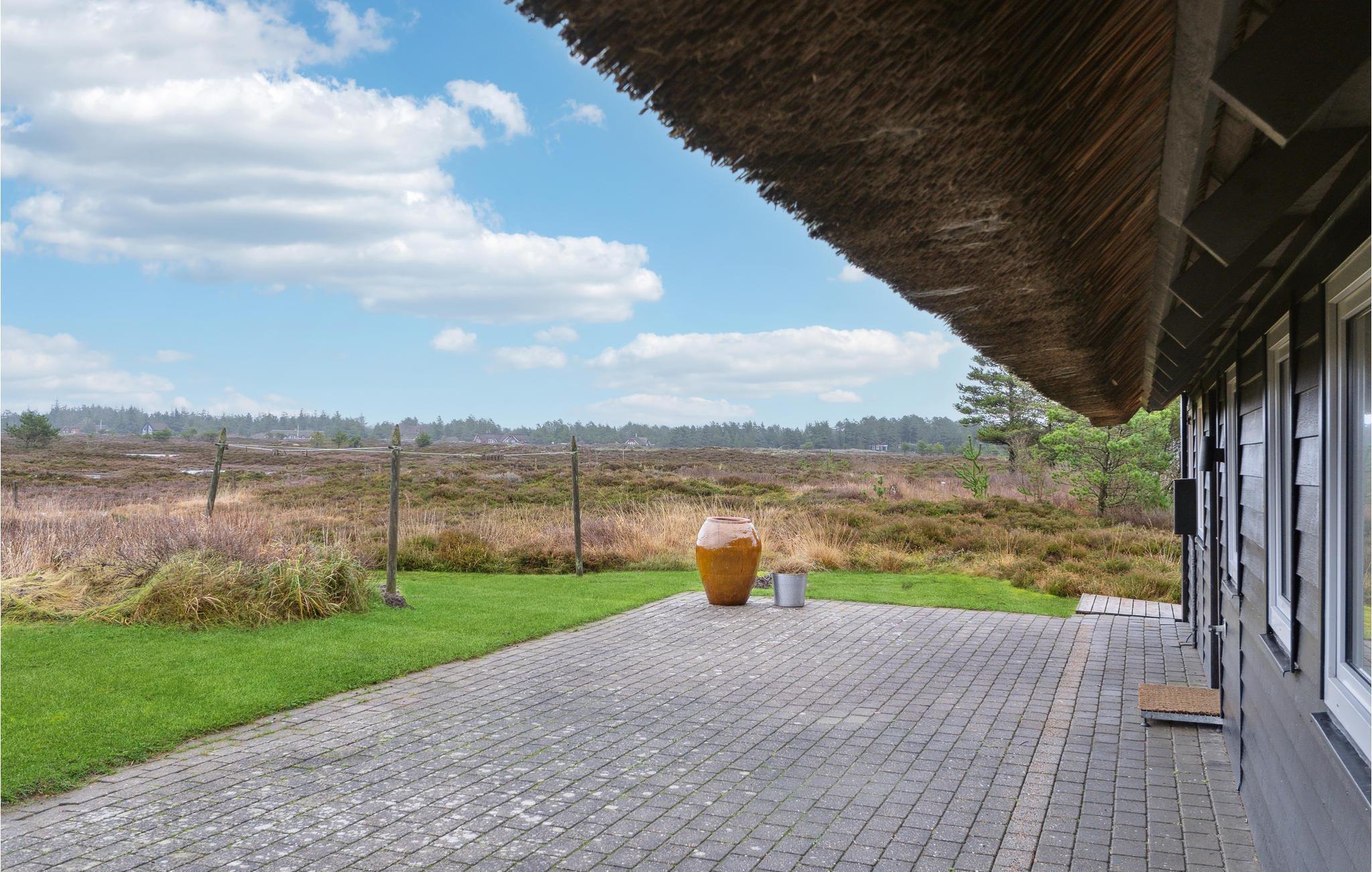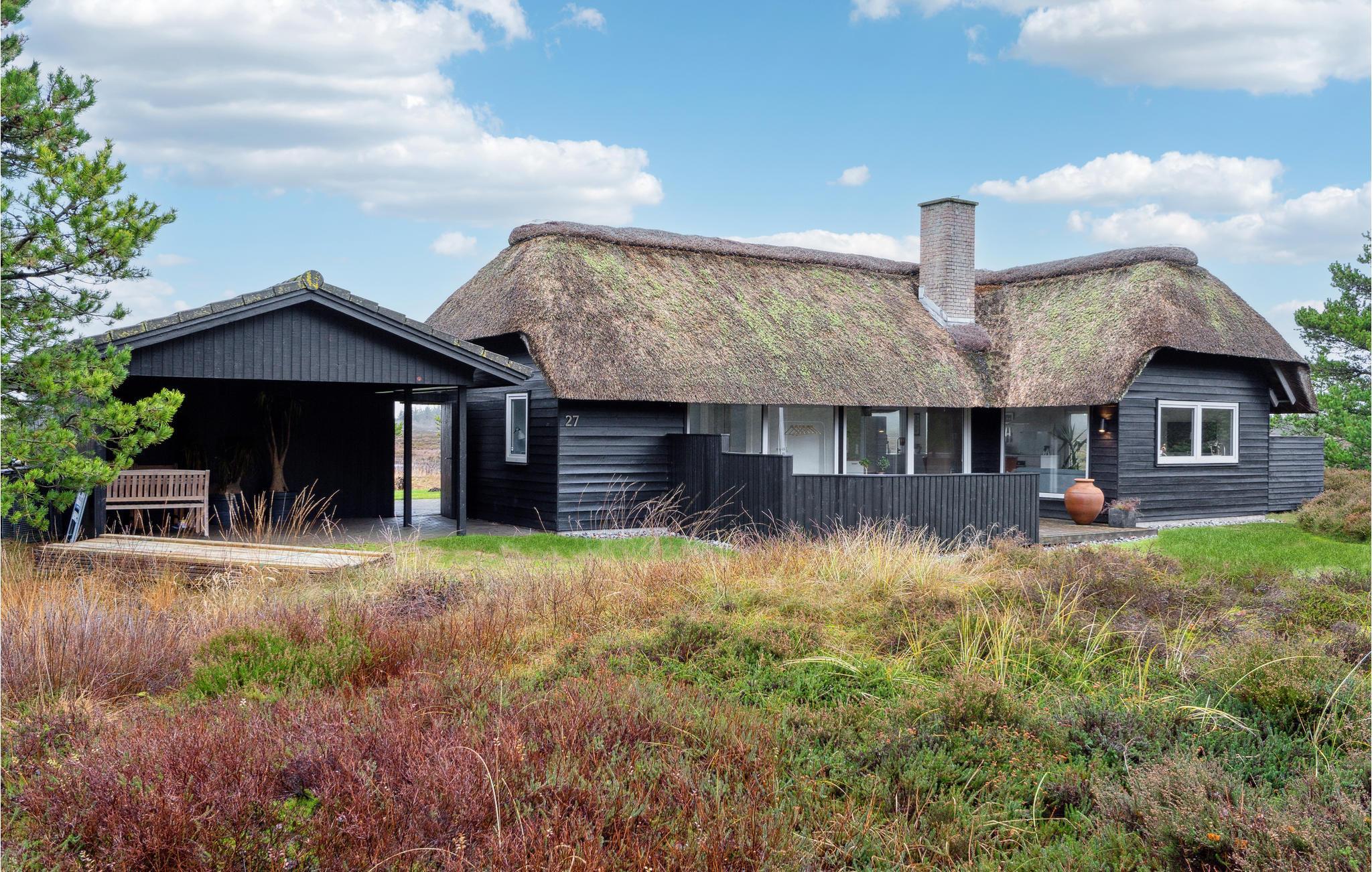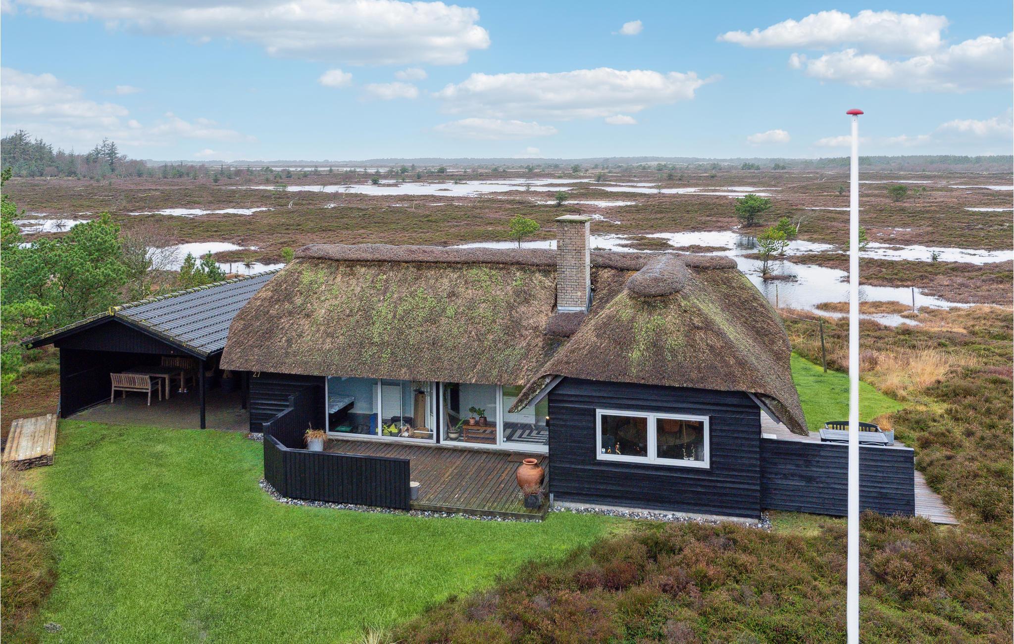 Hyggeligt stråtagshus på Rømø med panoramaudsigt over heden og søer, ideelt til afslapning og naturoplevelser.
