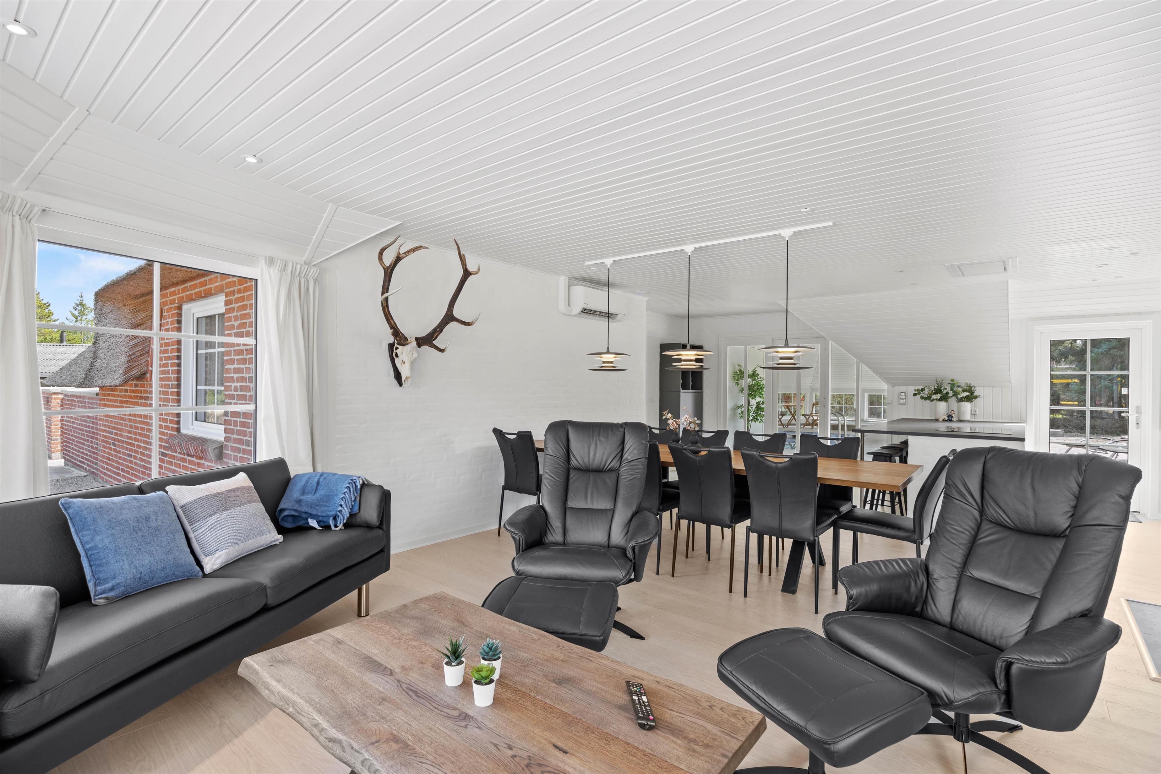 Der er masser af plads til familielivet i sommerhusets store, åbne køkken/alrum. Et velfungerende køkken, et langt spisebord hvor alle kan samles og et hyggeligt sofahjørne i karnappen, hvor lysindfaldet er så smukt! Spil brætspil, lad børnene tegne omkring spisebordet, mens der laves mad. Efter aftensmaden kan I samles i sofaen til filmhygge og tænde op i brændeovnen på de køligere dage.