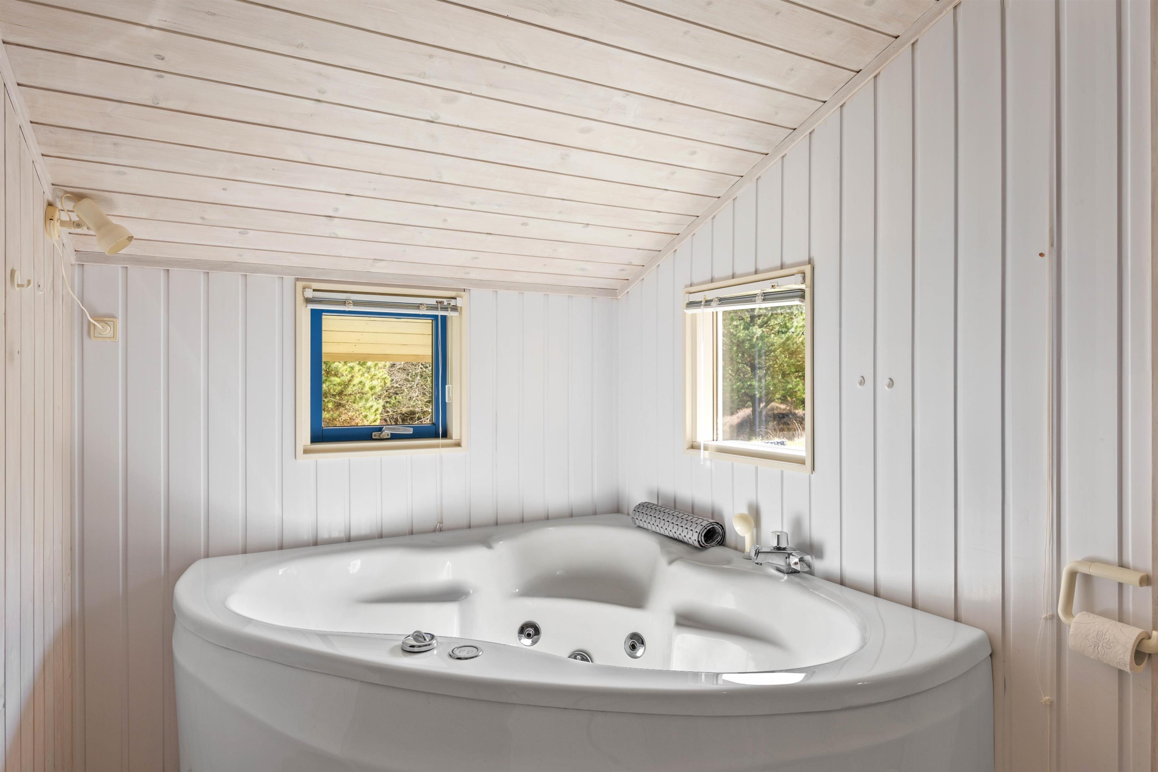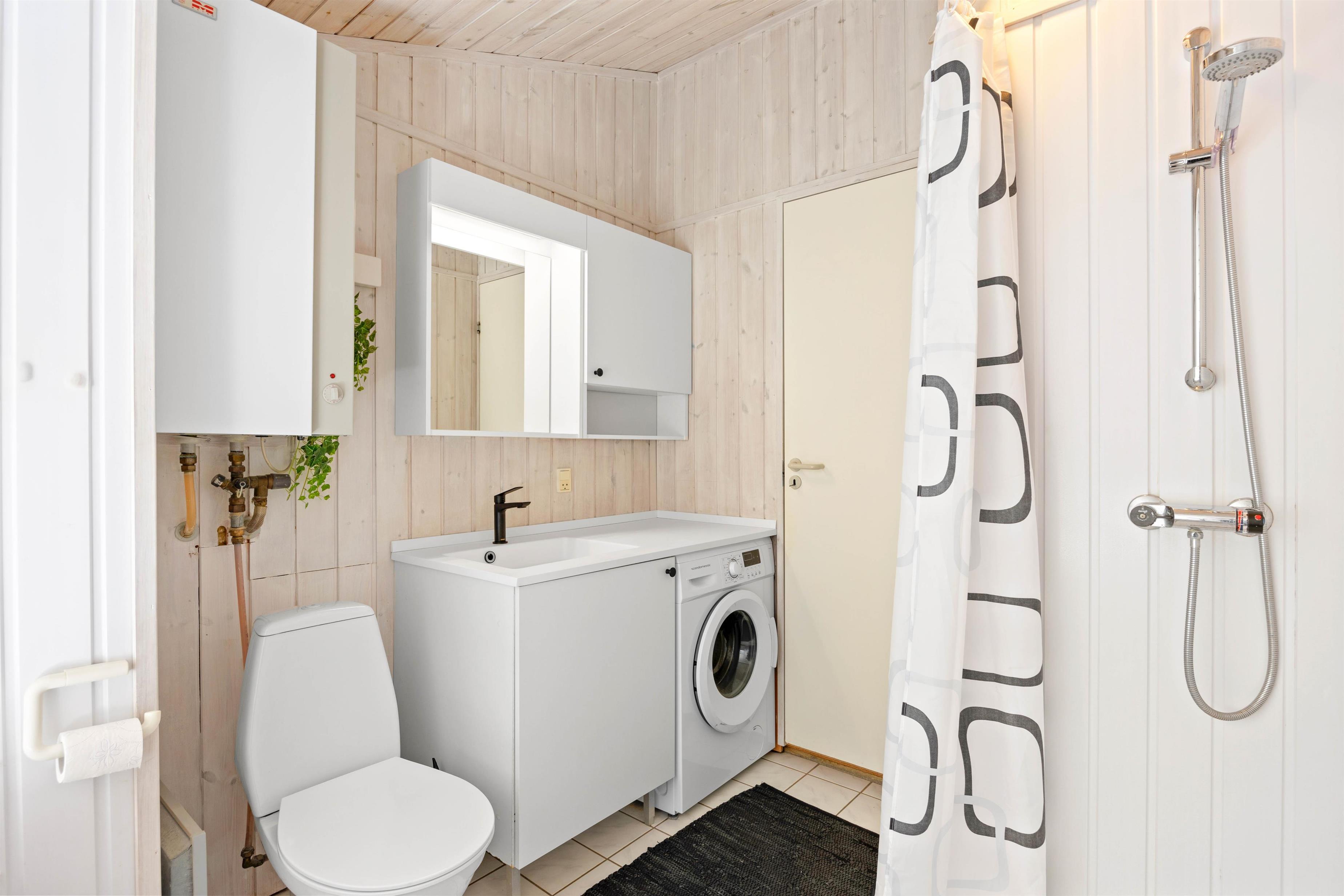 På badeværelset er der installeret gulvvarme, så I ikke fryser tæerne om morgenen. Også her finder I sauna og spaen, hvor I for alvor kan slappe helt af. Få varmen, især efter en lang tur ved havet eller i skoven findes der intet bedre! Vaskemaskine har I også til rådighed under jeres ophold – særligt praktisk med småbørn eller håndklæderne blot skal opfriskes.