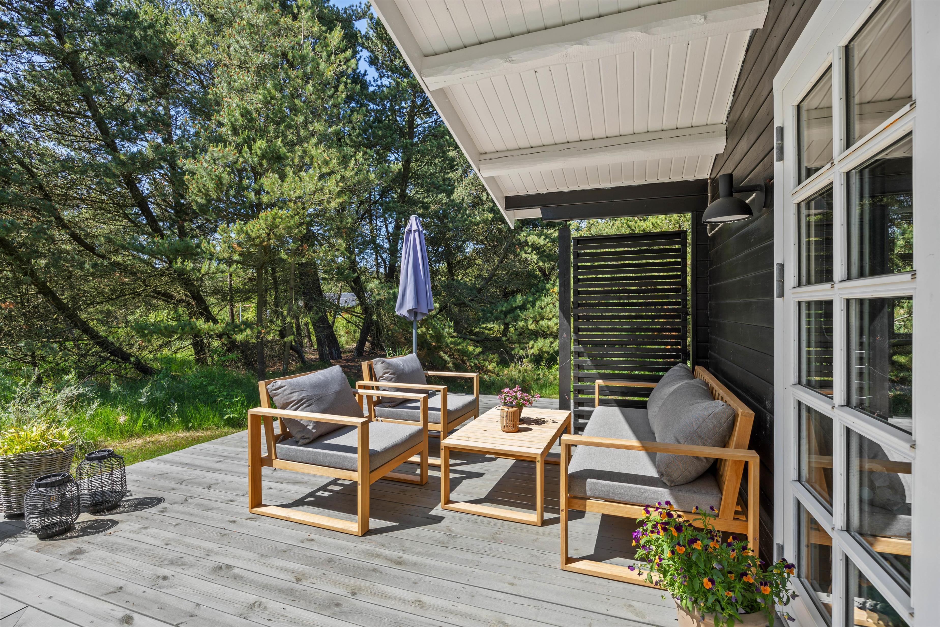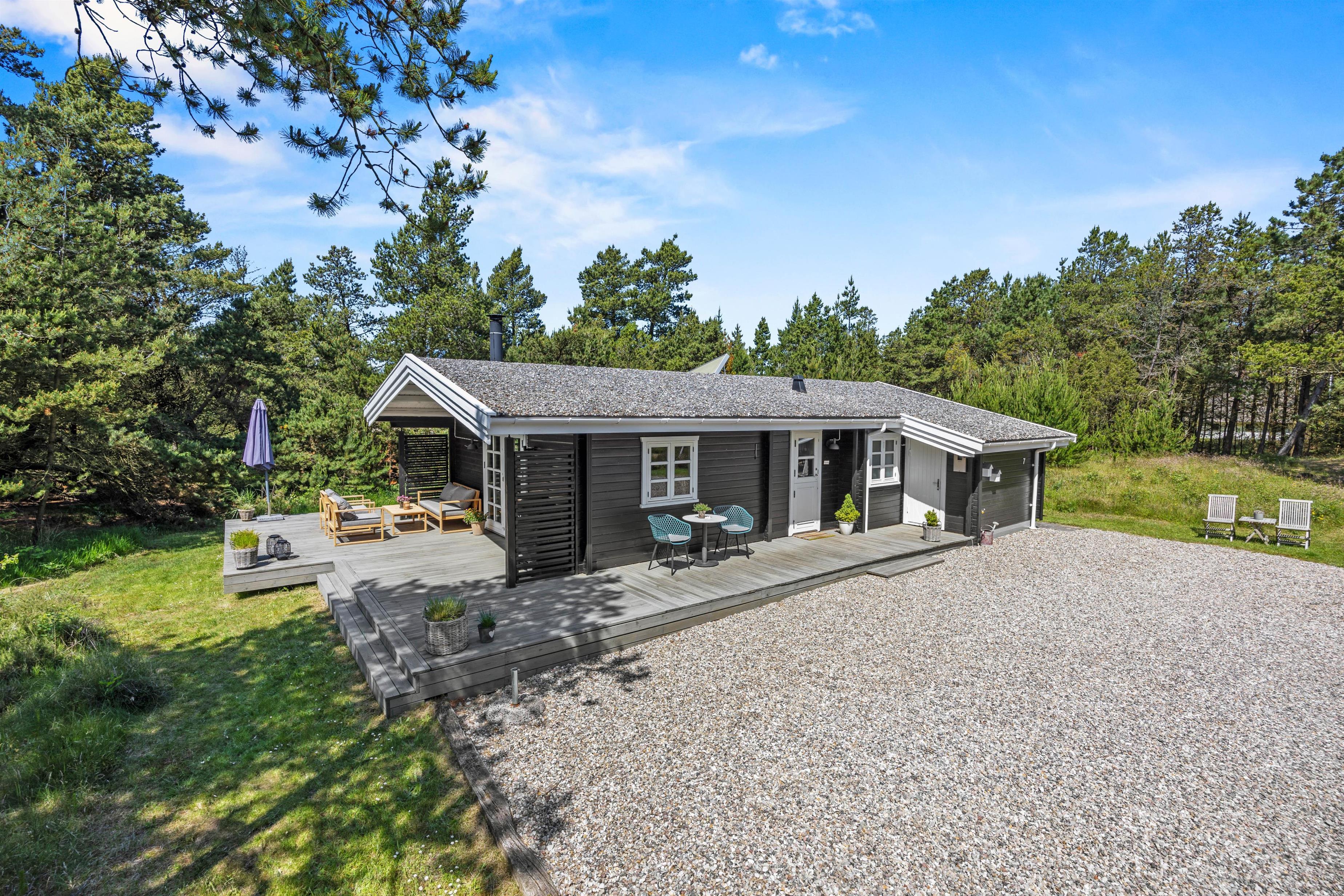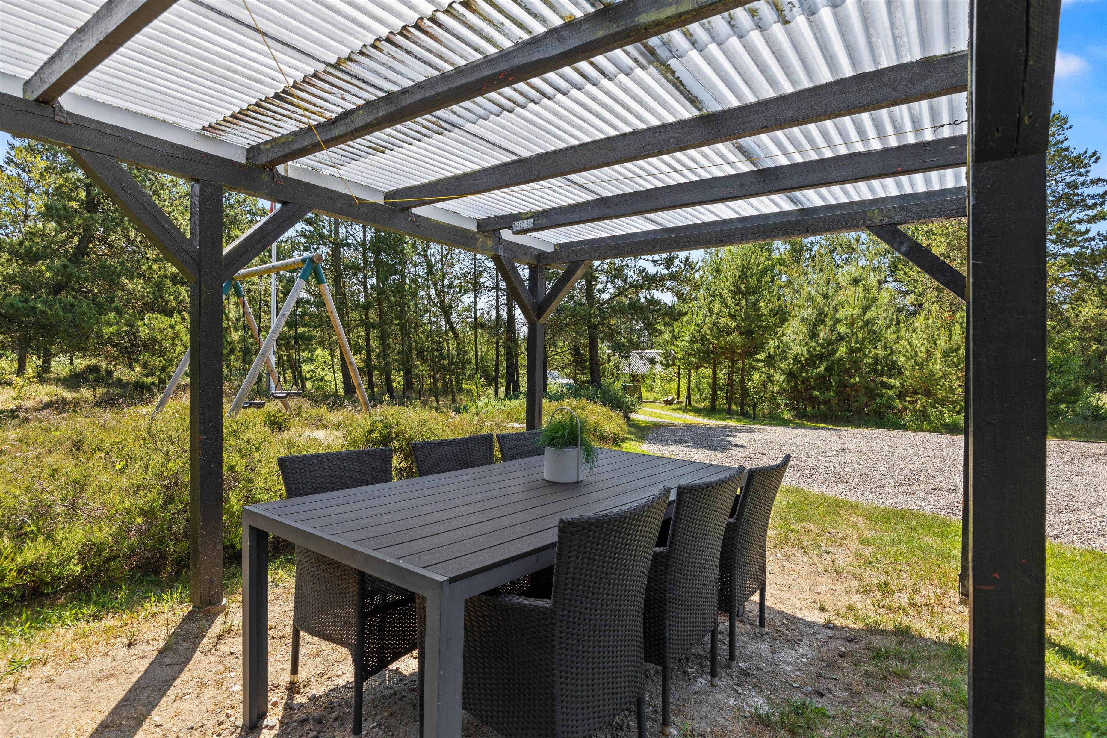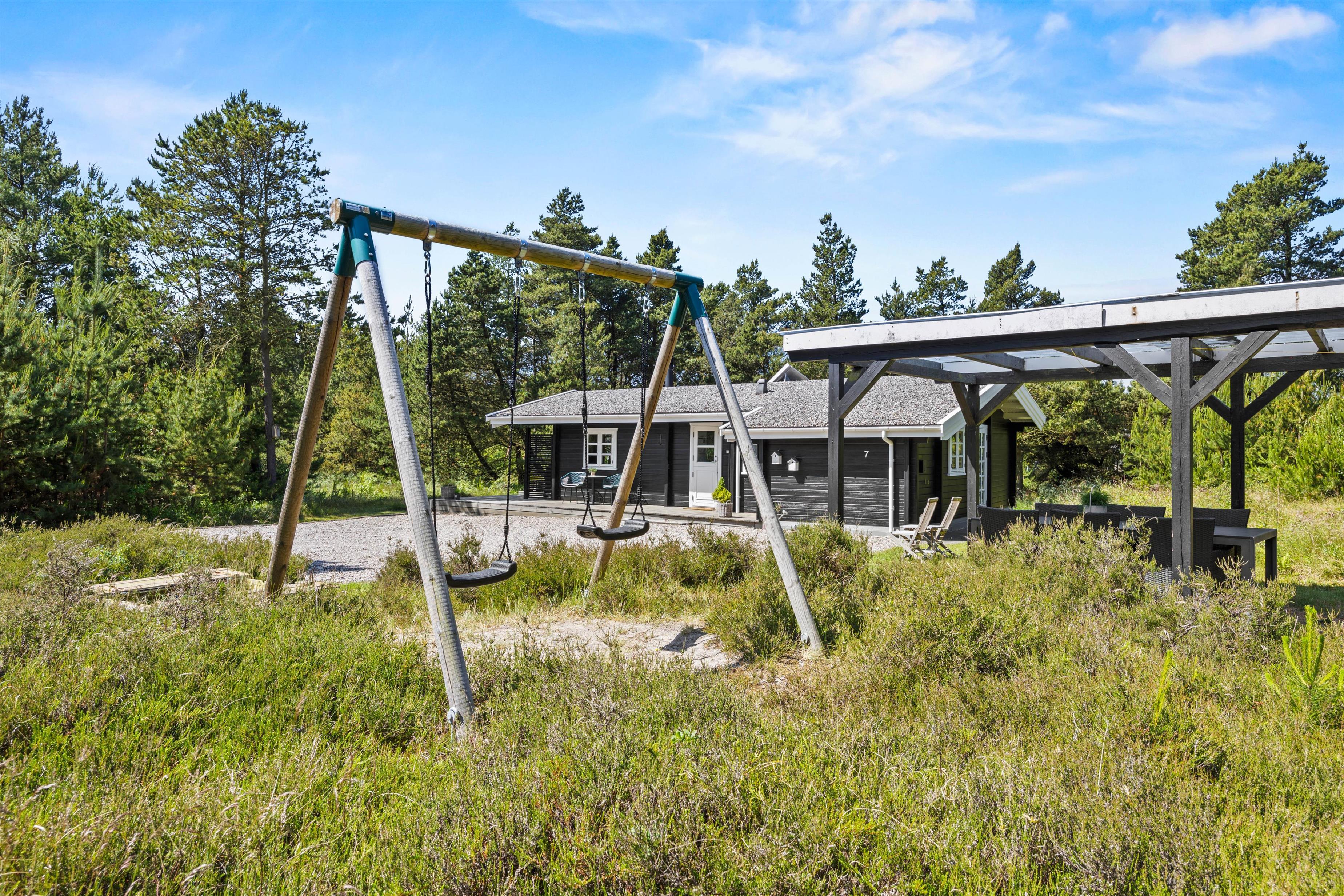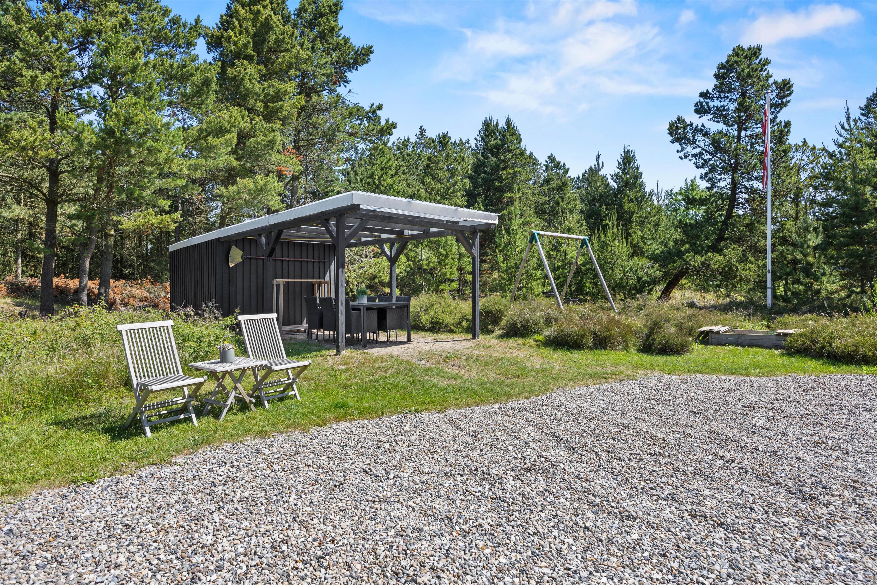 Udenfor venter en stor naturgrund på 2500 m² med både åben og overdækket terrasse, hyggelige havemøbler, parasol og gasgrill, så I kan nyde solrige dage og lune aftener i fred og ro. Børnene kan slå sig løs i sandkassen og gynge på gyngestativet, mens de voksne slapper af med en kop kaffe på terrassen og nyder udsigten over klitlandskabet og den åbene himmel. Der er også et redskabsrum til cykler og strandudstyr. Sommerhuset ligger idyllisk kun ca. 3,3 km fra både Kongsmarks brede sandstrand ved Vesterhavet og lokale indkøbsmuligheder. Området byder på fredelige omgivelser, så I let kan kombinere dage ved Vesterhavet med hyggelige gåture i naturen.