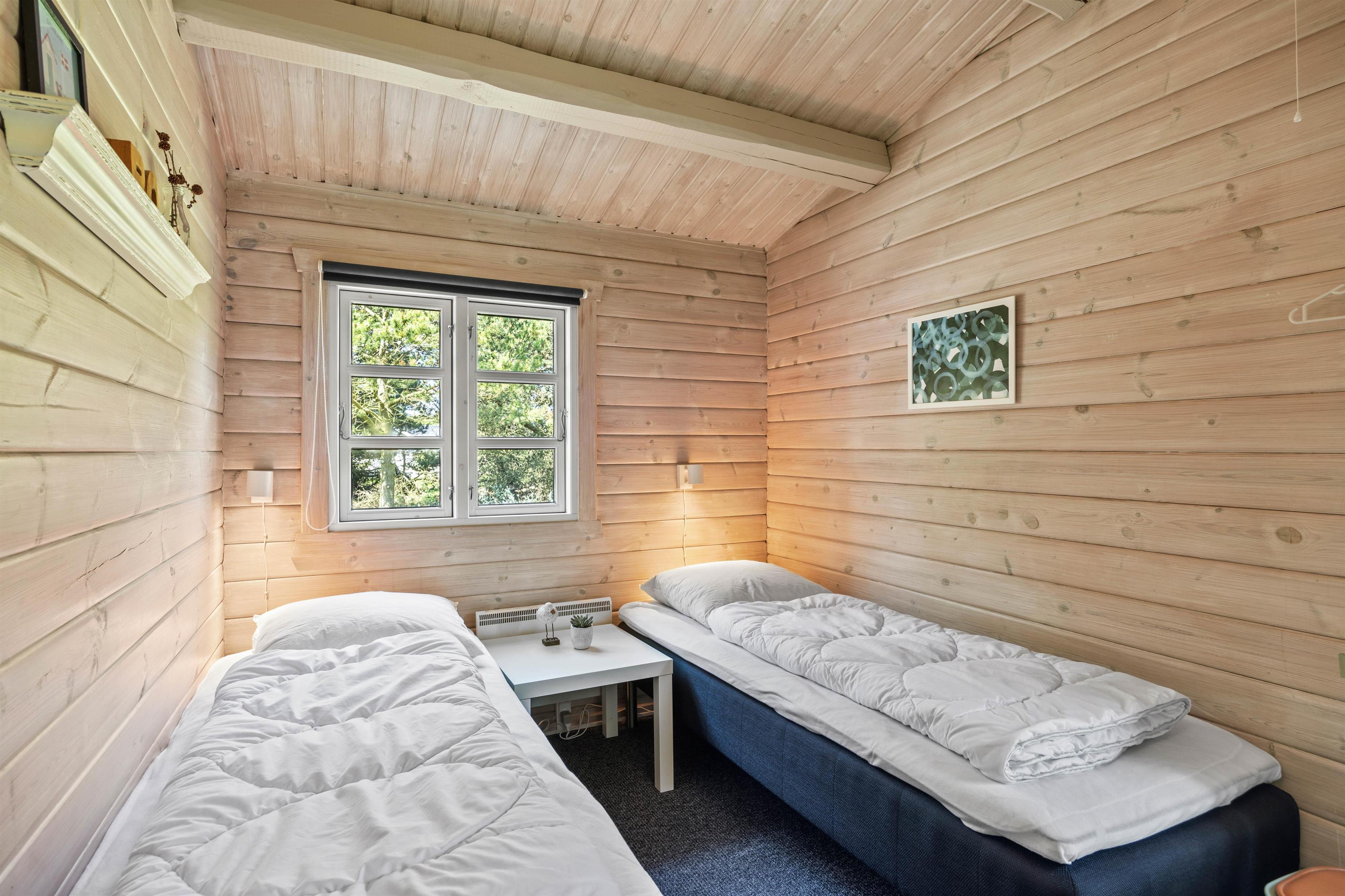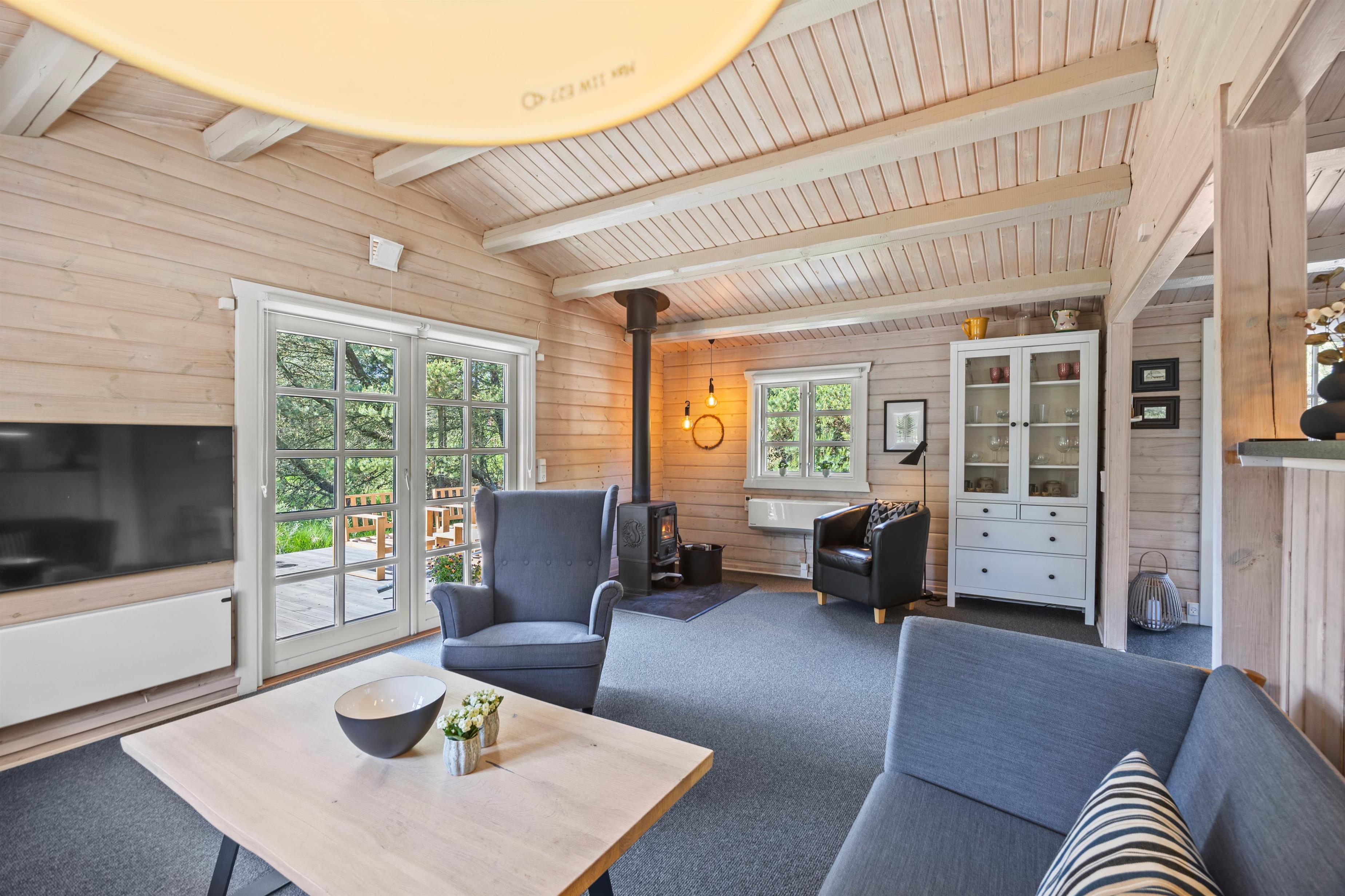 Det lyse opholdsrum er møbleret med sofa og fladskærms-tv, så hyggeaften kan nydes i ro og komfort. Den knitrende brændeovn bidrager til den hjemlige stemning, mens gratis fibernet sørger for, at I kan streame en film eller surfe på nettet i aftentimerne. Sommerhuset har 3 rummelige soverum – et med dobbeltseng og to med enkeltsenge – hvor der er plads til i alt 6 personer. Indretningen er hyggelig med bløde tæpper, varme farver og detaljer i træ, så I rigtig kan føle jer hjemme.