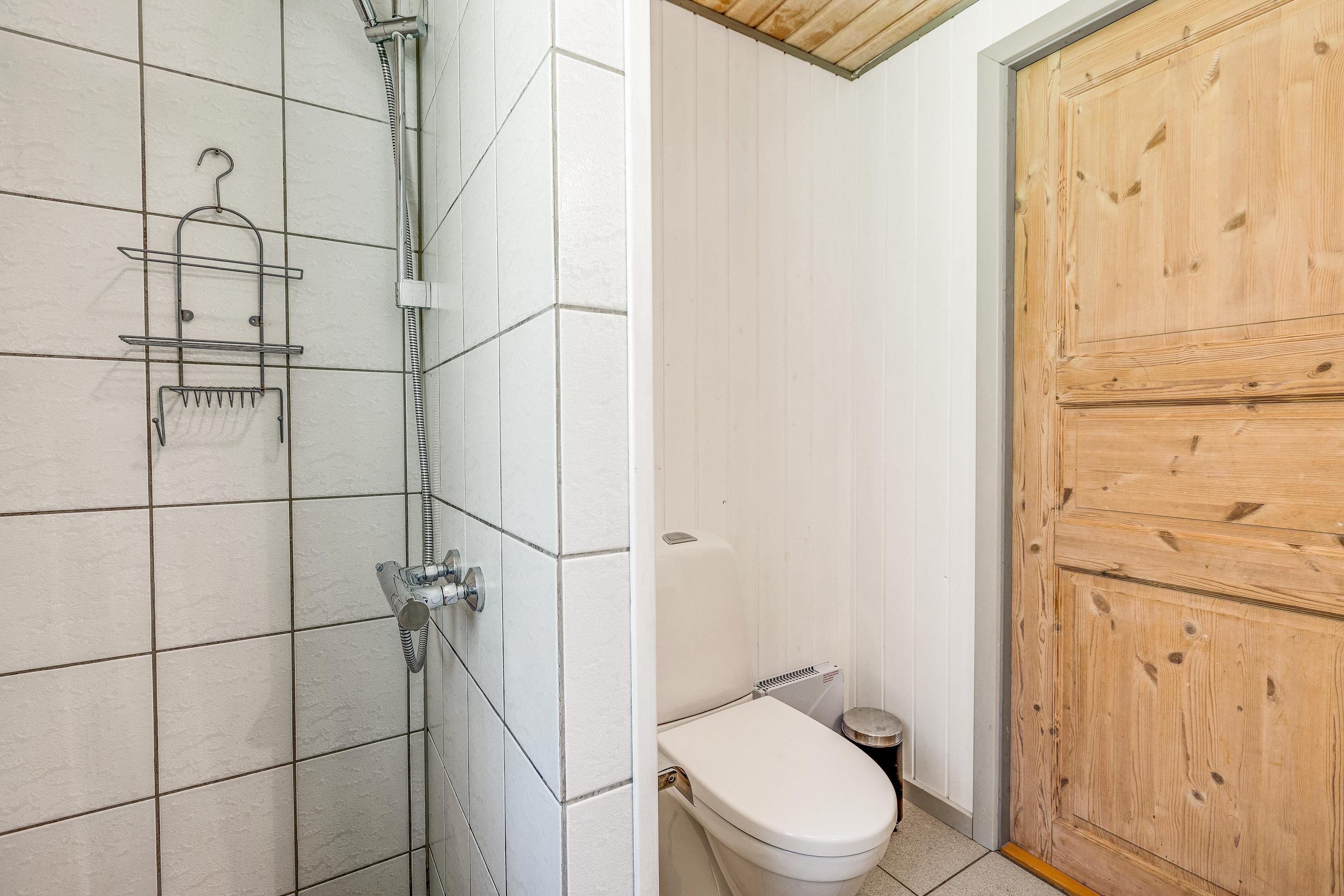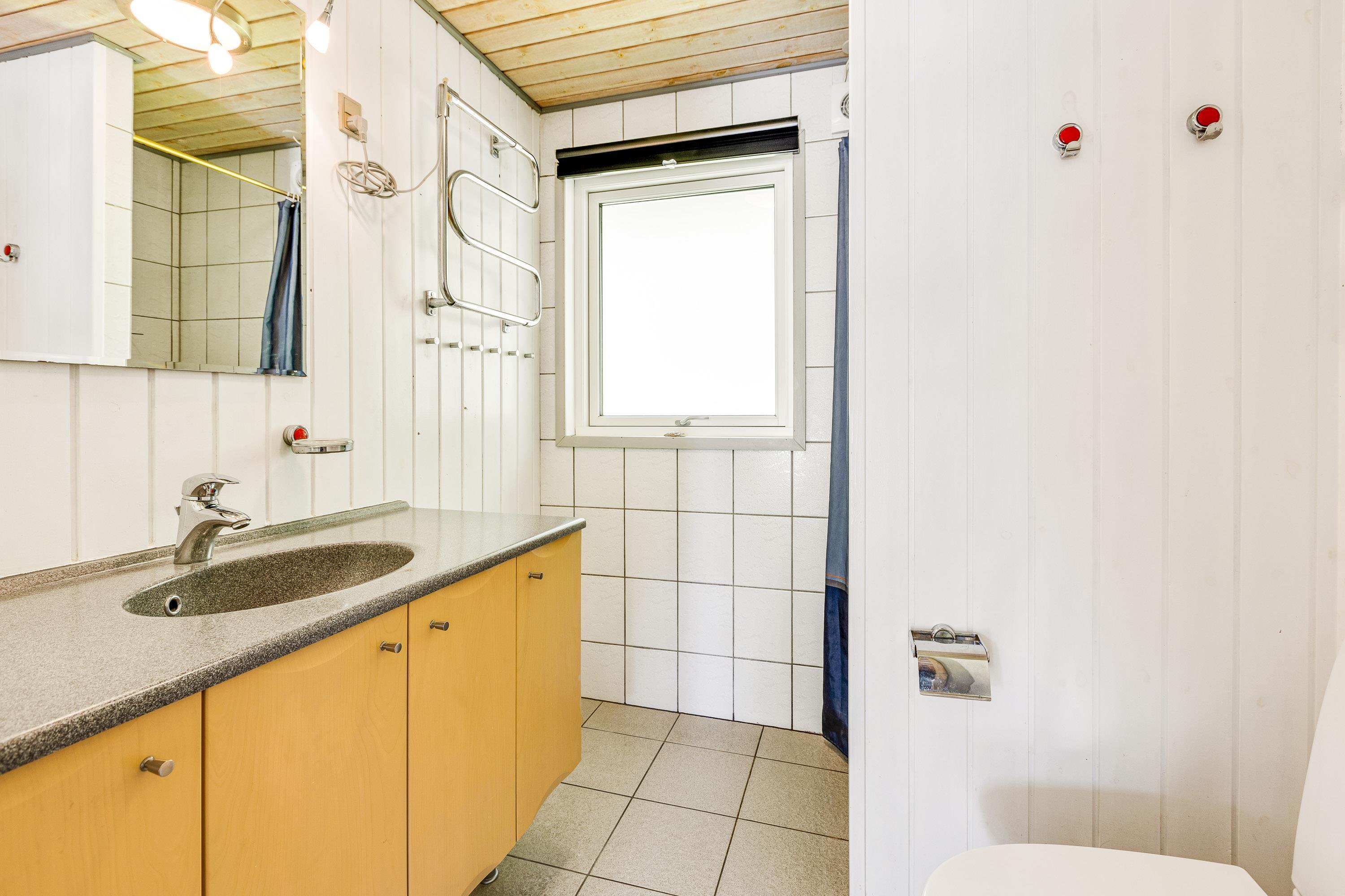 To komplette og i 2015 renoverede badeværelser samt sauna. Badeværelserne er med toiletter og bruser samt skridsikre gulvfliser. I det største badeværelse er der vaskemaskine og tørretumbler samt direkte adgang til saunaen med to gennemgående bænke. Såvel badeværelser som køkken, spisestue og poolrum har gulvvarme.