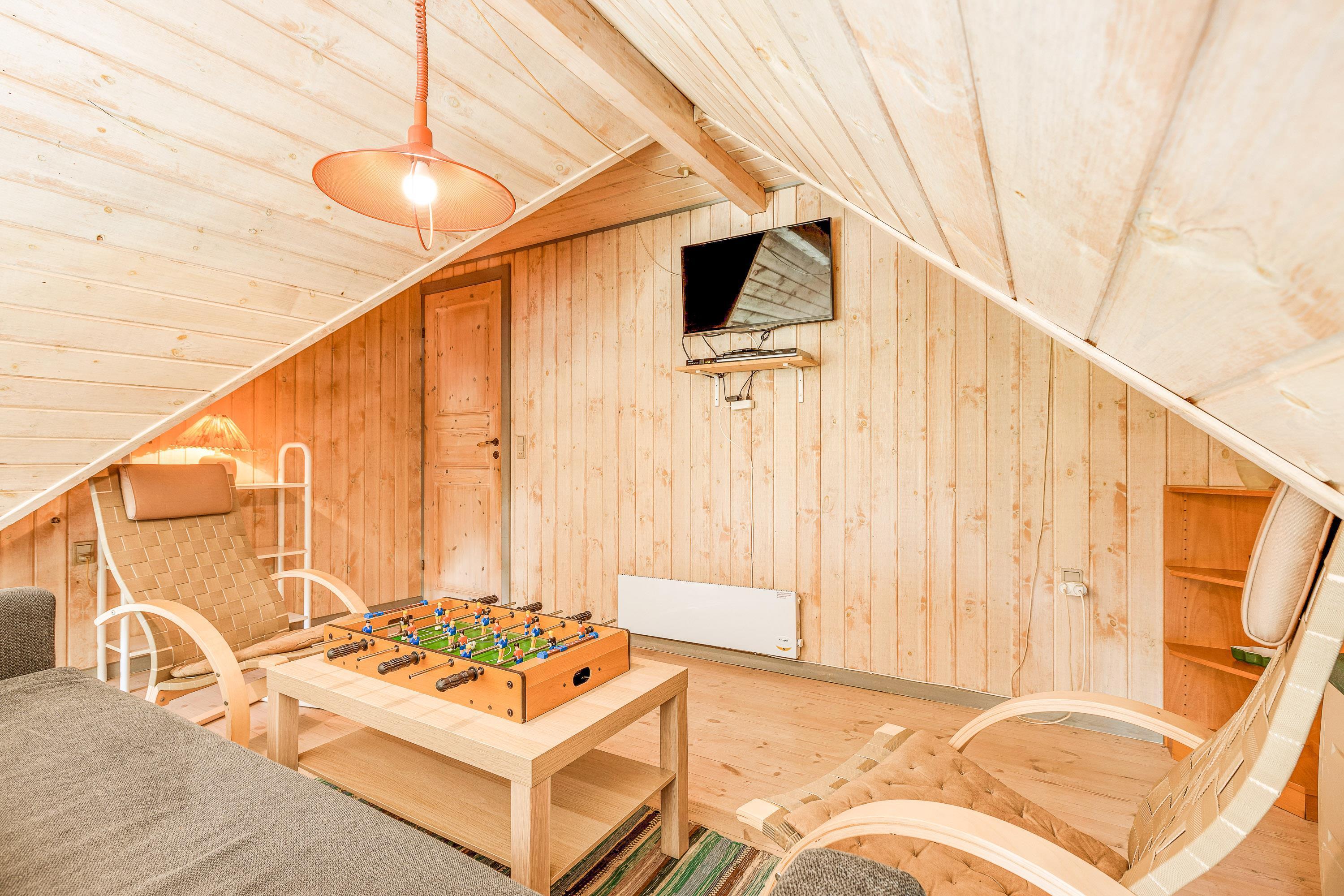 I opholdsstuen på 1. sal – med frit udsyn over opholdsstuen i stueetagen – er der en sovesofa med topmadras til 2 personer samt et 32” Full HD LED Smart TV med valgfri digitale kanaler og DVD-afspiller.