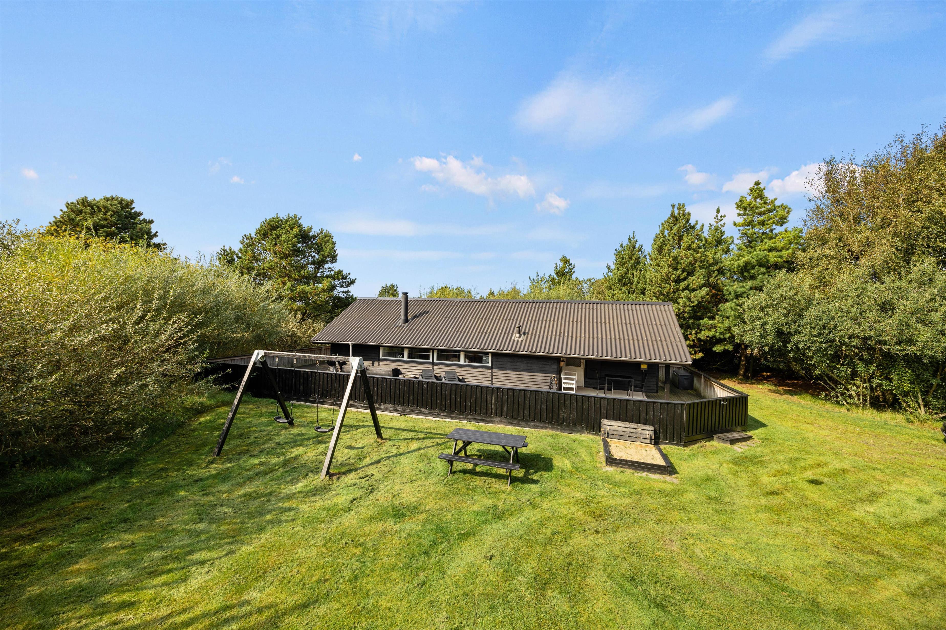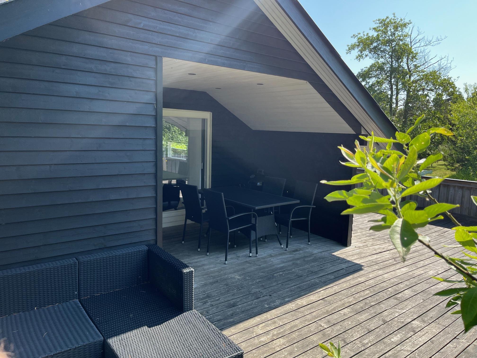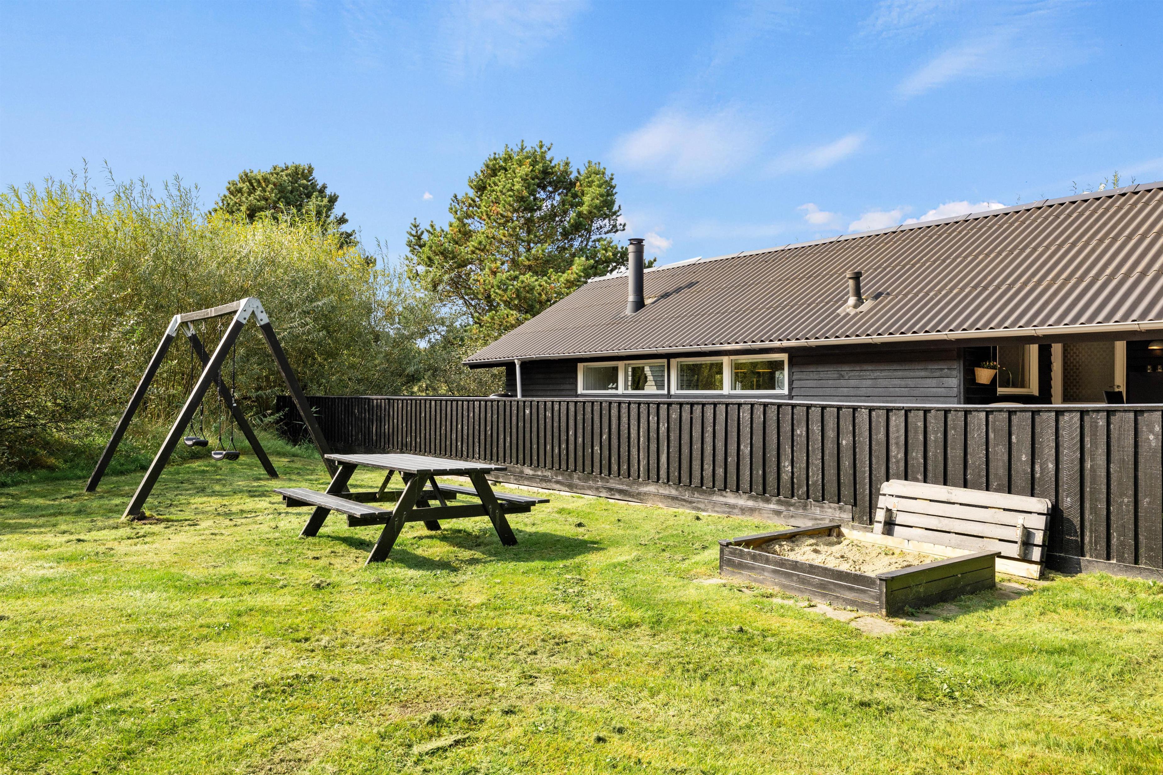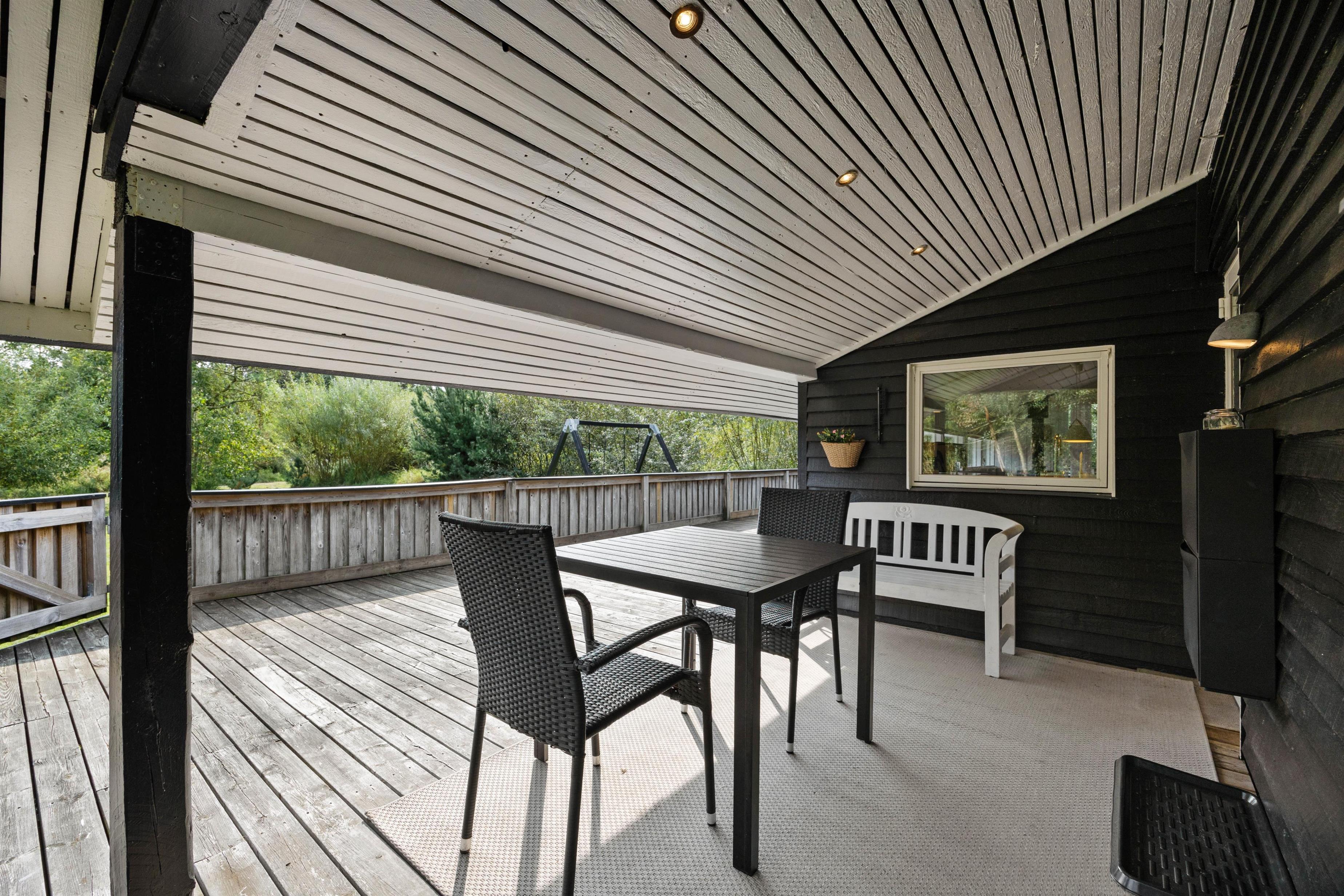 Fra køkken-alrummet er der udgang til den store terrasse, som er delvist overdækket. Her venter havemøbler, liggestole og grillen på jer! Slap af i solen, nyd en dejlig frokost tilberedt på grillen og lad børnene lege. På det grønne græs er der gynger og sandkasse til familiens mindste.