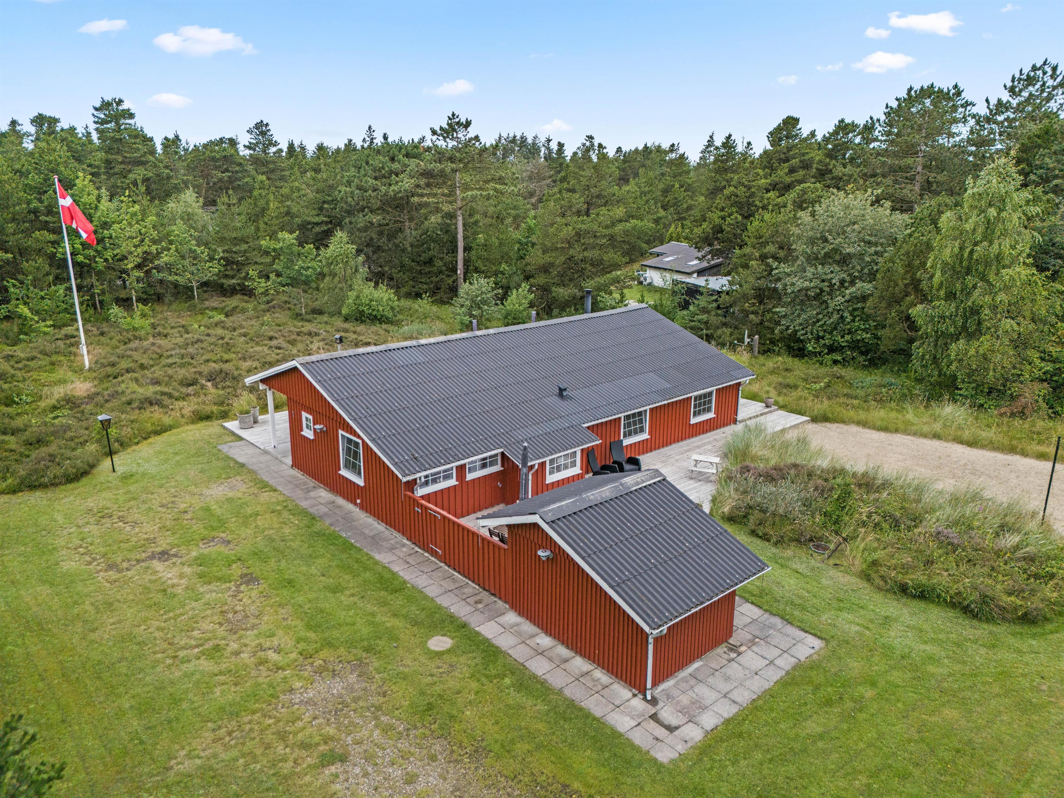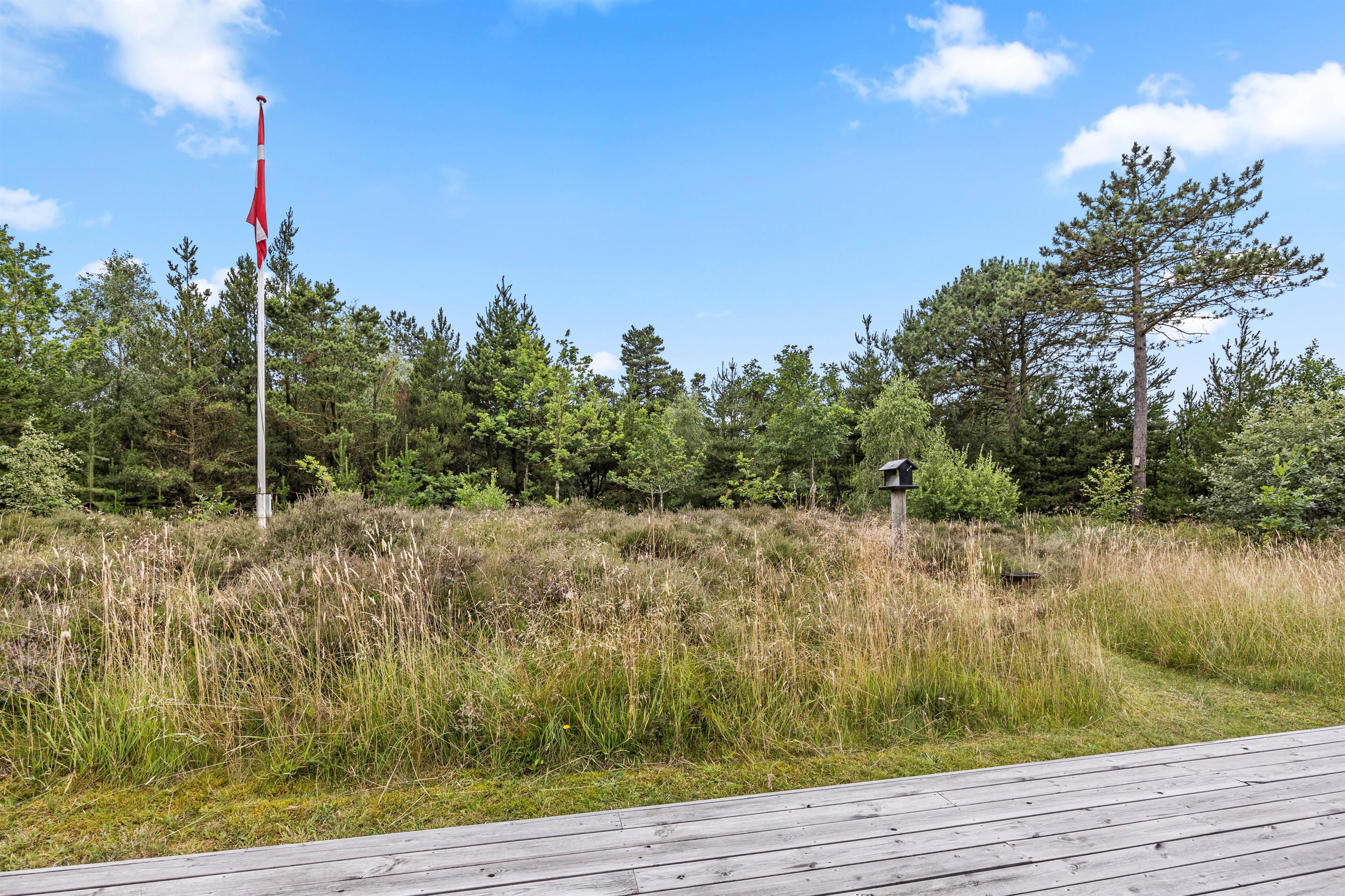 Fra stuen er der adgang til den store smukke træterrasse, som især skal nydes på de solrige sommerdage. Her kan I nyde roen, de smukke lyngbeklædte omgivelser og fuglenes sang i baggrunden. En del af terrassen er overdækket - perfekt til morgenkaffen. Havemøbler, liggestole og grillen venter på jer.