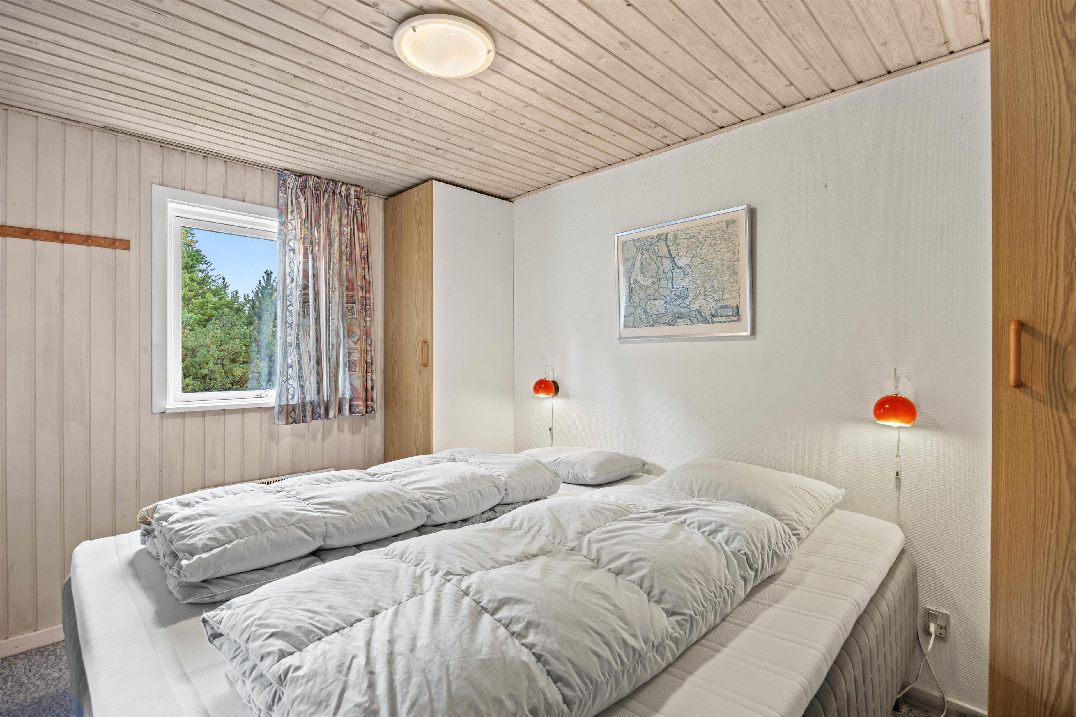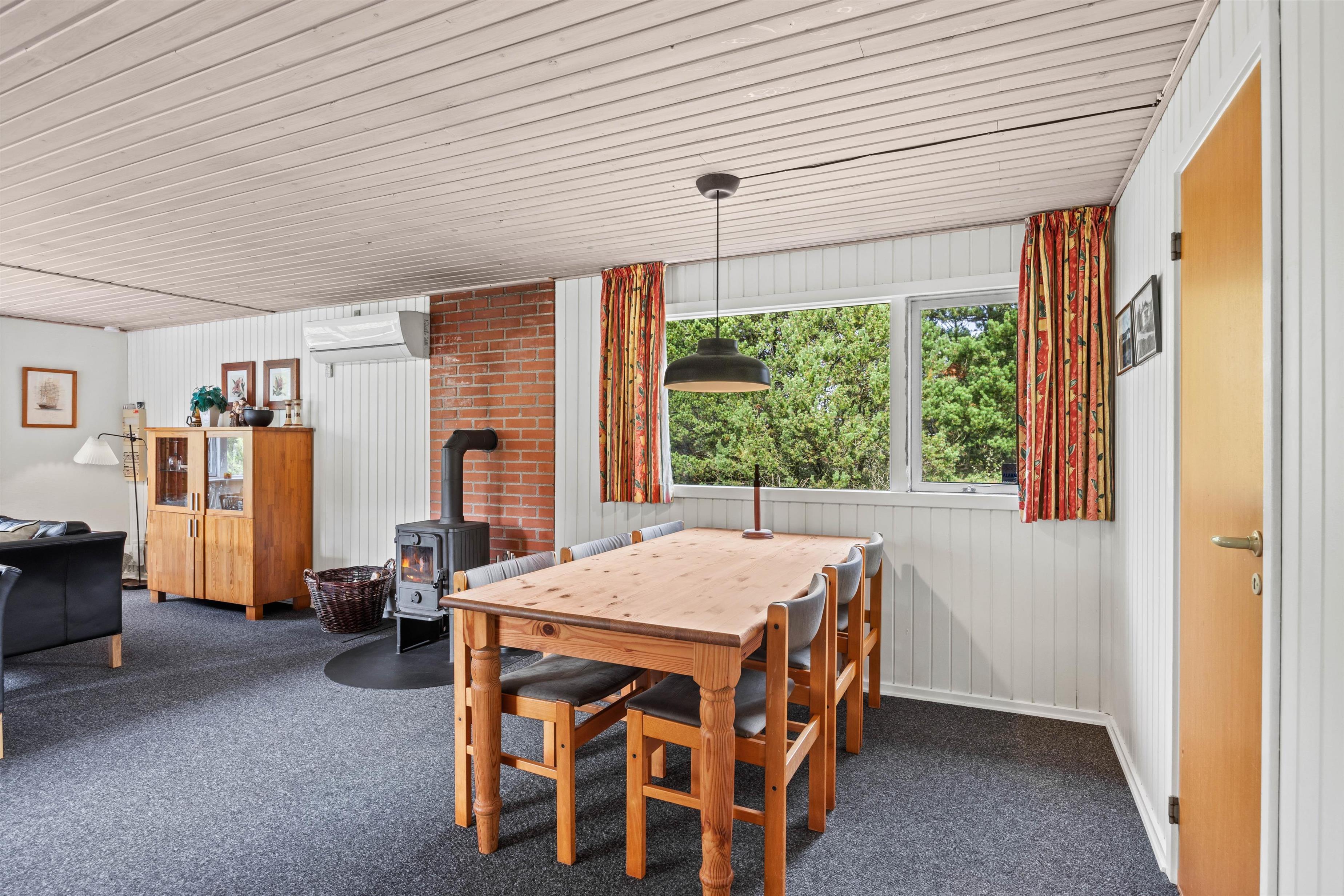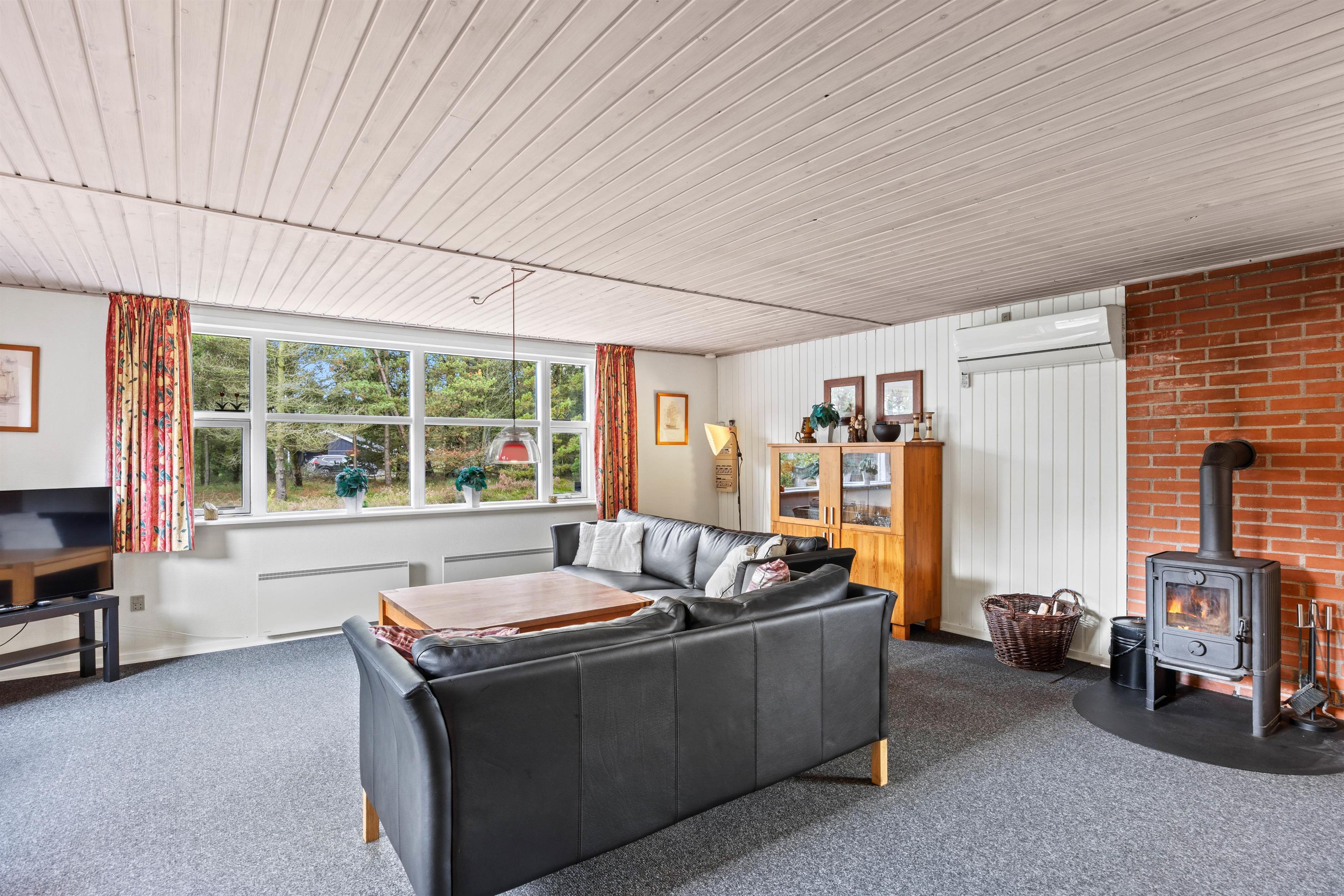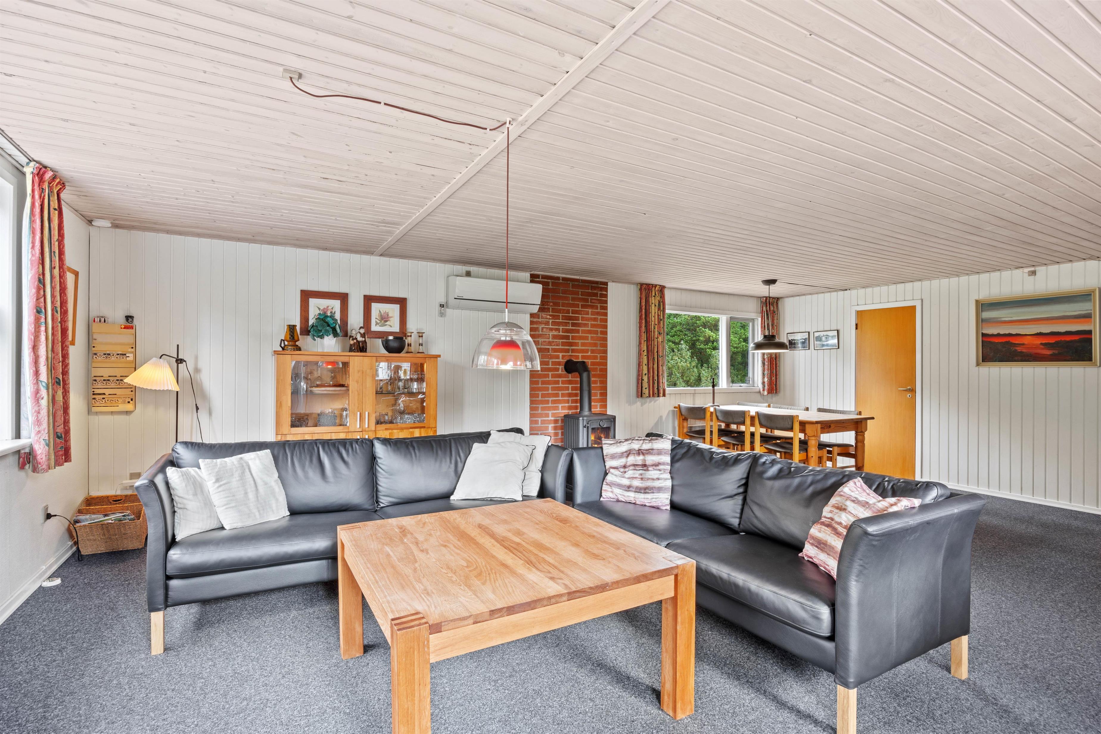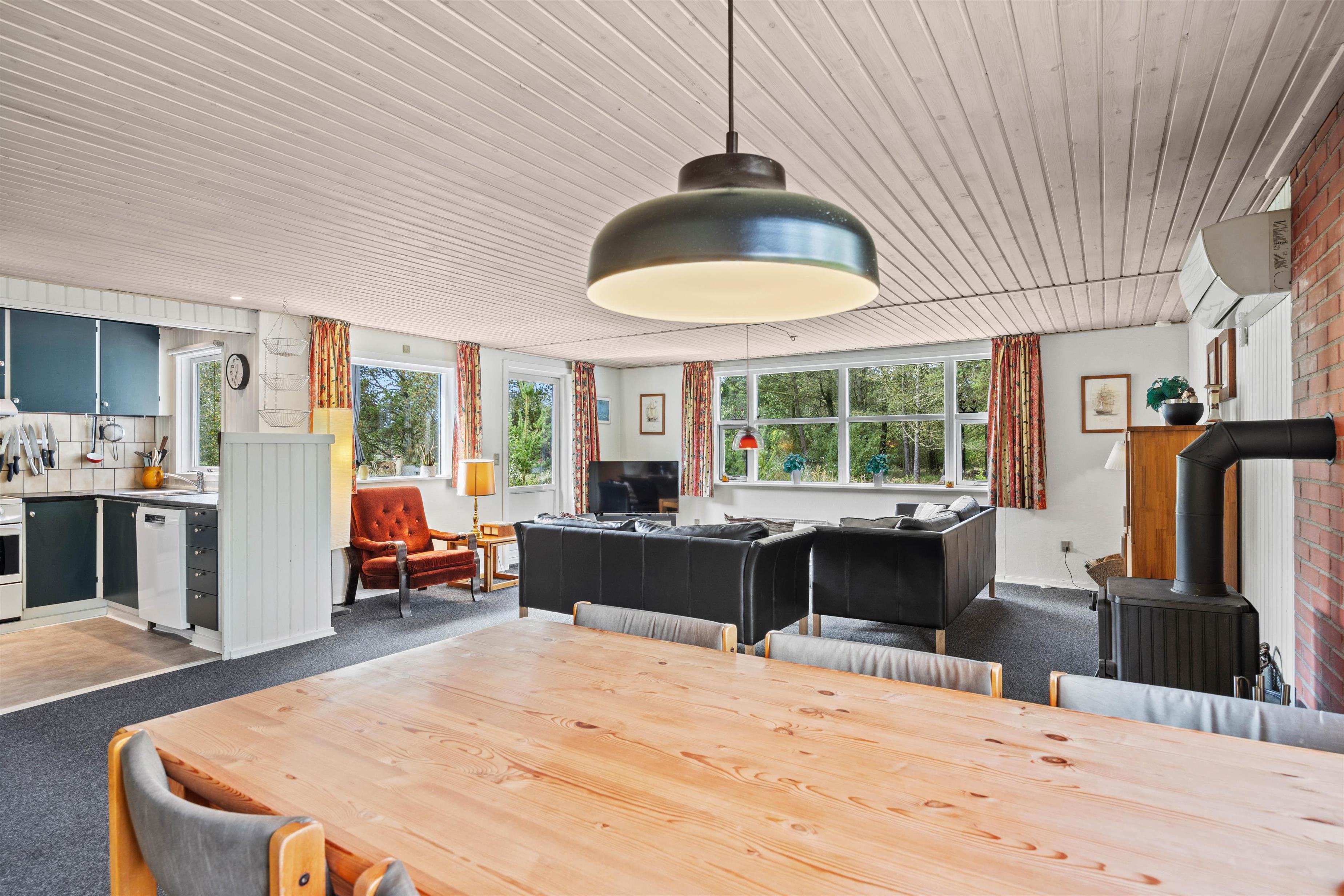 Når du fortsætter ind i sommerhuset, kommer du ind i det praktisk udstyrede køkken, hvor du også finder en opvaskemaskine, en mikroovn og et køleskab med fryser. Køkkenet ligger i åben forbindelse med spisepladsen, som går over i stuen. Brændeovnen i rummet giver ikke kun hyggelig varme, men skaber også en hyggelig feriestemning. Hvis det er nødvendigt, kan man tænde for den energibesparende varmepumpe, som hurtigt sørger for behagelige temperaturer i feriehuset. De 6 sengepladser fordeler sig på de 3 soveværelser med dobbeltsenge. Der er vaskemaskine og tørretumbler i feriehuset, så I kan opfriske håndklæderne i løbet af ferien.