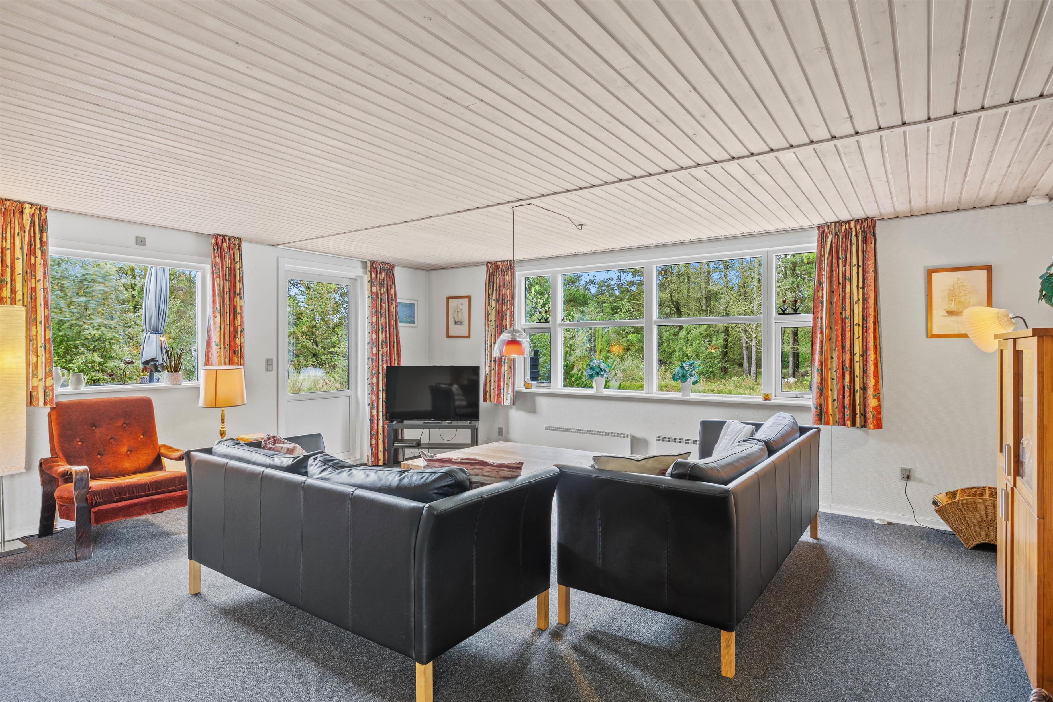 Når du træder ind i feriehuset på Småfolksvej 58C, møder du først den store udestue som giver en fantastisk udsigt over naturgrunden på en regnvejrsdag. De store vinduer lukker masser af lys ind, så du kan sætte dig godt til rette, læse en bog eller nyde en frisk kop te eller kaffe.