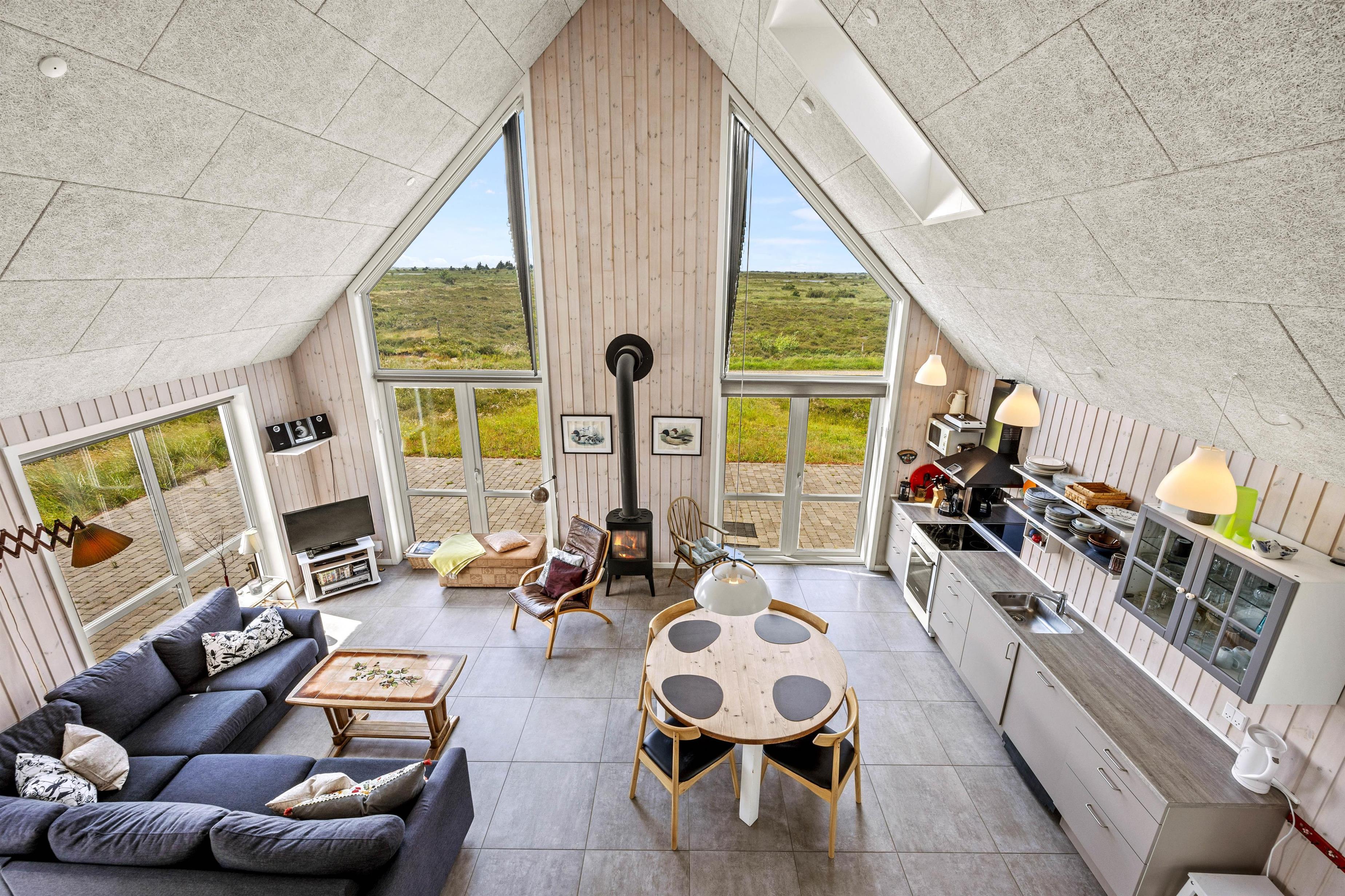 Velkommen indenfor i det skønne sommerhus. Store vinduespartier og loft til kip i alrummet gør sommerhuset lyst og indbydende, så her vil I hurtigt føle jer godt tilpasse. Det åbne alrum sørger for, at I alle kan være samlet mest muligt i løbet af ferien - Uanset om nogle laver mad, andre laver puslespil eller slapper af i sofaen foran brændeovnen.