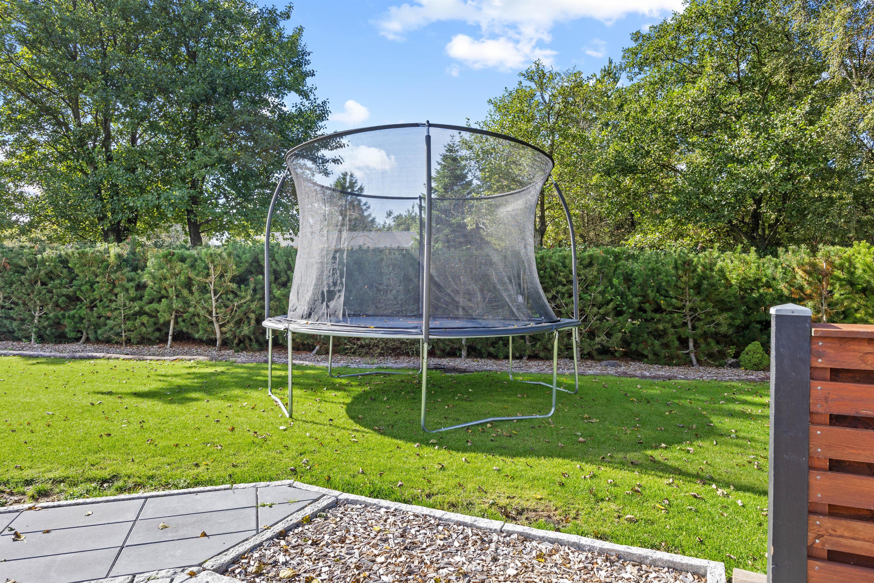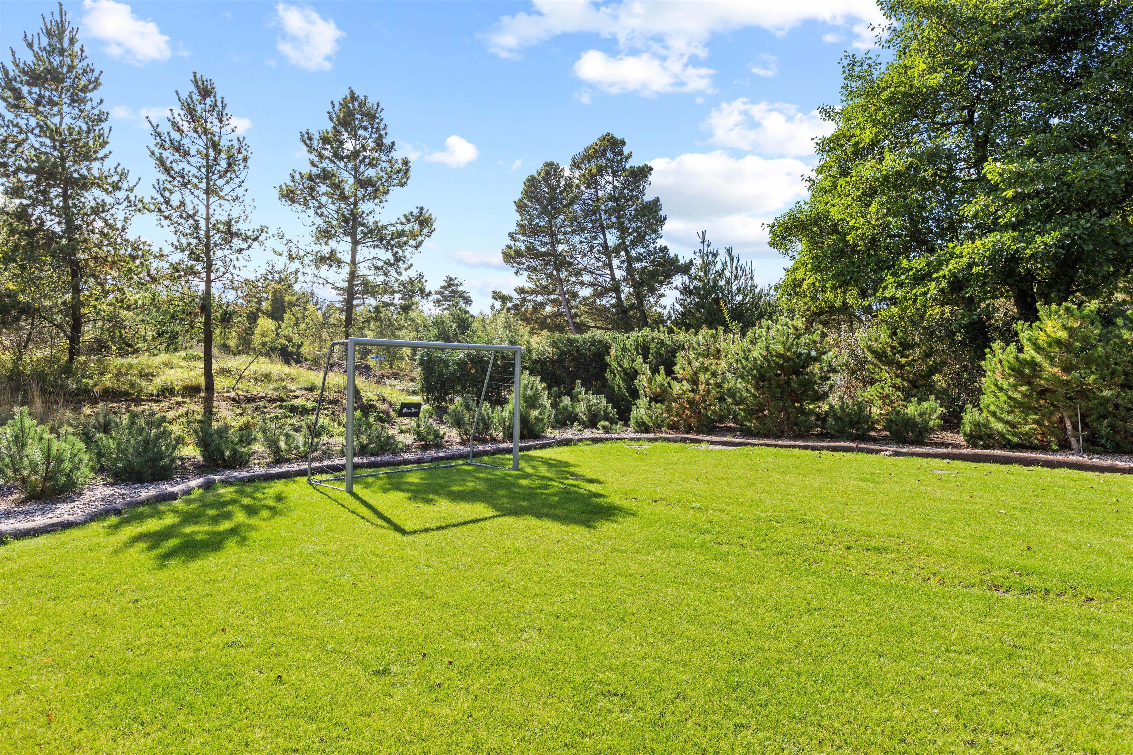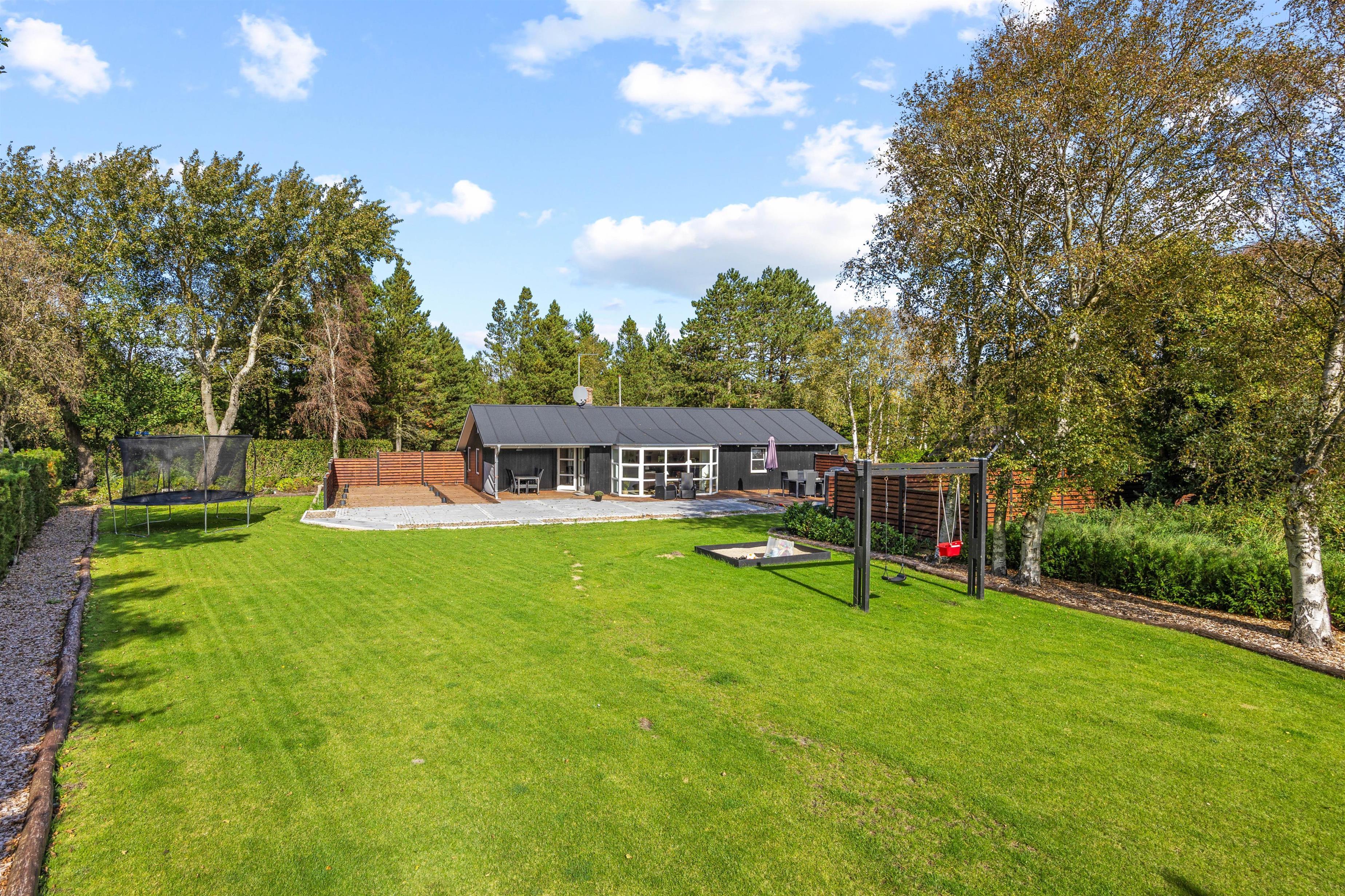 Haven på den 2.600 kvadratmeter store grund er velholdt med havemøbler, liggestole og en parasol. Terrassen har både en åben og en overdækket del, og desuden er der afskærmet med et læhegn, så I kan føle jer private ved sommerhuset. For de yngste gæster er der både sandkasse, gynger og fodboldmål – og i sommerperioden, fra påske til efterårsferien, kan de også glæde sig til en trampolin i haven.