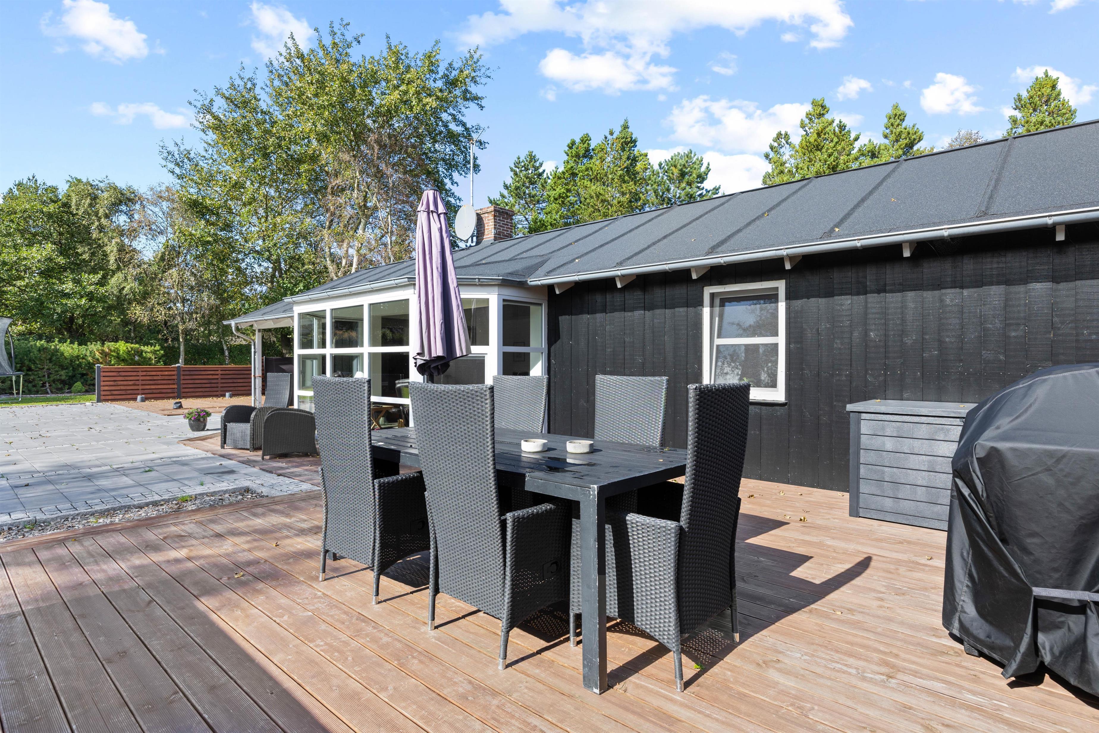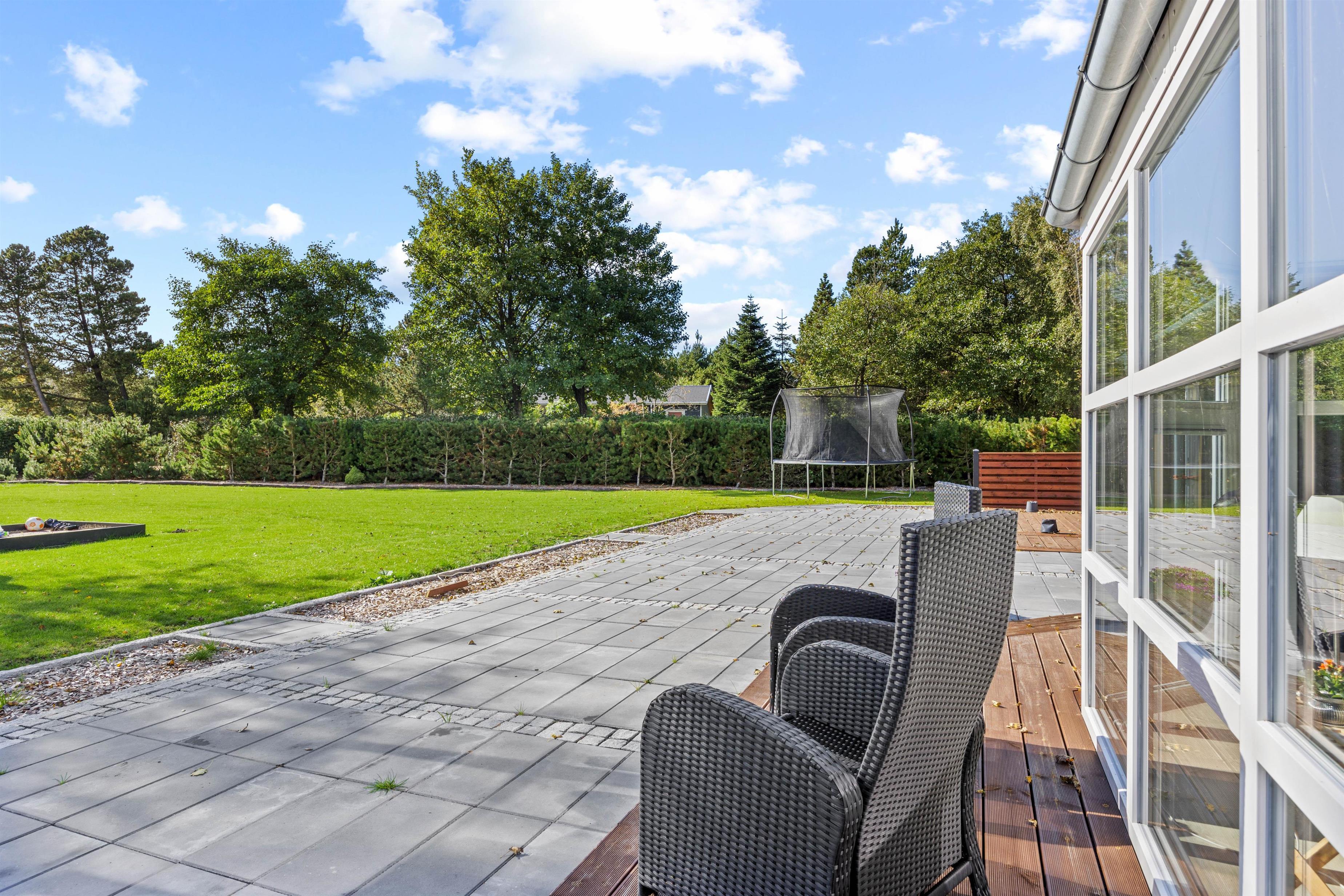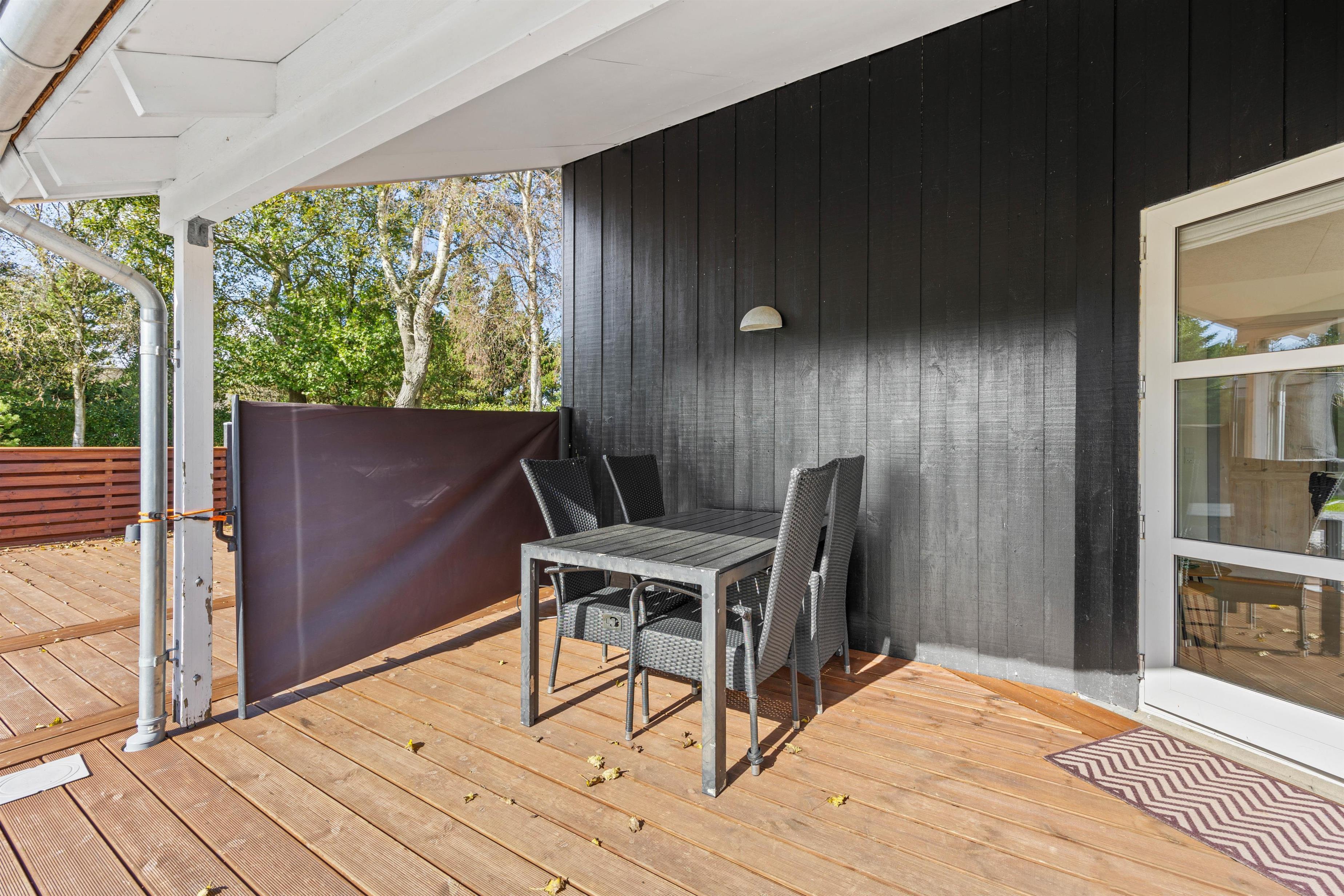 Haven på den 2.600 kvadratmeter store grund er velholdt med havemøbler, liggestole og en parasol. Terrassen har både en åben og en overdækket del, og desuden er der afskærmet med et læhegn, så I kan føle jer private ved sommerhuset. For de yngste gæster er der både sandkasse, gynger og fodboldmål – og i sommerperioden, fra påske til efterårsferien, kan de også glæde sig til en trampolin i haven.