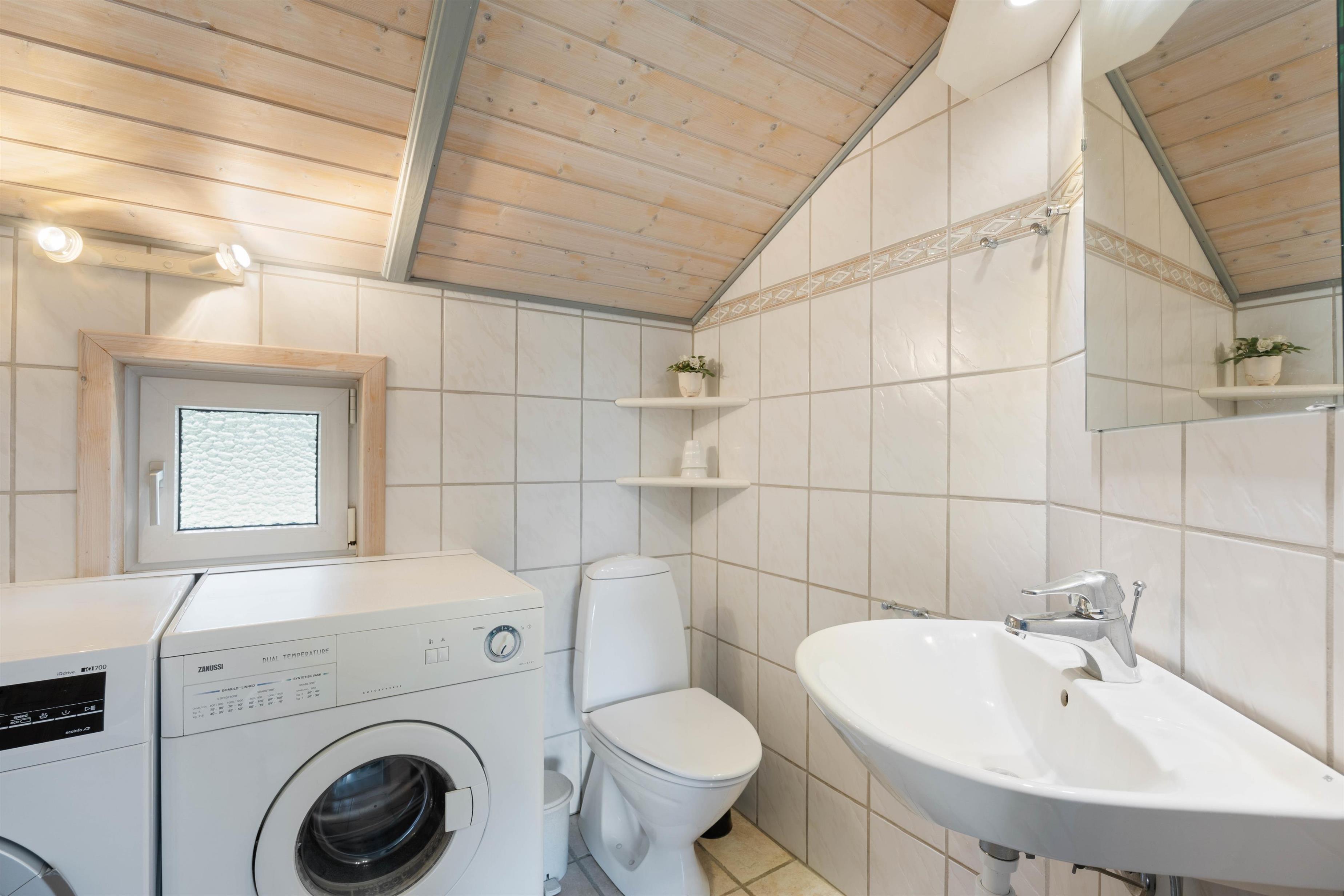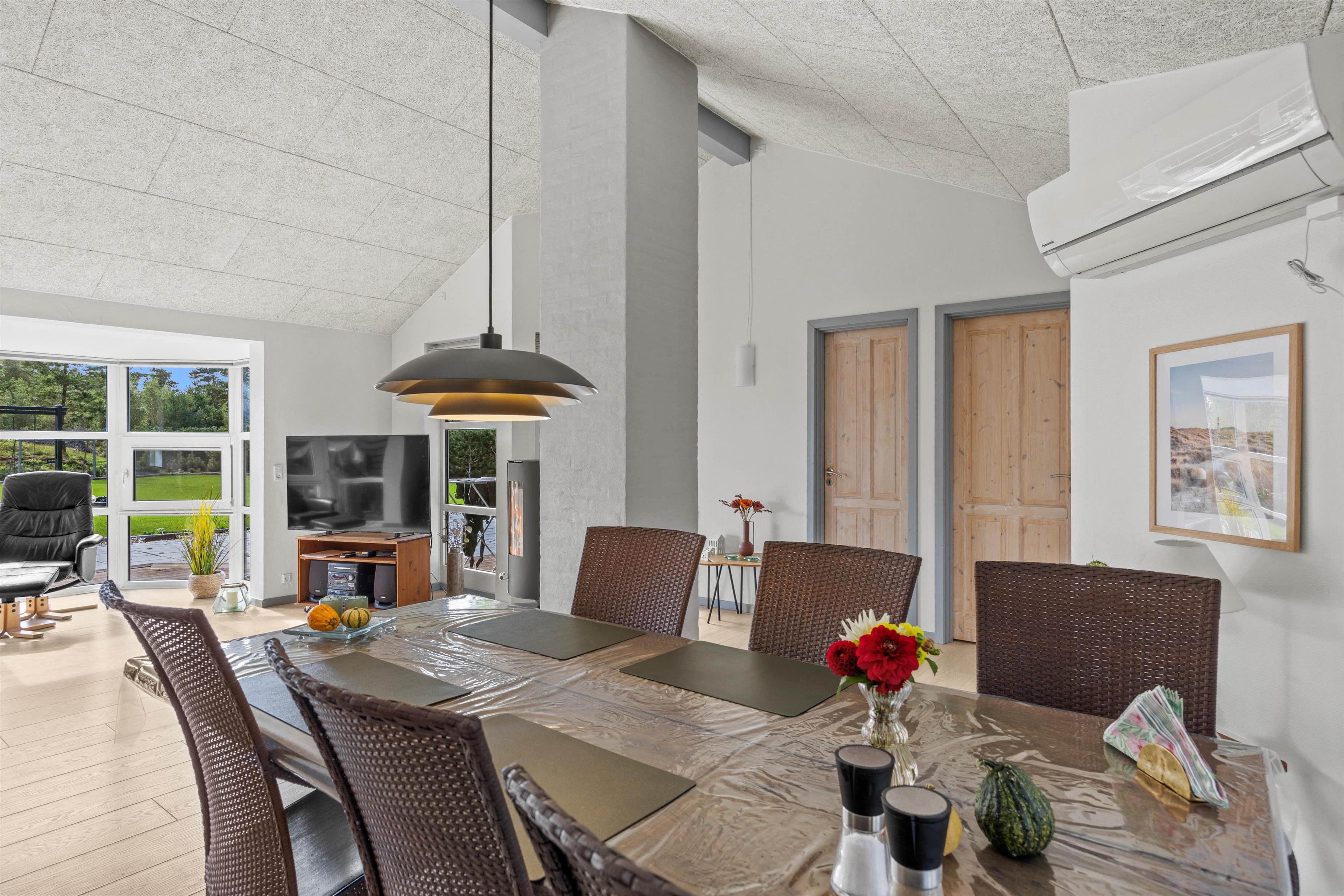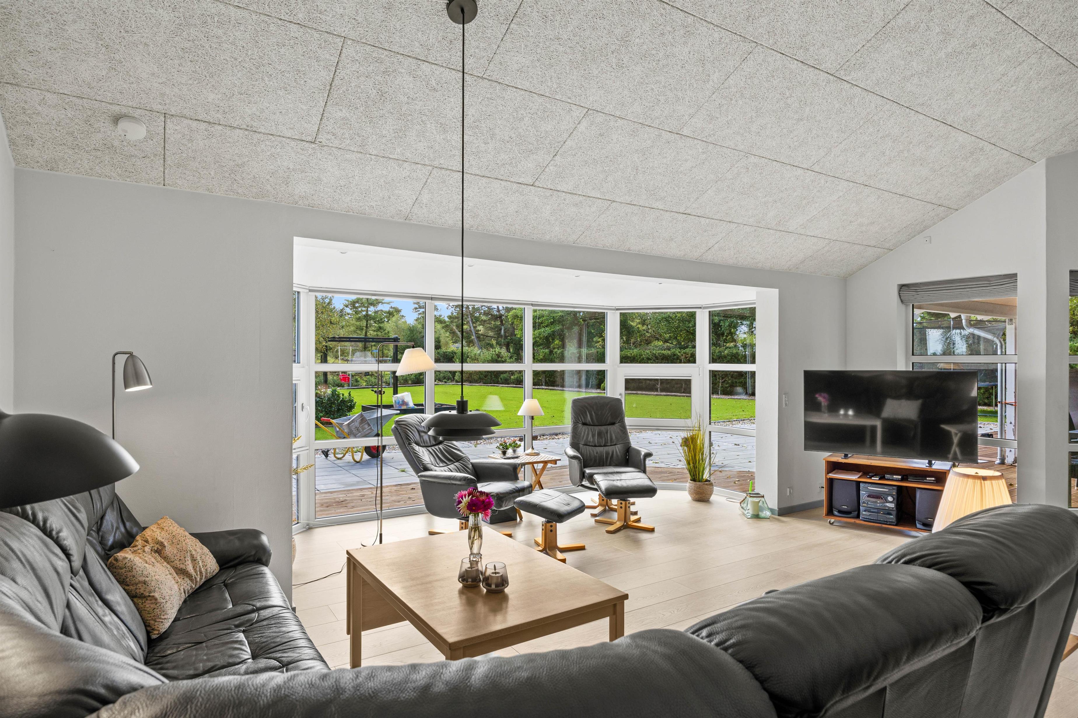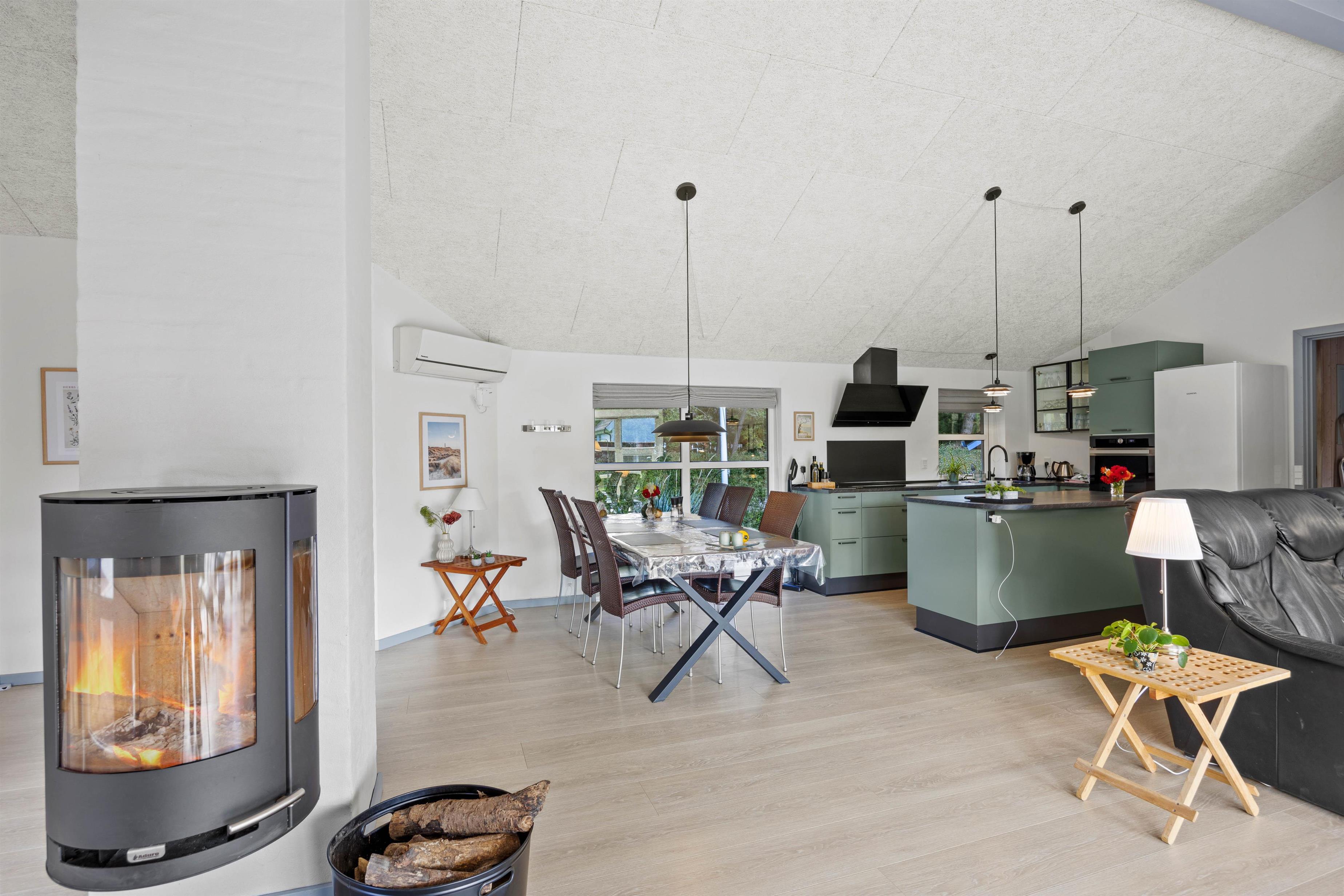 På Kap Farvel 2 vil I mærke feriestemningen straks, I træder ind ad døren. De lyse vægge, trælaminatgulve, de lyse fyldningsdøre og loft op i kip giver både luft og et dejligt miljø at opholde sig i. De brede vinduespartier og karnap giver et fint lysindfald, og I kan nyde udsigten over den store grund, imens I slapper af i sofaen ved varmen fra ilden i brændeovnen. Der er også en energibesparende varmepumpe til at vedligeholde en behagelig temperatur i sommerhuset. Der er både barneseng, højstol, vaskemaskine og tørretumbler til rådighed for jer, så det er ikke noget problem at have små børn med på ferien.