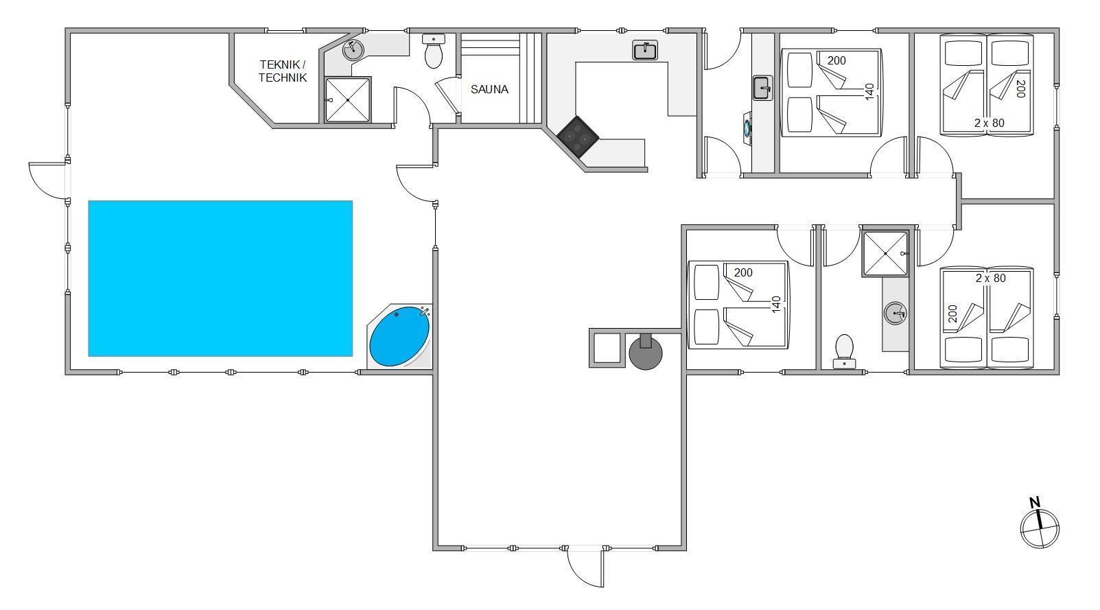 Det store sommerhus med stråtag på Godthåbsvej 7 er dejlig stort og rummeligt. Her er der 4 gode soverum med behagelige senge samt 2 badeværelser med gulvvarme. På det ene badeværelse, som befinder sig i poolrummet, er der også en sauna, hvor I kan sidde og dampe af efter en dejlig og begivenhedsrig dag på Rømø.