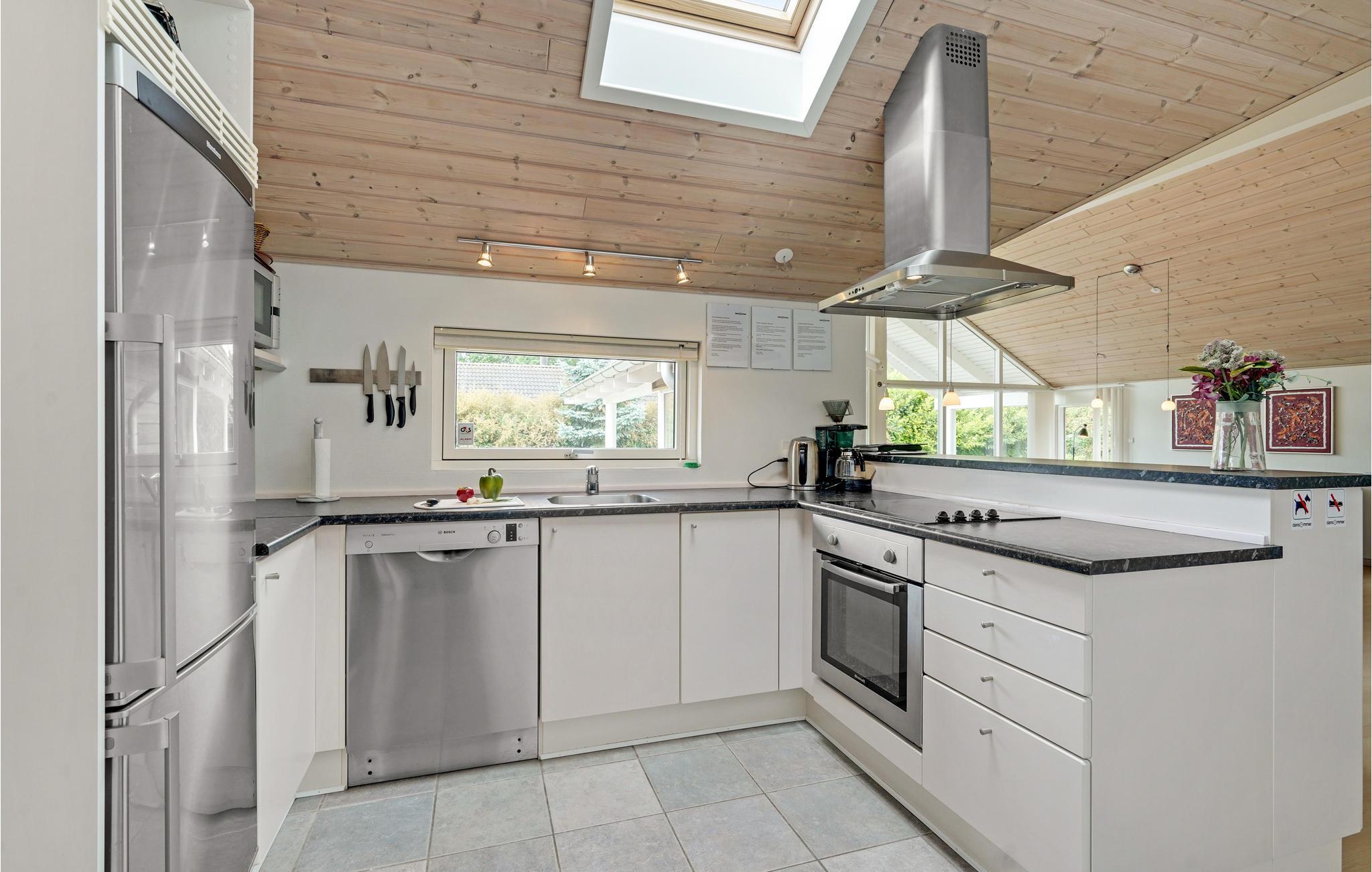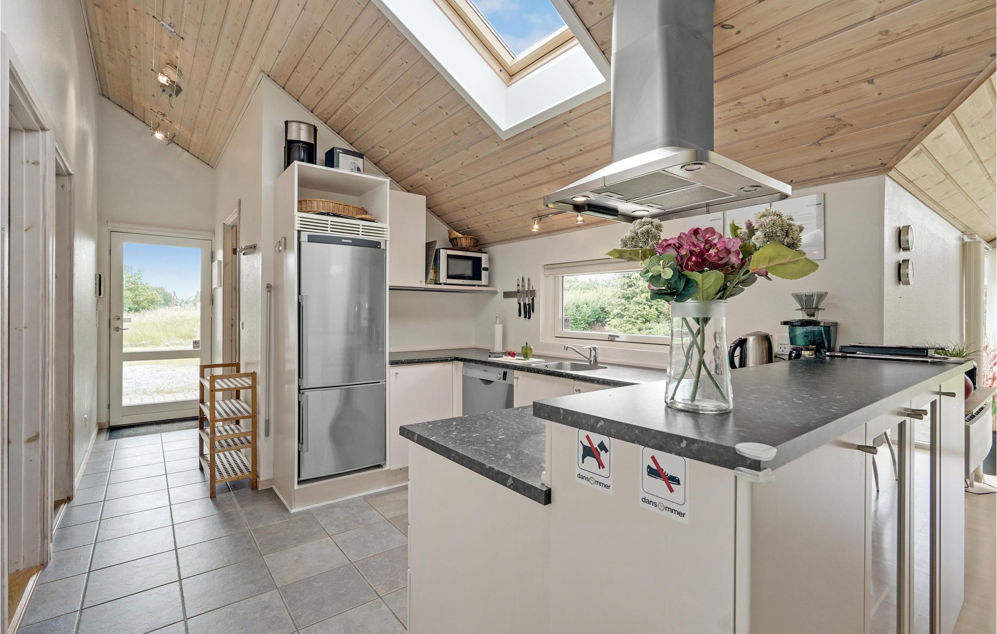 Huset indeholder alle moderne faciliteter. Det flotte køkken ligger i åben forbindelse med stuen, hvorfra der er udgang til den dejlige, store terrasse, så her kan I rigtig slappe af og nyde ferien.