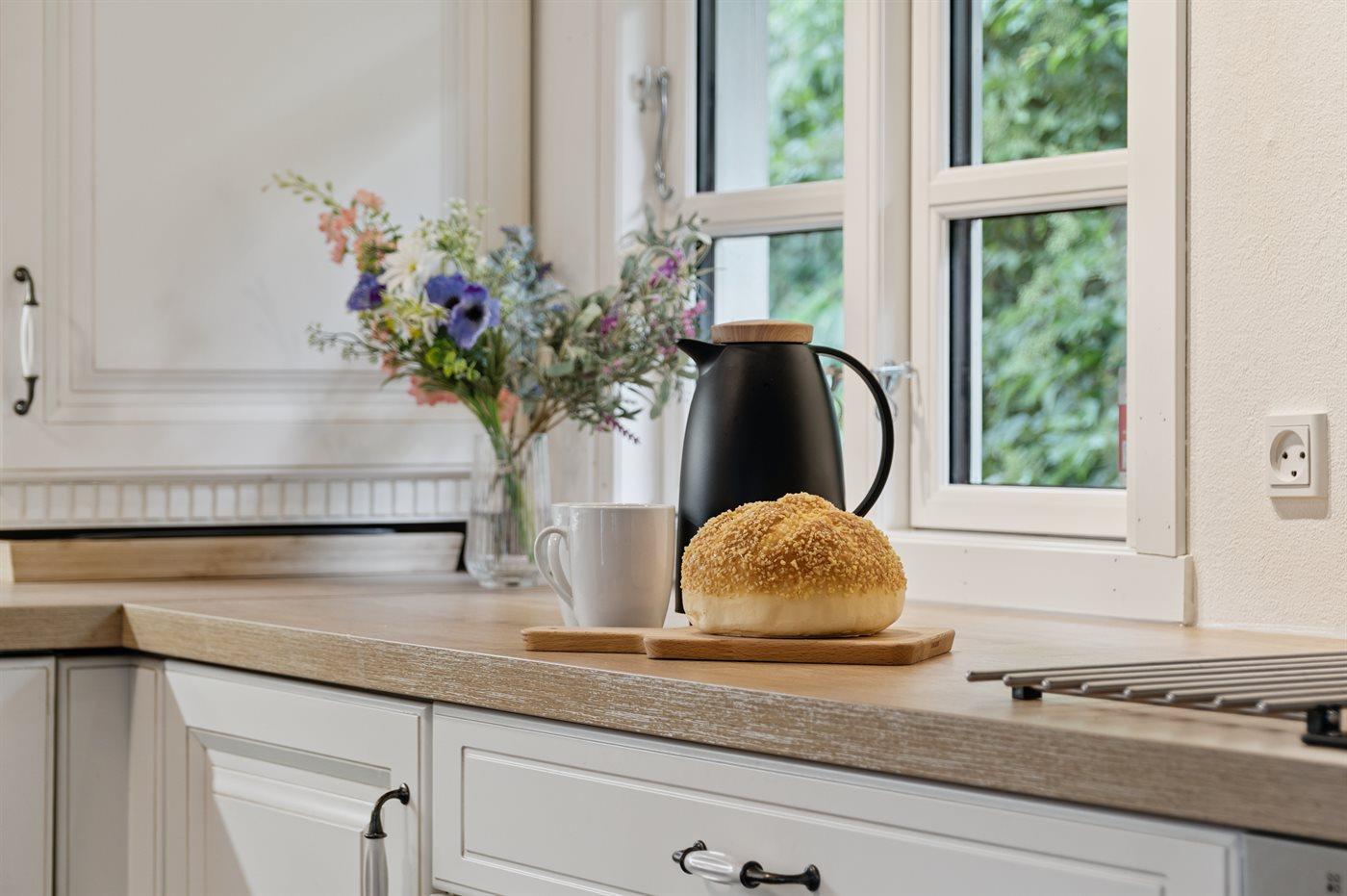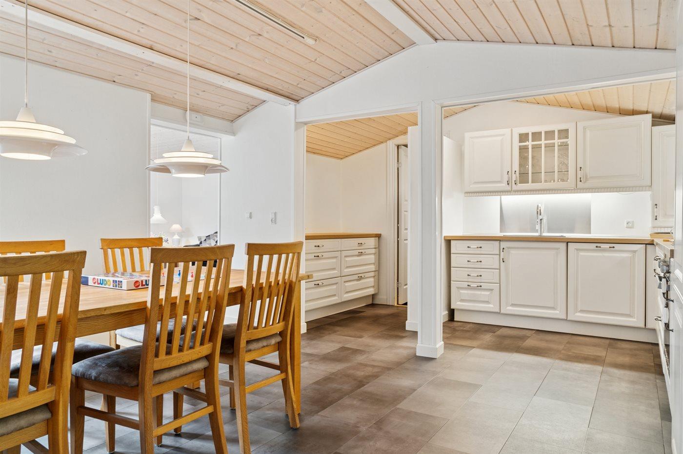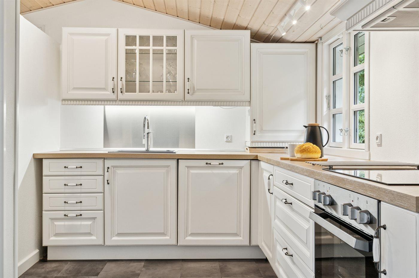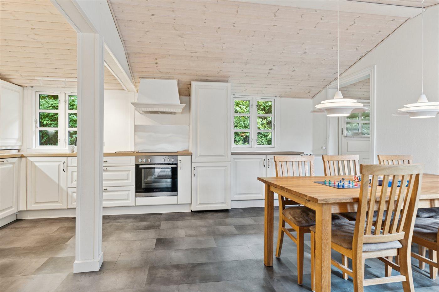 Køkkenet er udstyret med 1 køleskab. Der er 4 keramiske kogeplader, varmluftovn samt opvaskemaskine.