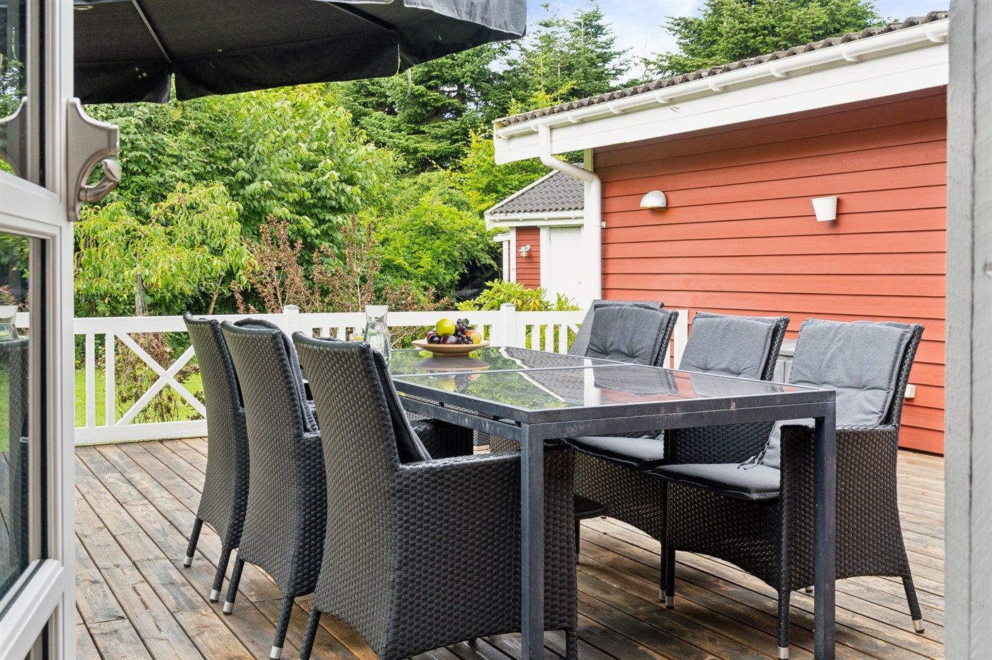 Ferieboligen er beliggende på en 1175 m² stor havegrund. Der er 9000 m til havet. Der er 400 m til fjorden. Der er en sø i en afstand af 1500 m. Nærmeste forretning er beliggende i en afstand af 900 m. Til ferieboligen hører åbent terrasseareal. Grill til rådighed. Parkering ved ferieboligen.