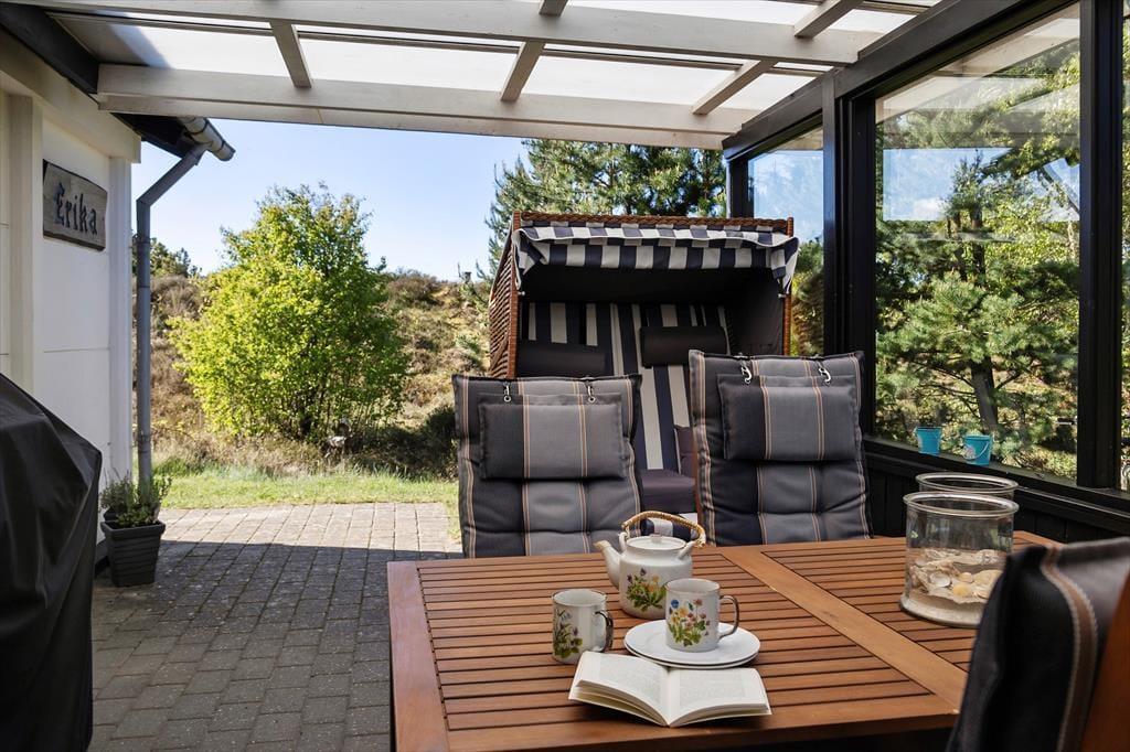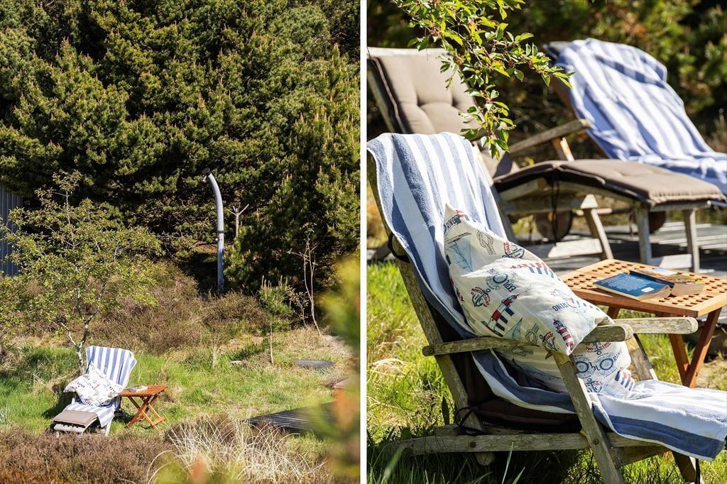 Når solen lokker dig udenfor, kan du nyde livet på sommerhusets læfyldte terrasser. Er det ikke vejr til at sidde helt ude i det fri, kan du slå dig ned på den 25 m² store terrasse, der er overdækket med termotag og udstyret med glasafskærmning mod vest. Det er skønt at sidde her – for eksempel på en solrig forårsdag eller en lys sommeraften. På den store, kuperede naturgrund kan du desuden sætte dig op på bænkene på den lyngklædte top for at nyde udsigten mod Vadehavet.
