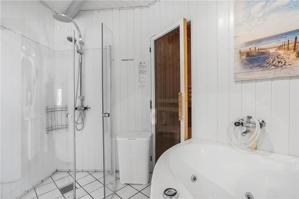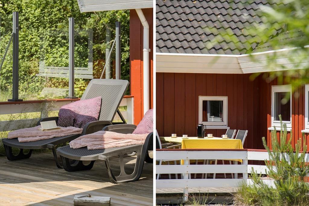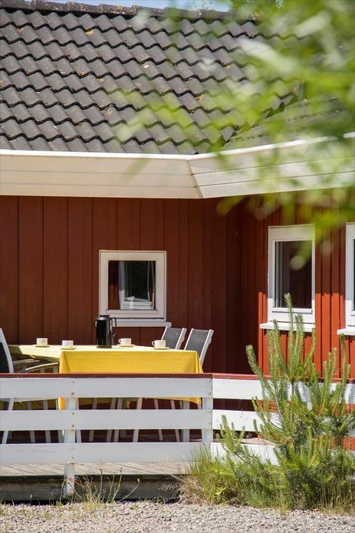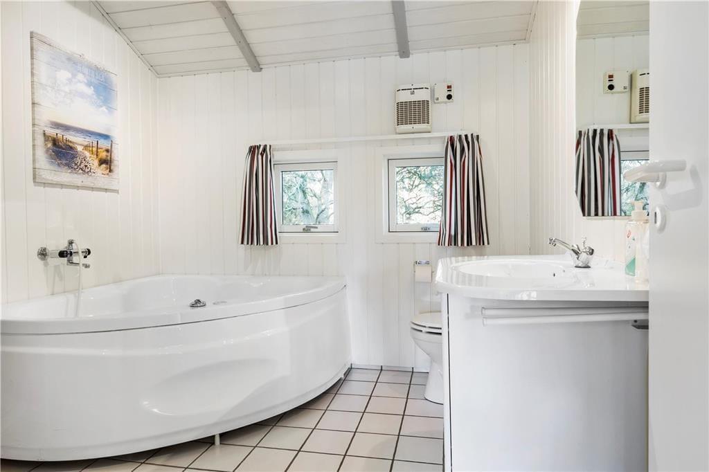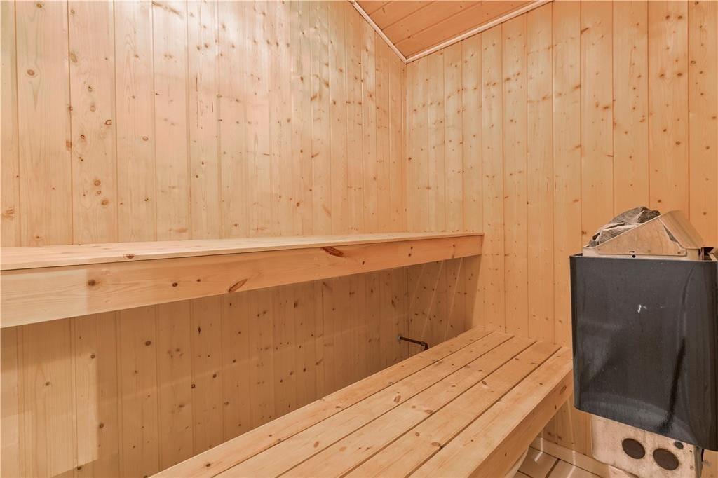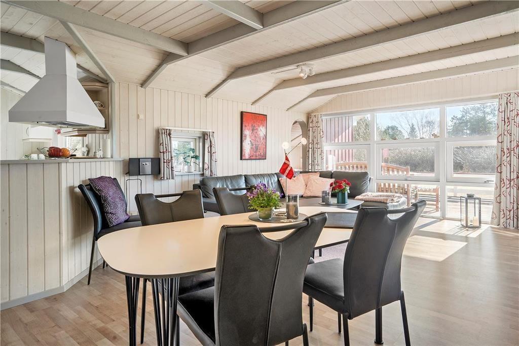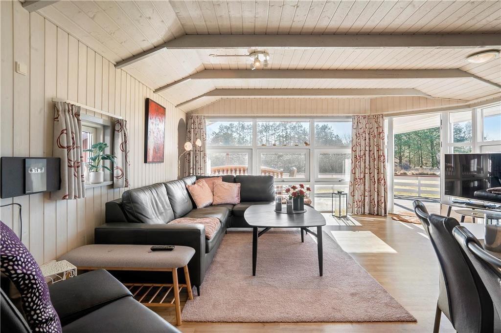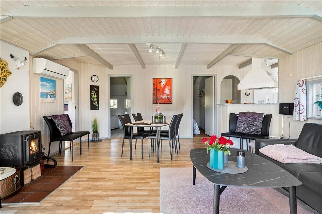 Lige fra ankomsten kan du mærke den gode sommerhusatmosfære, for ejendommen præsenterer sig på køn og klassisk vis med rødmalet træfacade, hvide vinduesrammer og ditto stakit. Inden døre fortsætter den samme indbydende stil, for her er der lyse trælister på væggene, brændeovn og pænt møblement, der passer godt ind i de hyggelige rum – som kort fortalt består af tre soveværelser, to badeværelser, et bryggers og en opholdsstue med alkove og integreret køkken. Ikke mindst i opholdsrummet sørger de store vinduespartier for et godt lysindfald og sikrer, at du kan nyde de grønne omgivelser, selvom du opholder dig indenfor i varmen. Og apropos varme, så er der udover brændeovnen også en varmepumpe, du kan tage i brug på de kølige dage. Skal du virkelig slappe af, kan du gøre klar på det ene badeværelse til en veritabel wellnessaften med spabad og sauna.