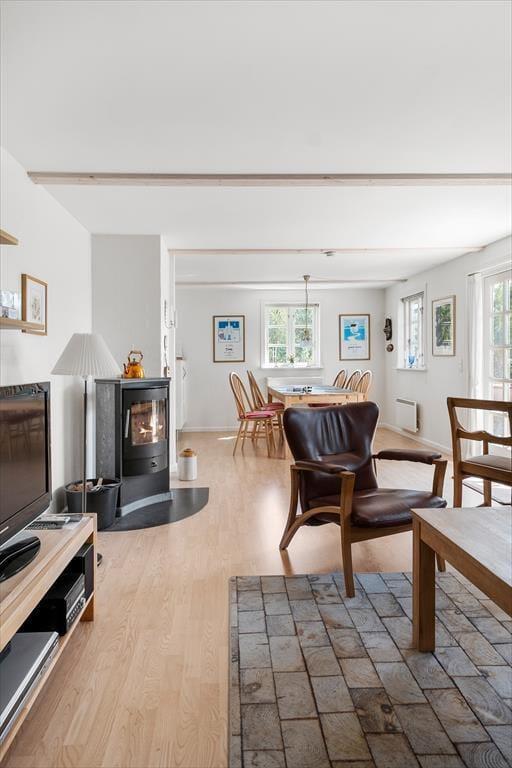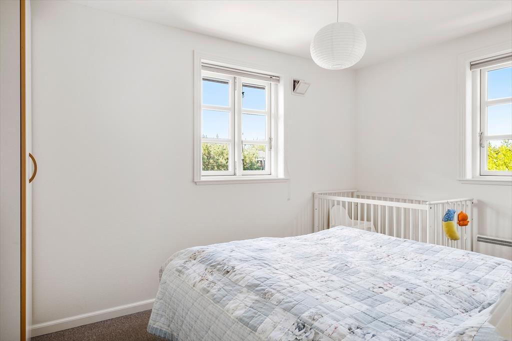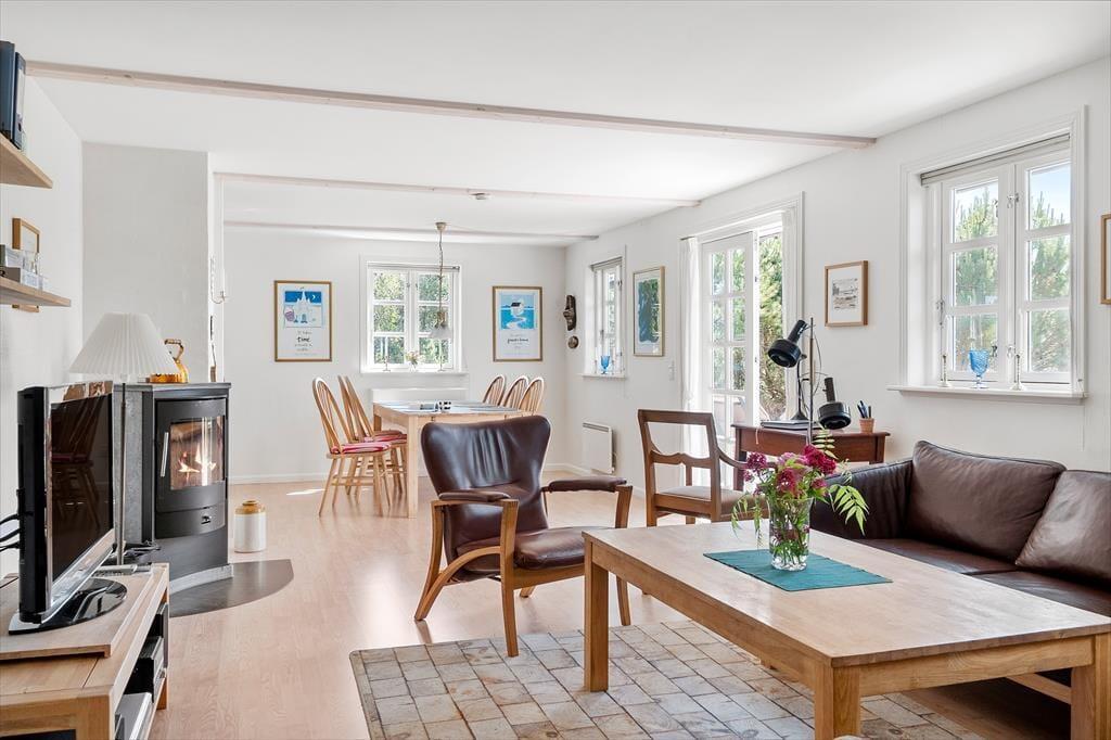 Sommerhusets rødmalede træfacade giver en flot kontrast til de grønne naturomgivelser, og inden døre er atmosfæren lys og let med hvid som gennemgående farve. Planløsningen passer godt til seks personer, for der er tre gode soveværelser, hvoraf to er med dobbeltseng, og det tredje med køjeseng. Ved entréen ligger badeværelset, der byder på en bruseniche, vaskemaskine og gulvvarme, og endelig er køkken og stue forenet, så de tilsammen fungerer som et herligt opholdsrum med god plads til feriens måltider, afslapning og sociale stunder. Centralt i rummet står en brændeovn, og med tv, radio og wi-fi-forbindelse har du mulighed for at hygge dig med film, musik og anden digital underholdning.