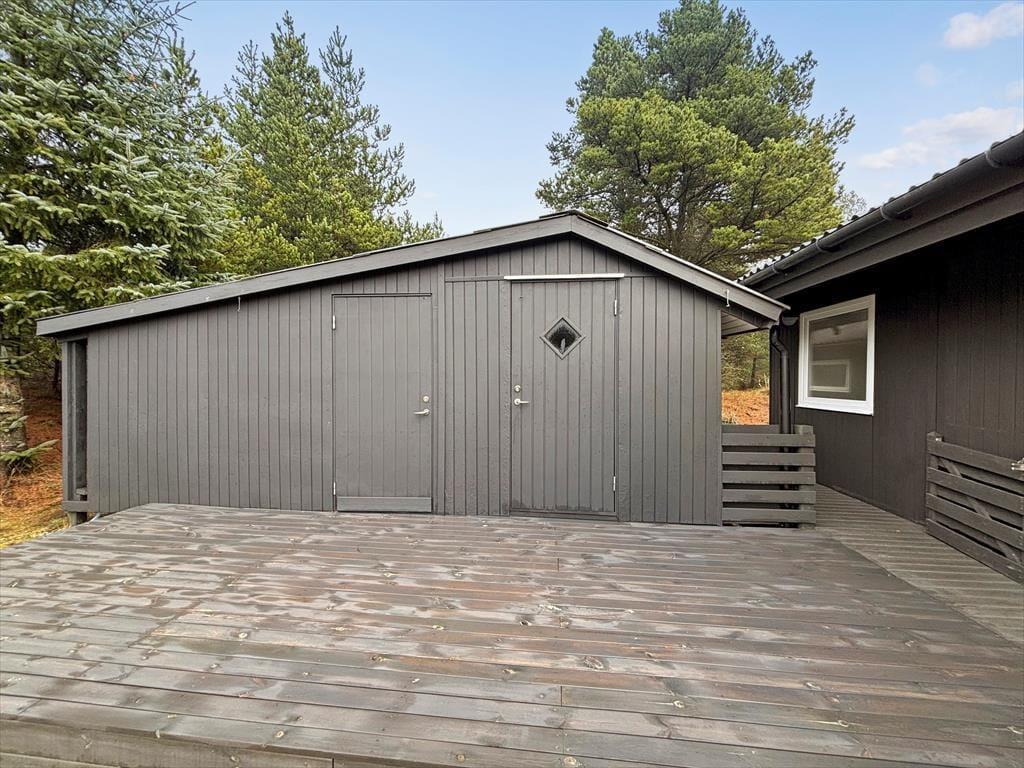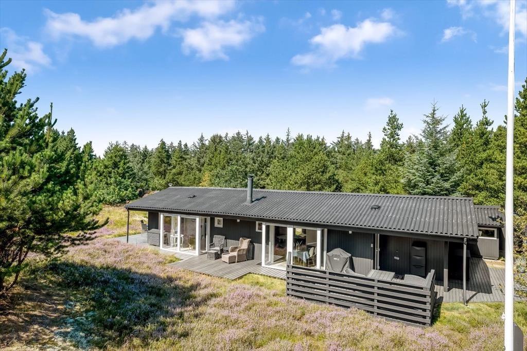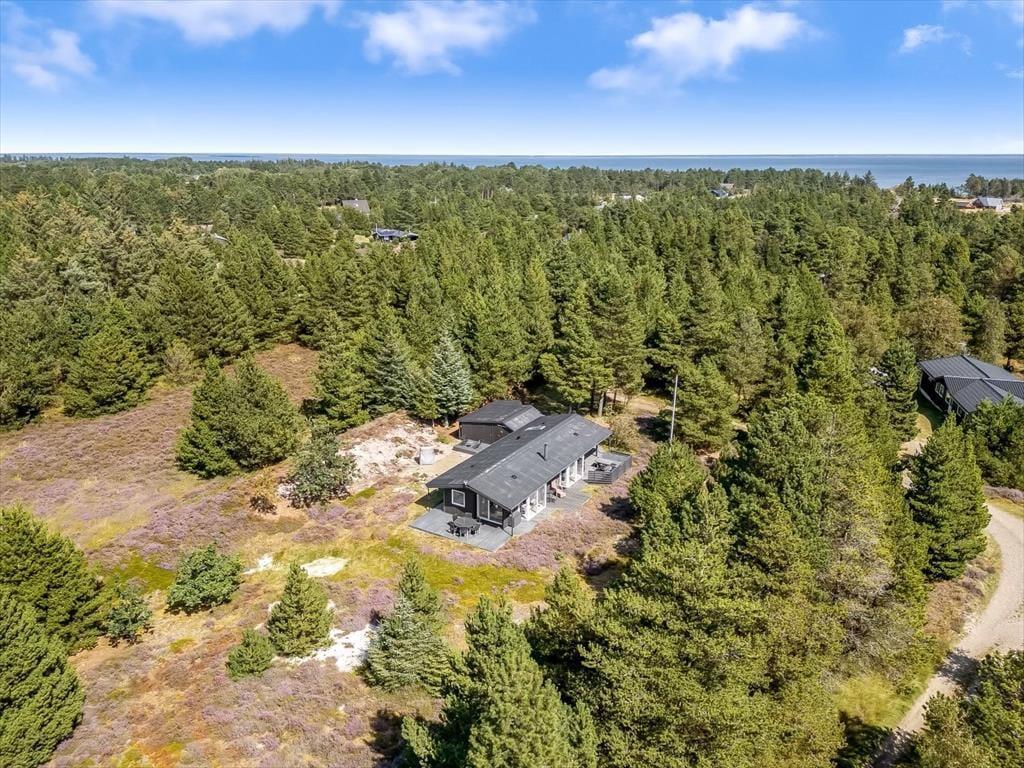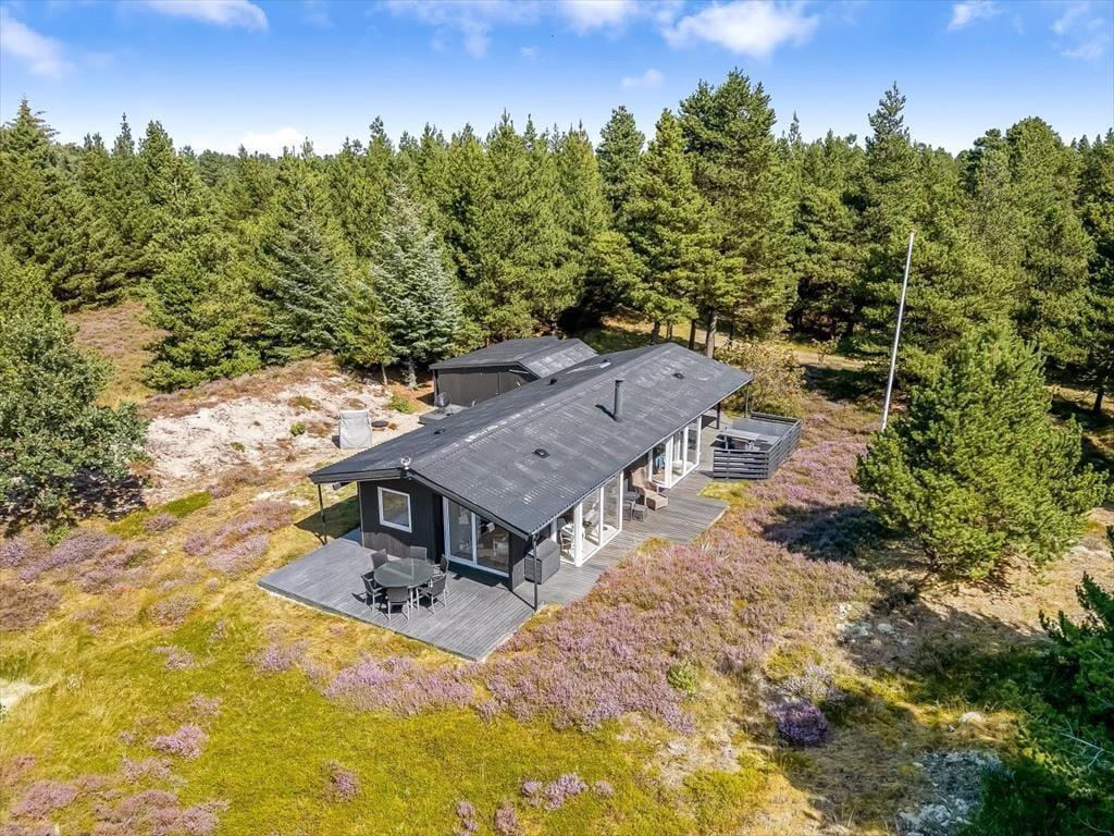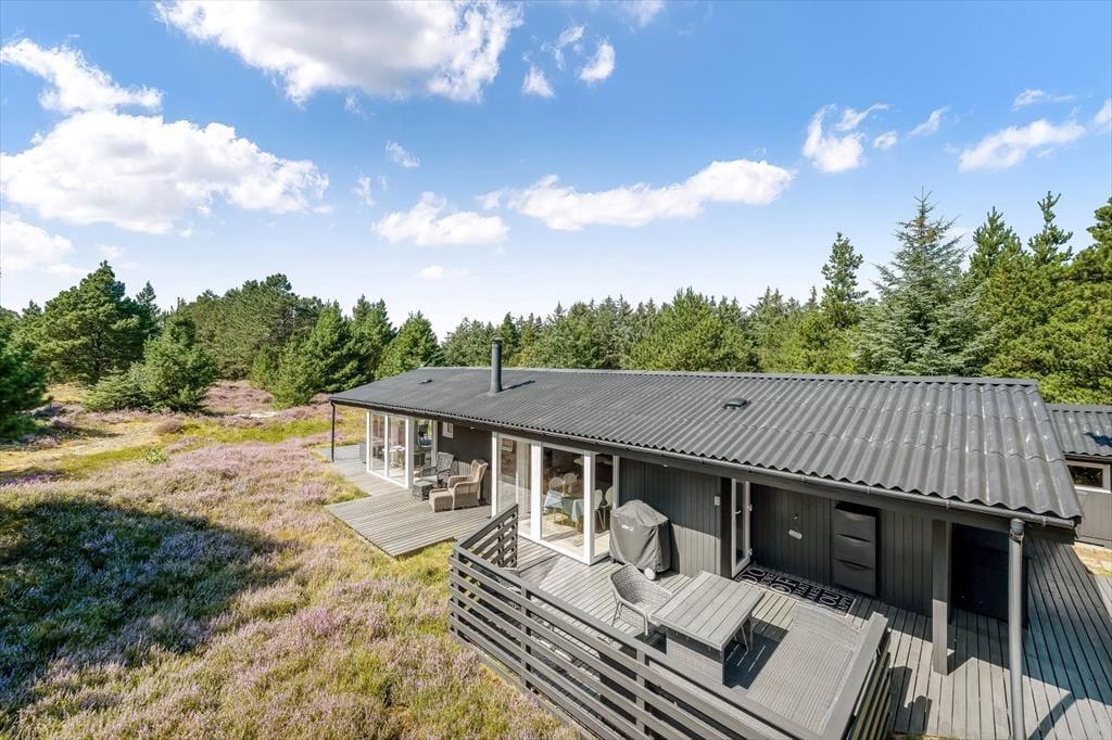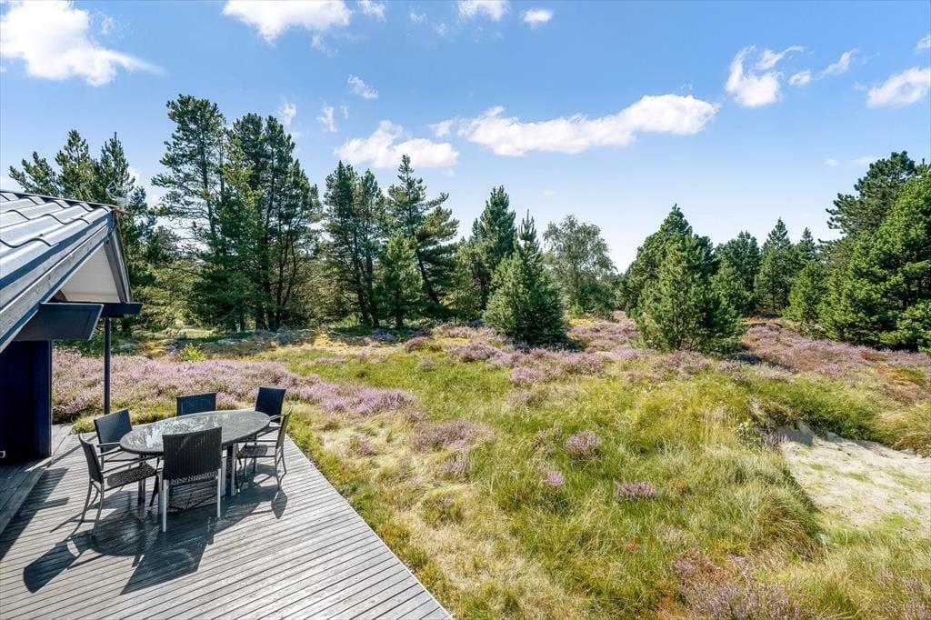 Selvom det er rart at opholde sig indenfor, er det nu også fristende at rykke ud i det fri, hvor det skønneste terrassemiljø breder sig rundt om sommerhuset: Her kan du sidde helt tæt på naturgrundens duftende lyng, hvor insekter arbejder ihærdigt på at samle nektar, mens du selv kan slappe helt af og nyde feriefreden. Fyrretræerne skærmer af ind mod de få naboer, der findes her for enden af M S Schouwsvej – og mon ikke det næsten er til at mærke på den friske luft og den tilbagelænede atmosfære, at der bare er få hundrede meter hen til Vadehavet?