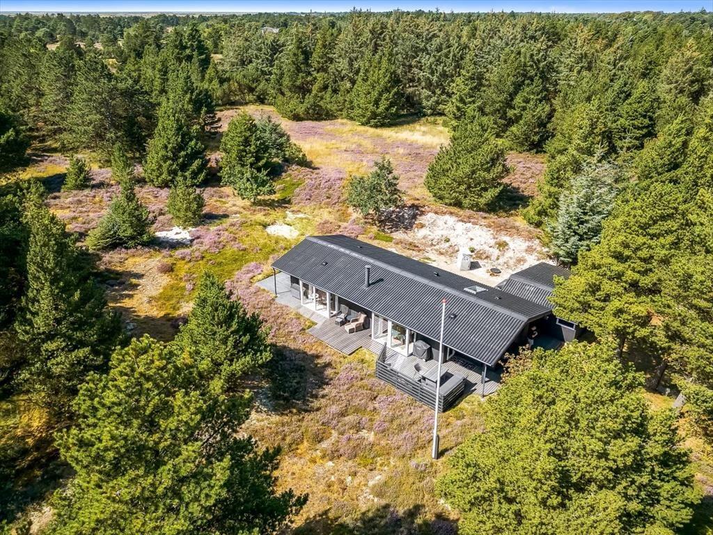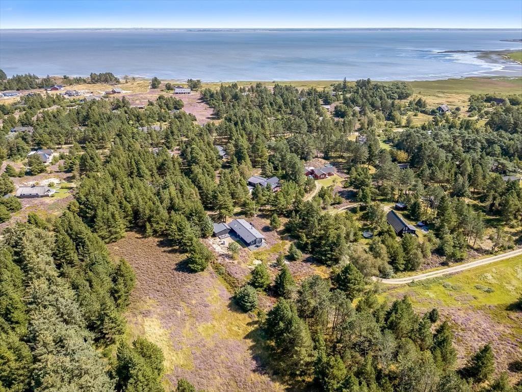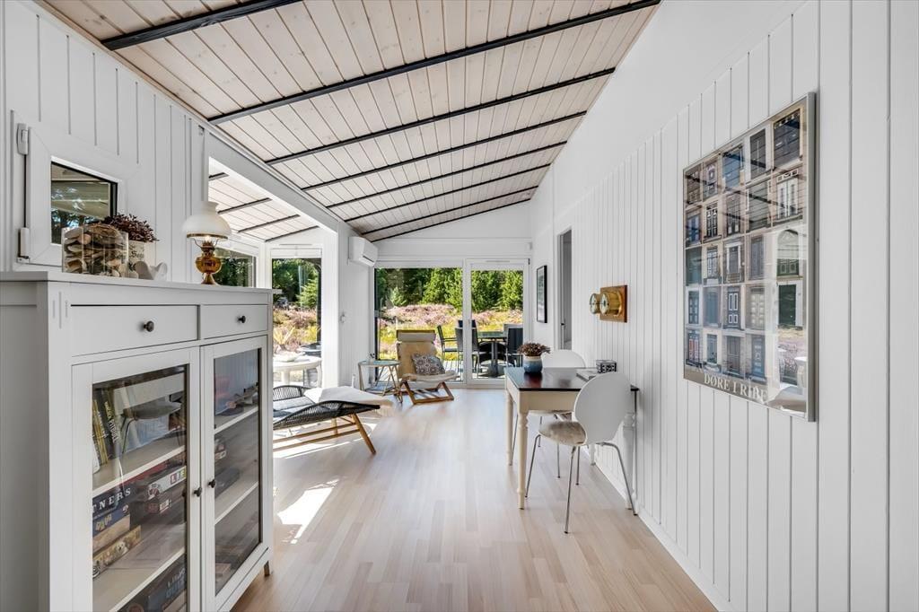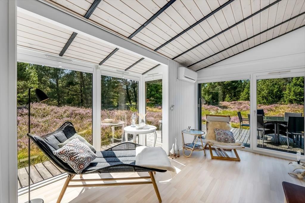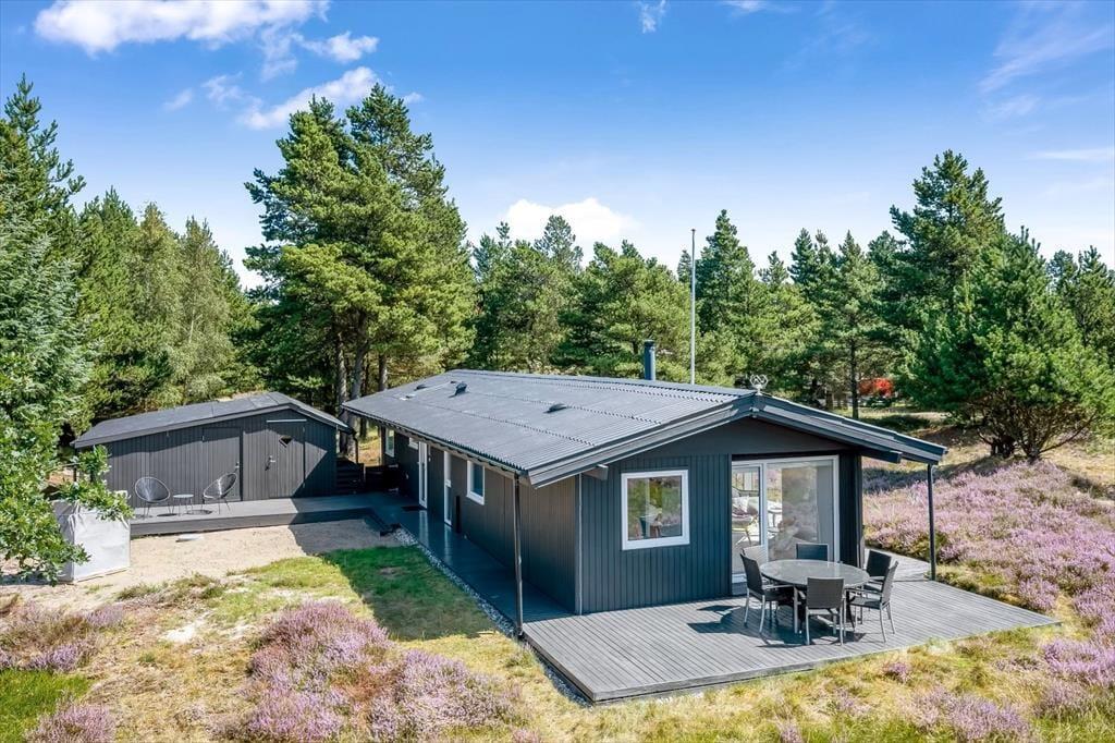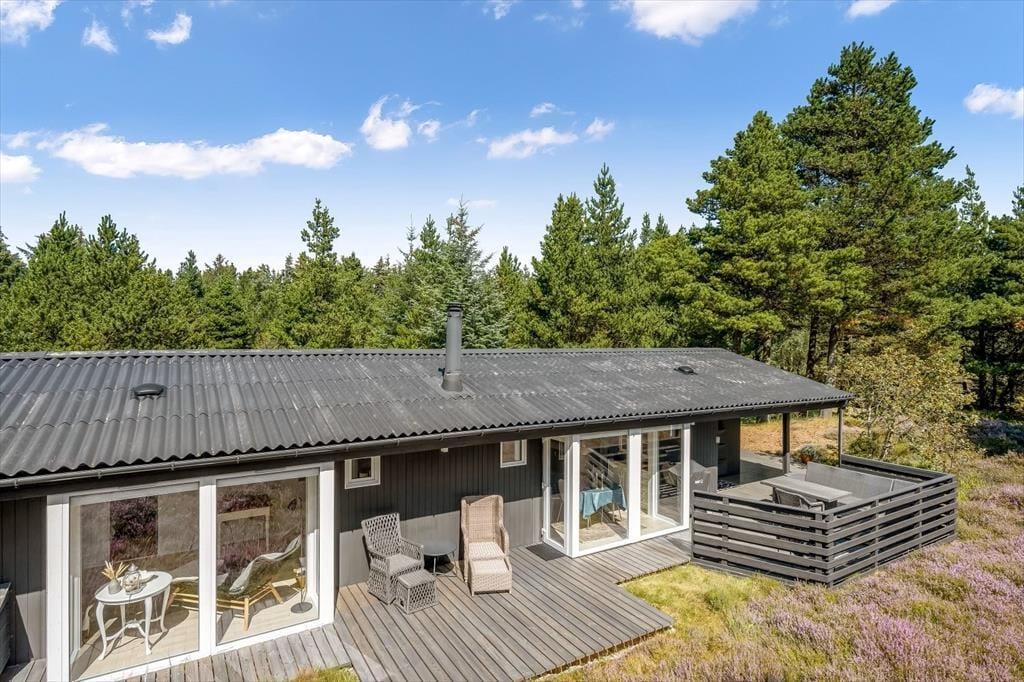Dette dejlige sommerhus har en helt perfekt adresse, hvis du drømmer om at holde ferie i rolige og naturskønne omgivelser. Det ligger nemlig i Kromose for enden af en lukket vej og derudover på en stor naturgrund med spredte fyrretræer og lilla tæpper af lyng – og takket være husets store vinduer får du glæde af det smukke syn, selv når du slapper af i en god lænestol.
