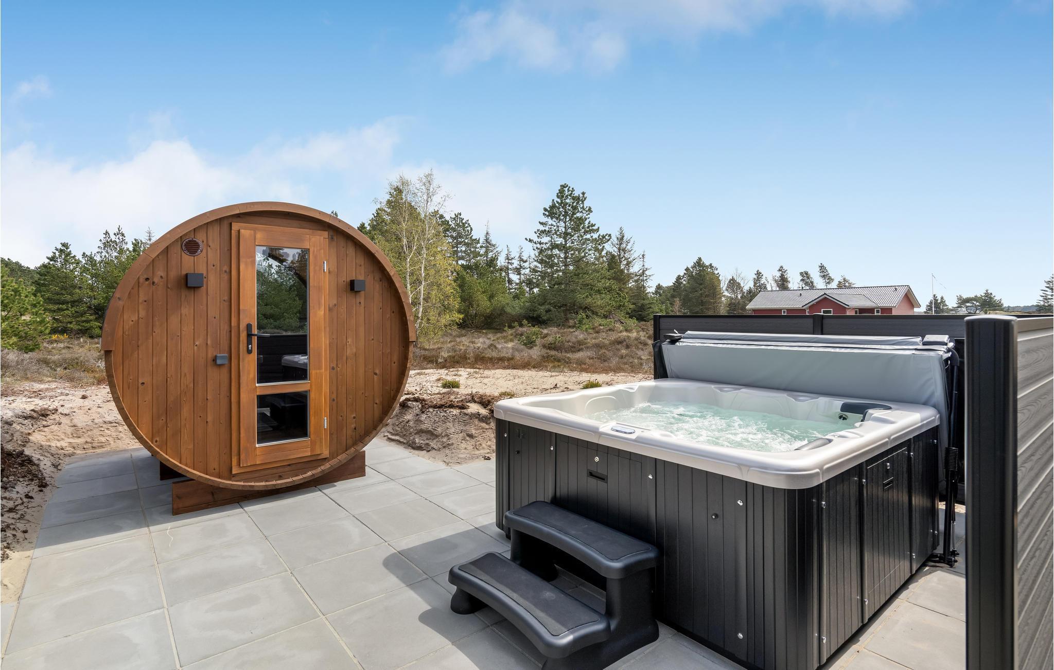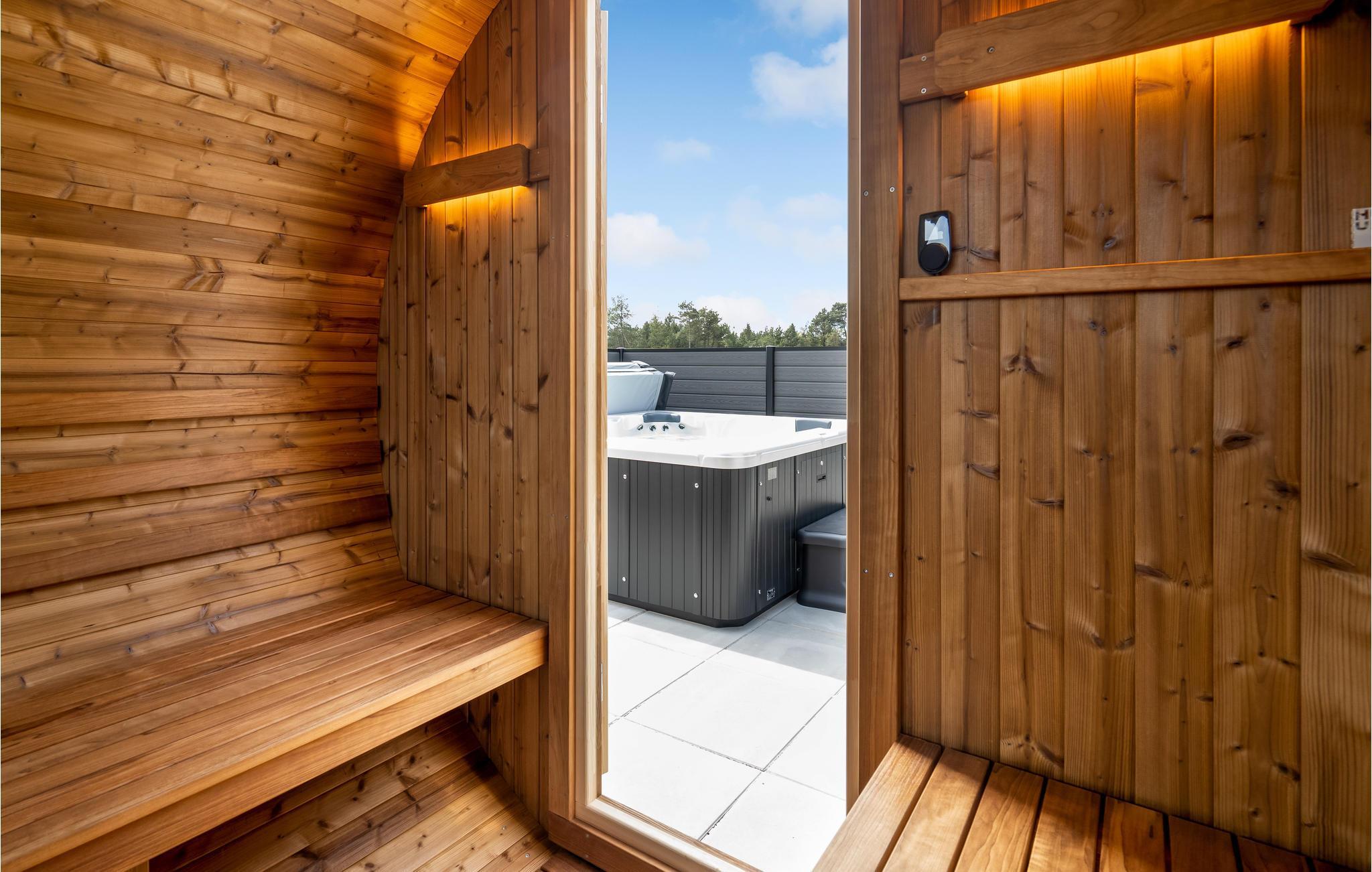 I kan også se frem til et skønt udeområde. Læn jer tilbage i spabadet, få varmen i tøndesaunaen eller nyd solen på terrassen. Der er også legeredskaber til de mindste, så her kan hele familien få mange timer til at gå.