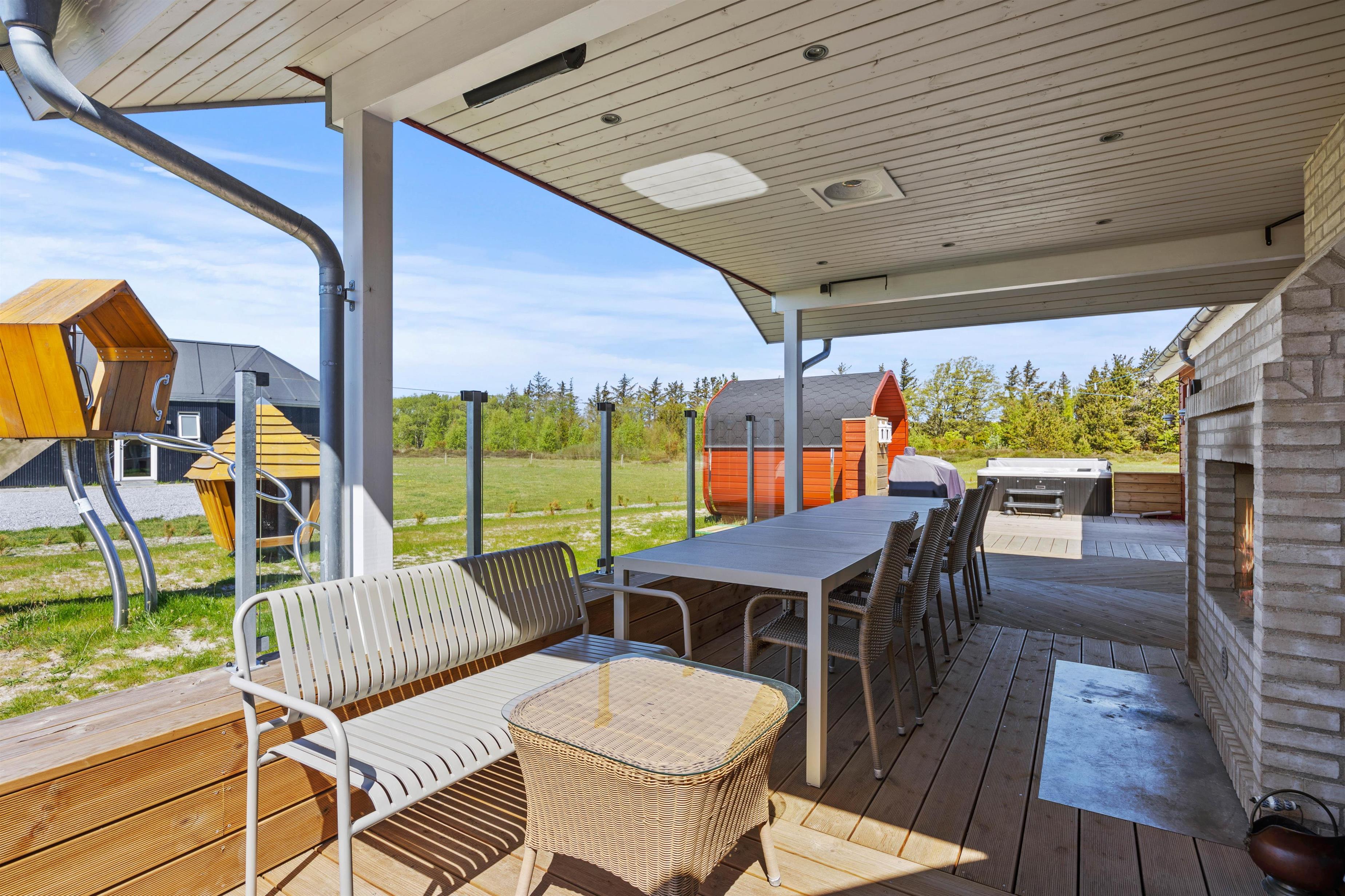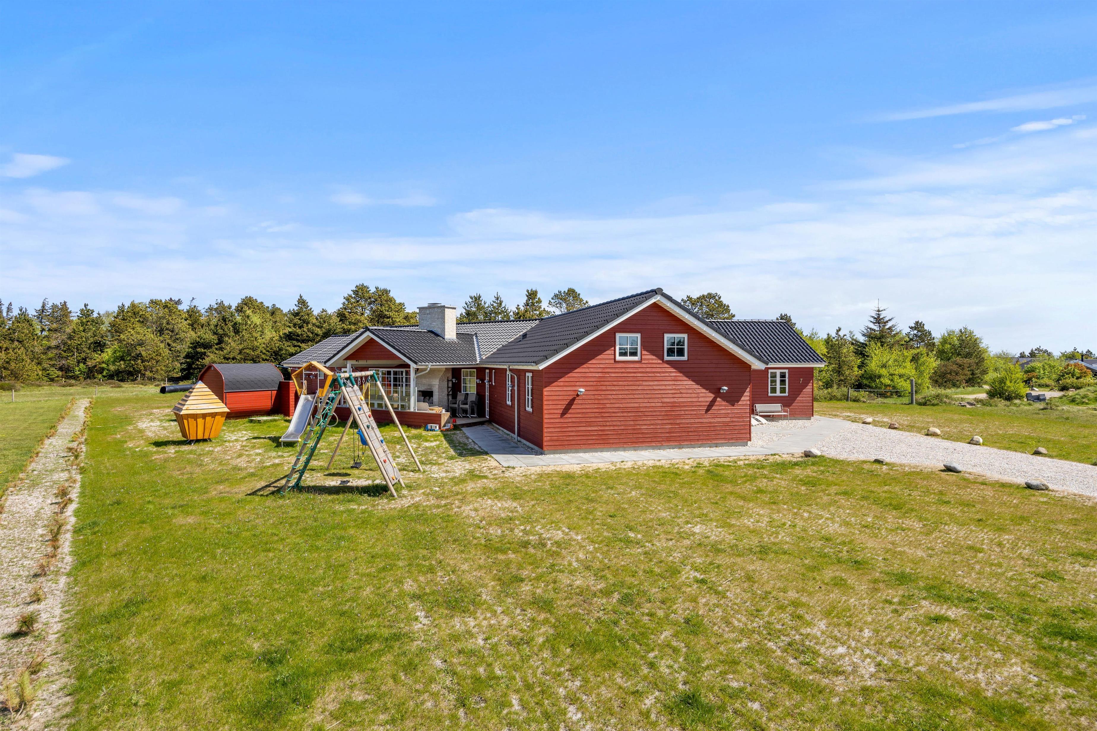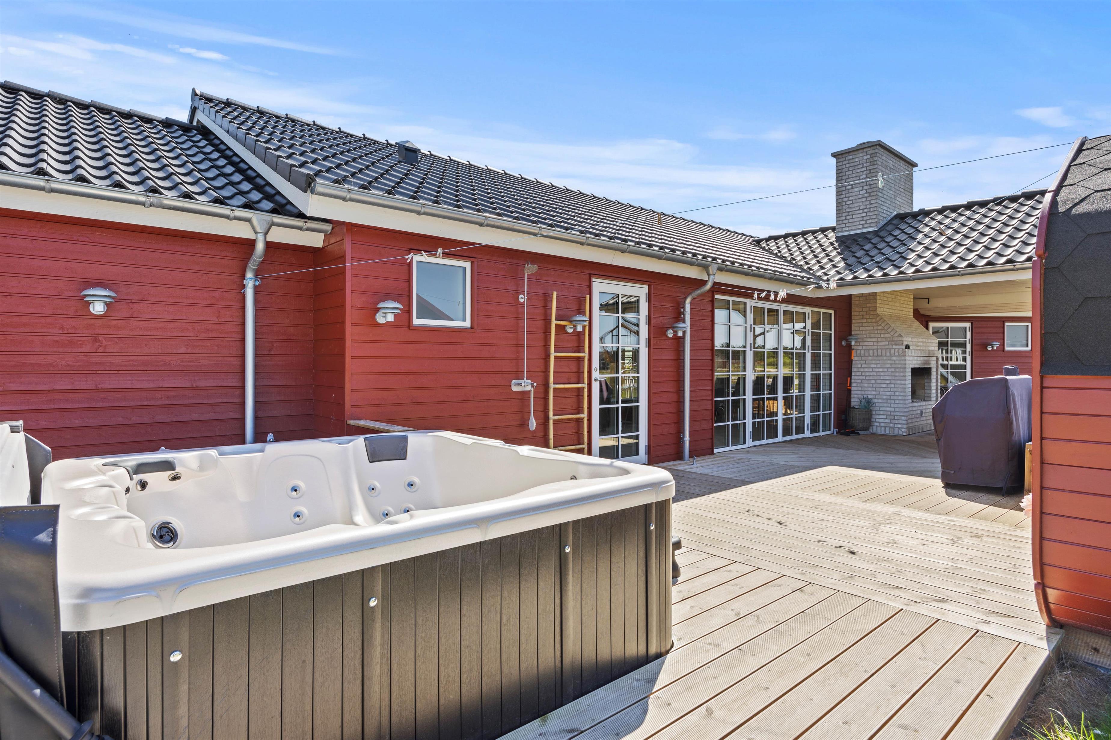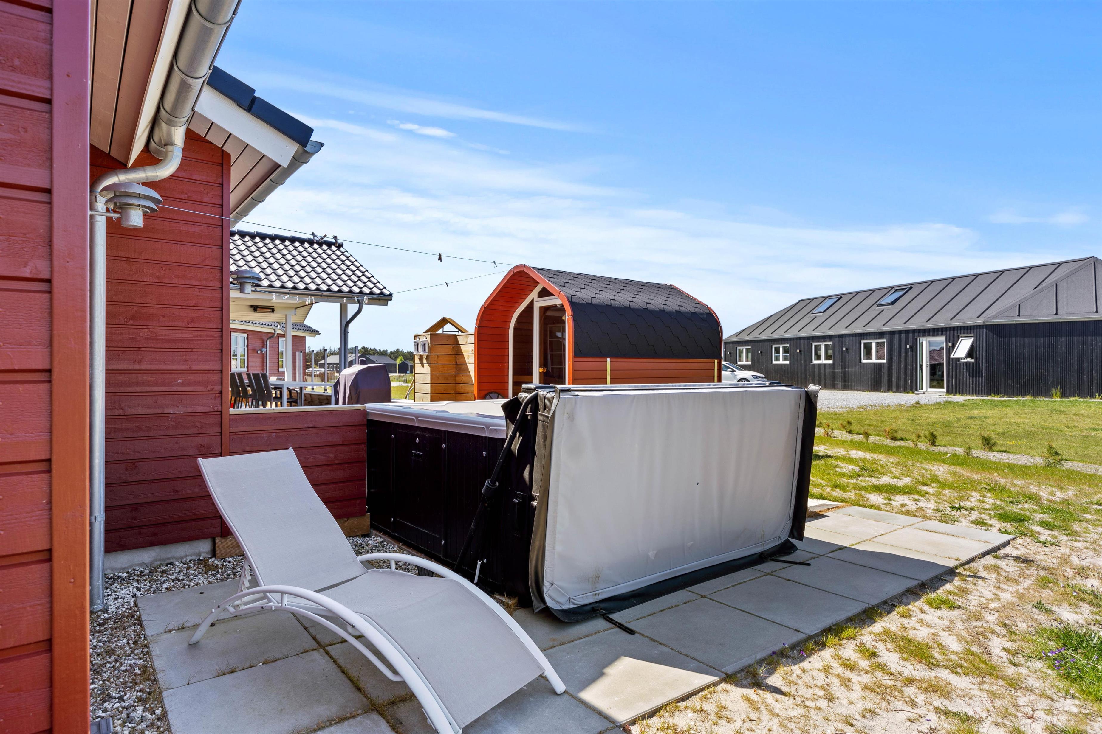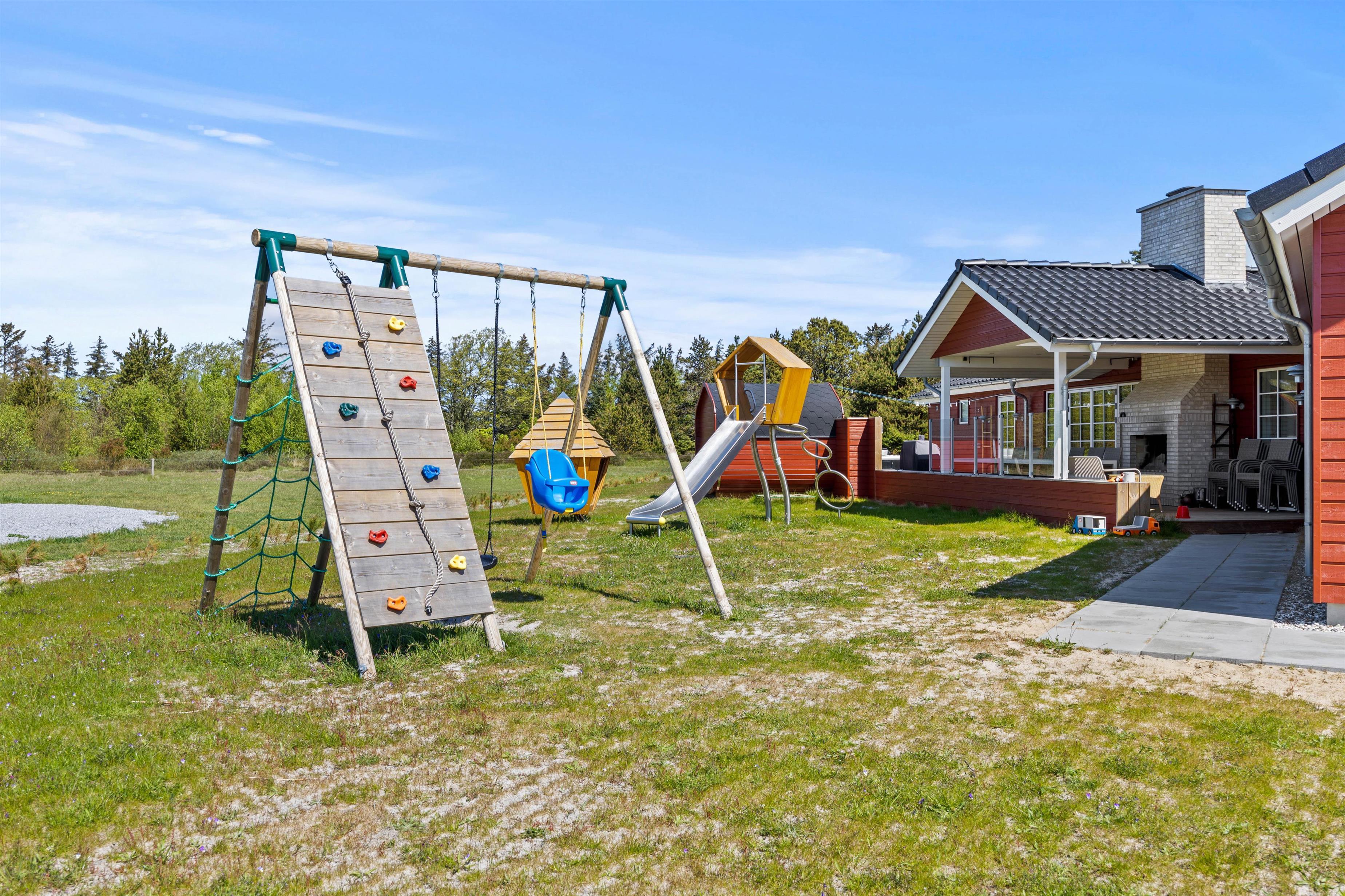 Aktivitetshuset er perfekt for dem, der søger både underholdning og hvile. Her kan I udfordre hinanden i en omgang billard, bordfodbold eller slappe af i saunaen eller poolen. Børnene vil elske at lege i haven med gynger og sandkasse, mens de voksne slapper af på den overdækkede terrasse foran udepejsen. For alle, der gerne vil nyde den friske luft og udendørsfaciliteterne, er der mulighed for at benytte udesaunaen, mens maden hyggeligt simrer på grillen.
