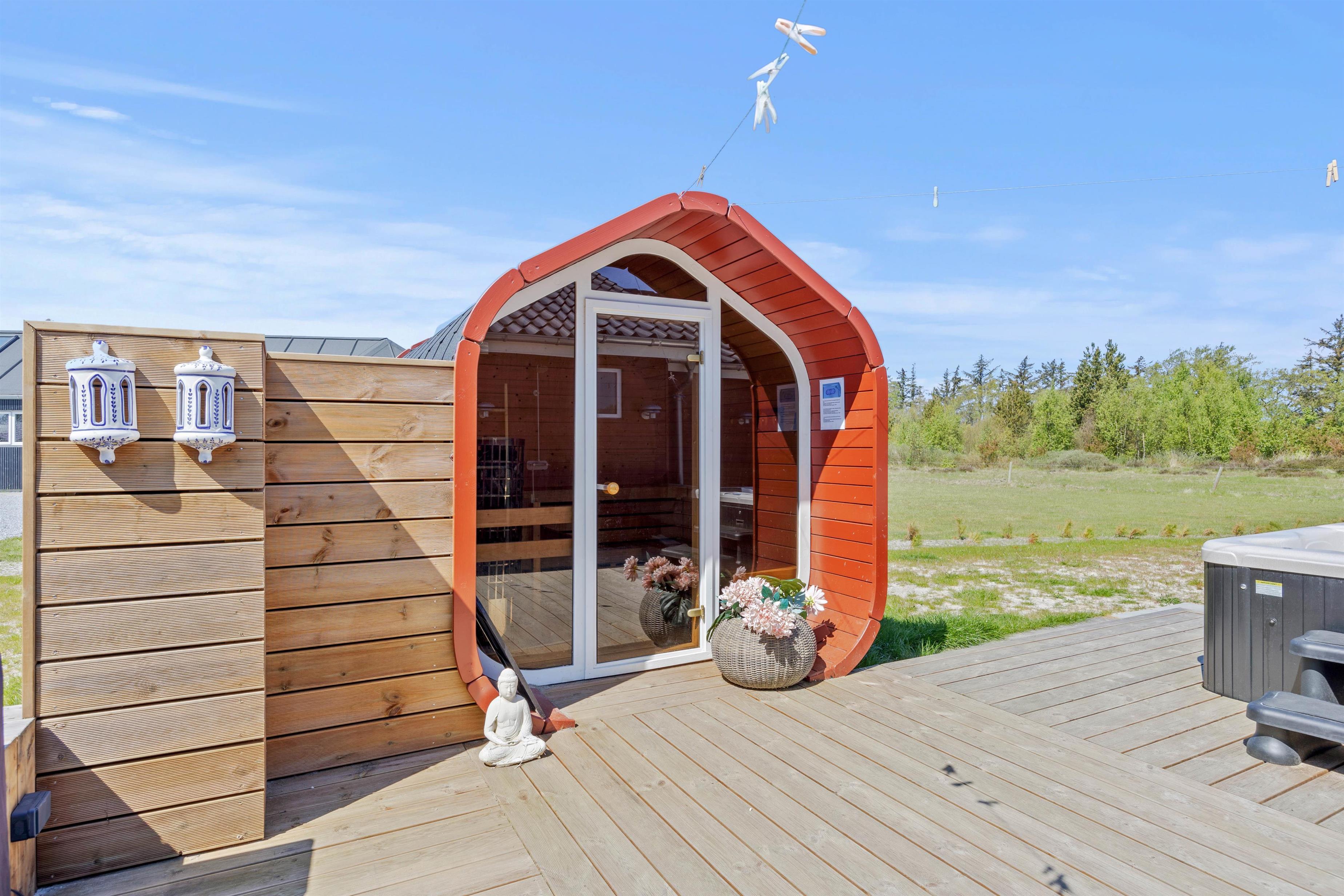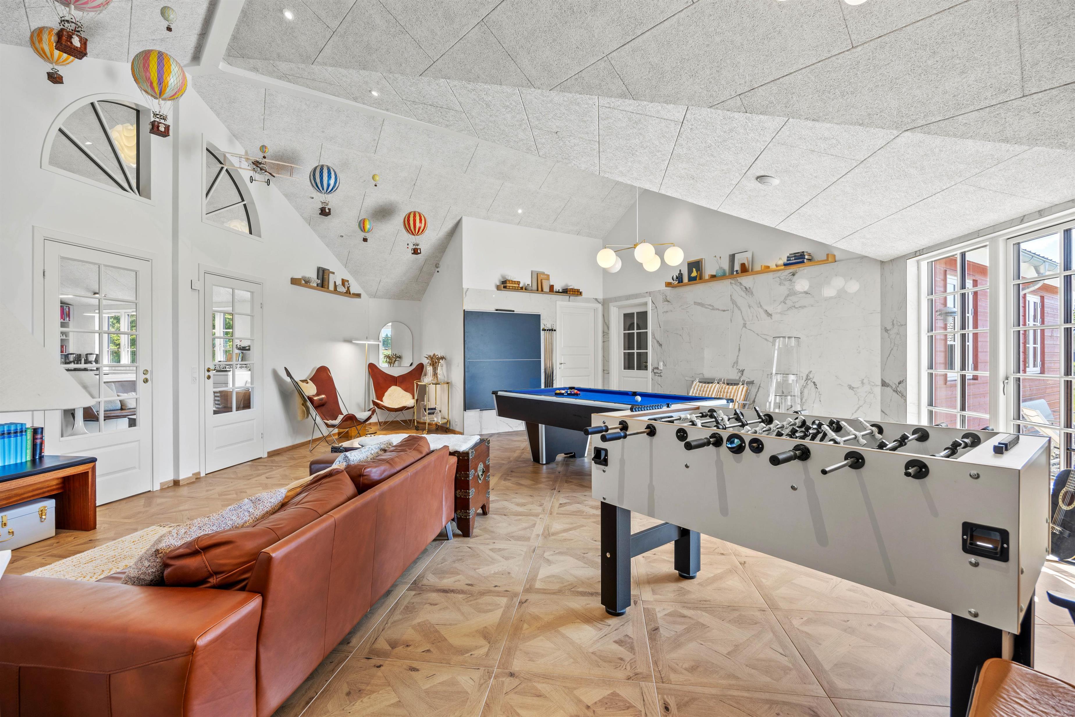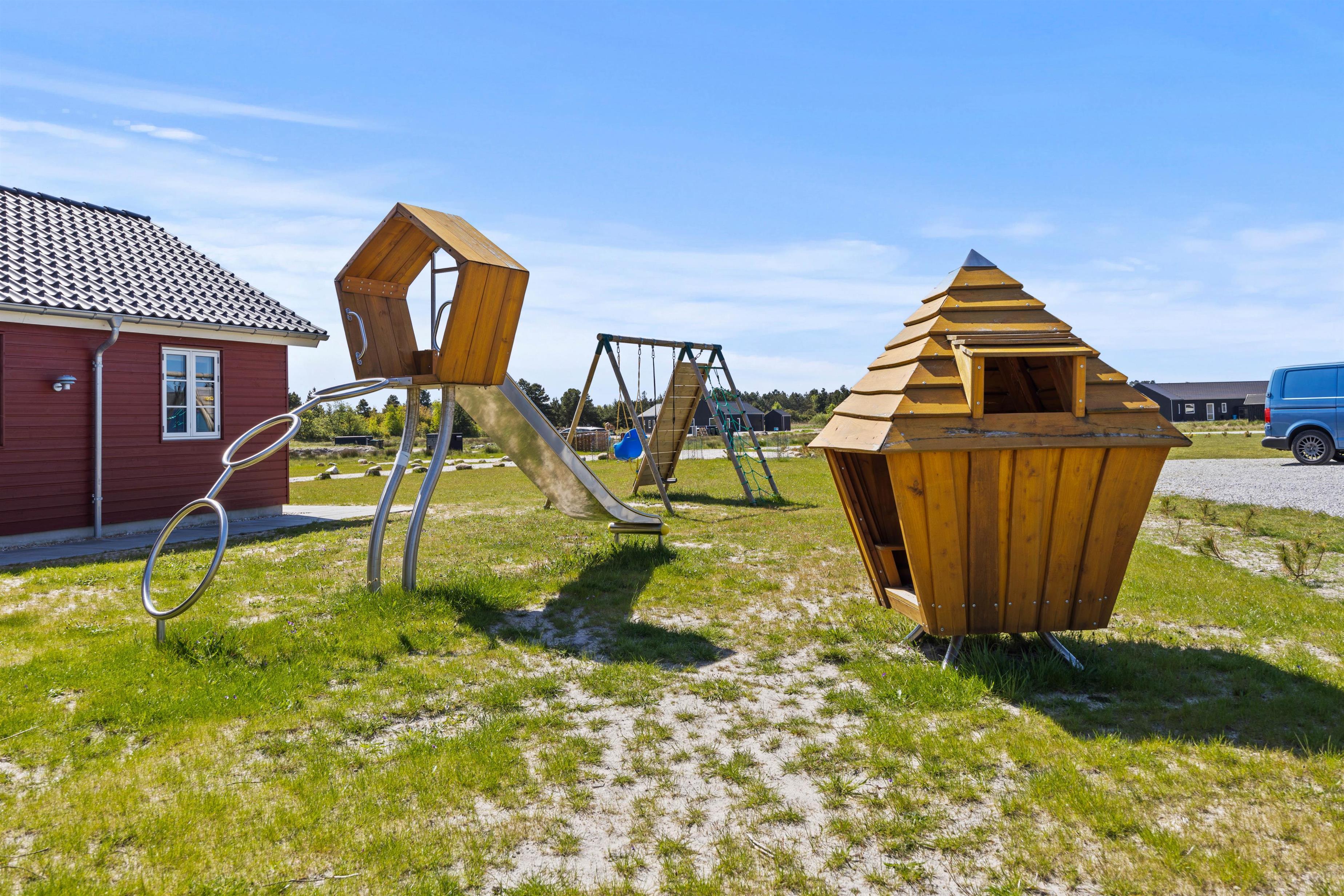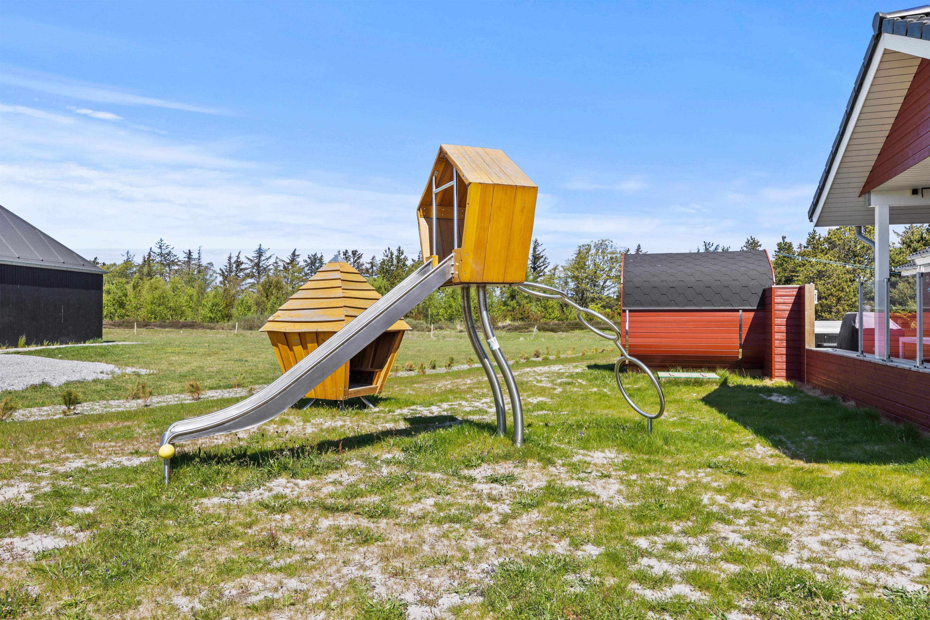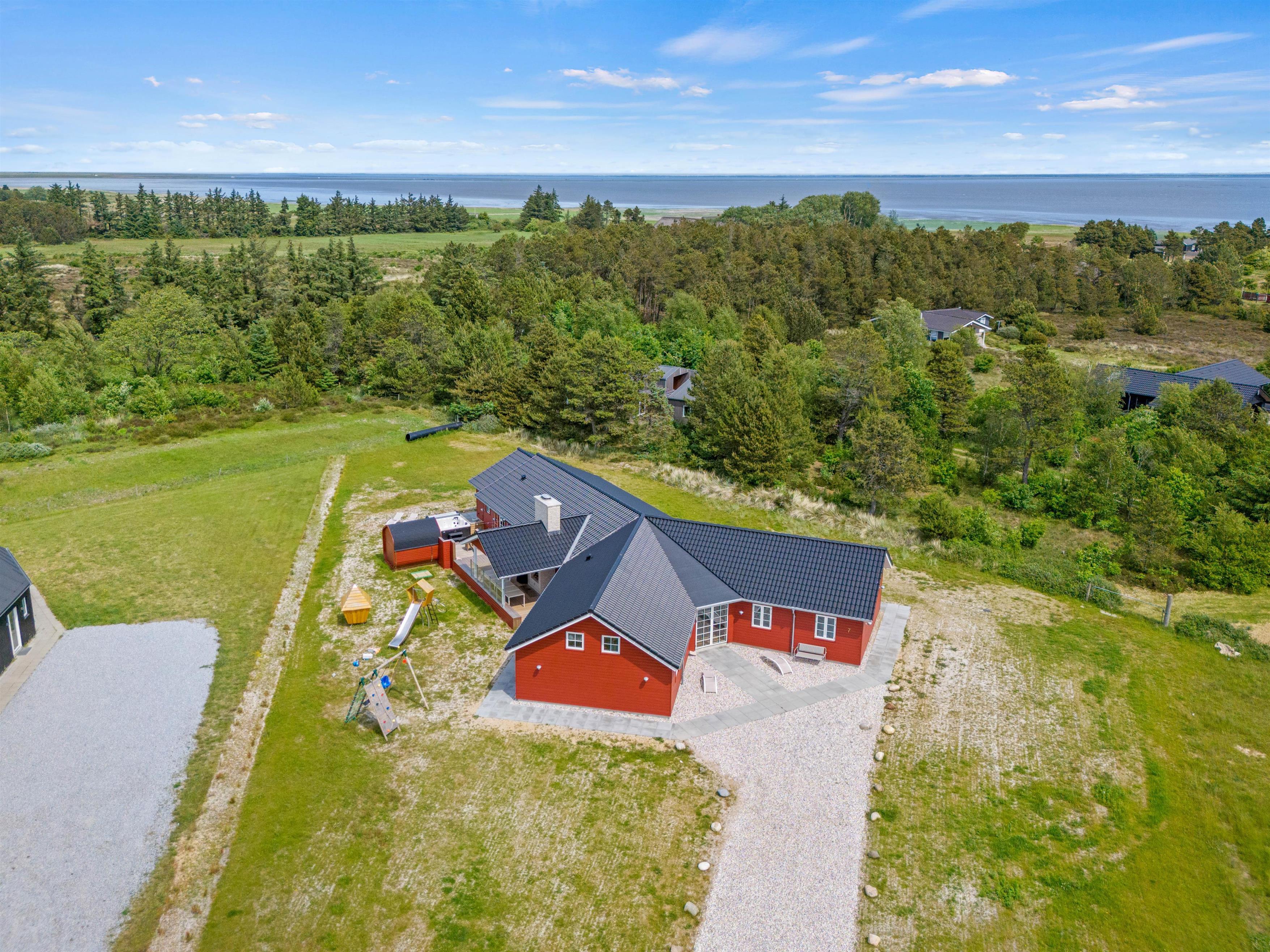 Aktivitetshuset er perfekt for dem, der søger både underholdning og hvile. Her kan I udfordre hinanden i en omgang billard, bordfodbold eller slappe af i saunaen eller poolen. Børnene vil elske at lege i haven med gynger og sandkasse, mens de voksne slapper af på den overdækkede terrasse foran udepejsen. For alle, der gerne vil nyde den friske luft og udendørsfaciliteterne, er der mulighed for at benytte udesaunaen, mens maden hyggeligt simrer på grillen.