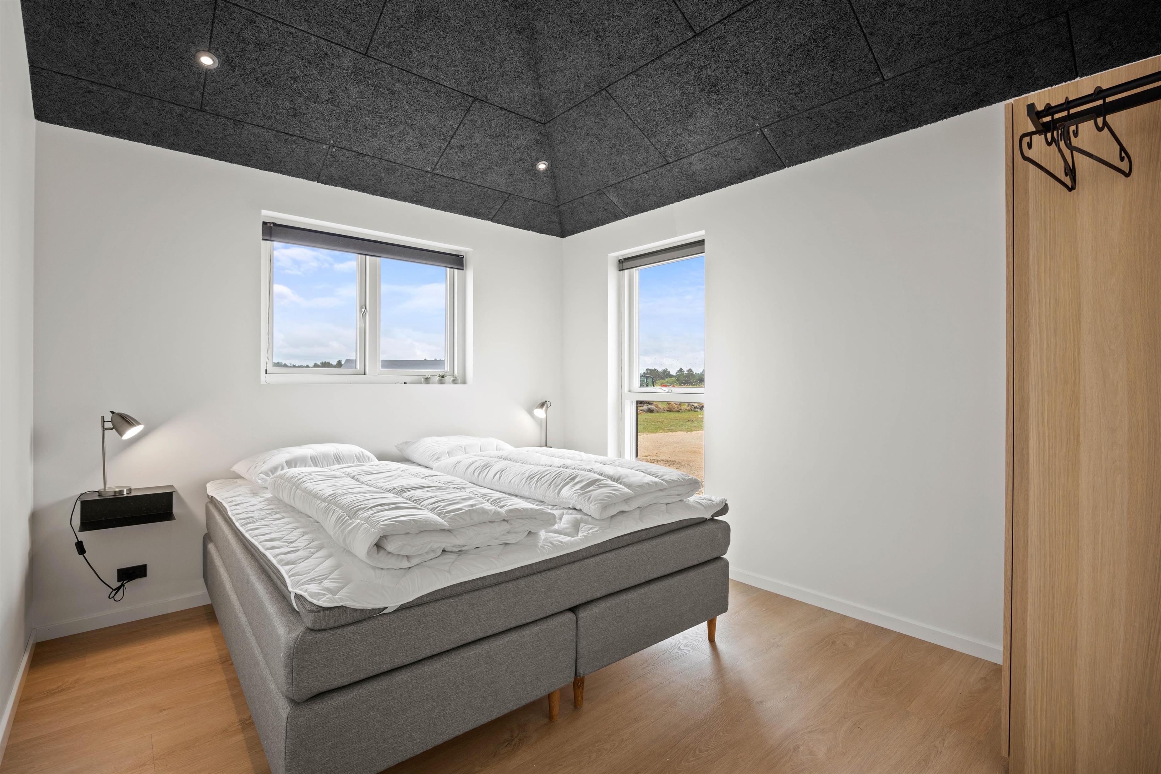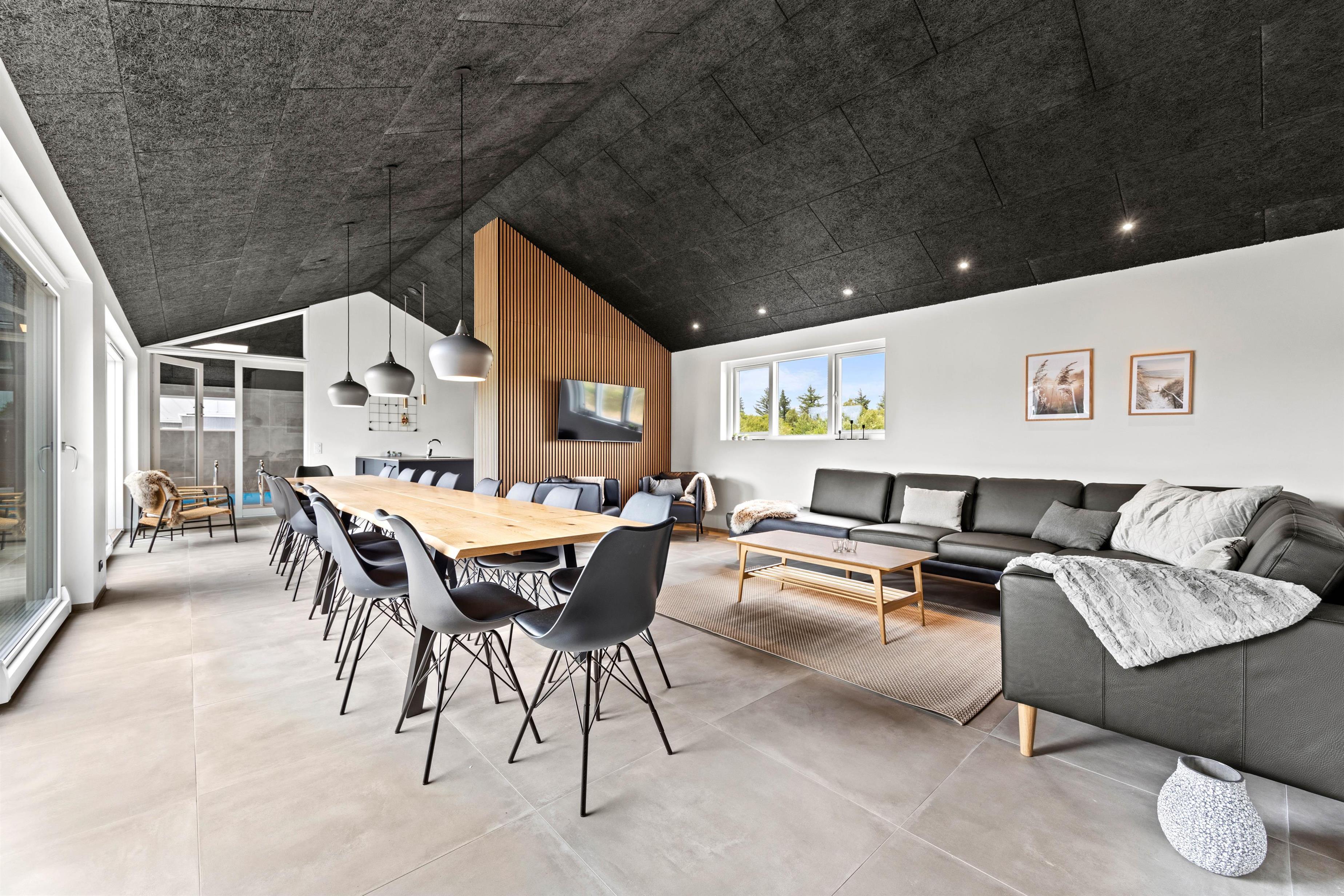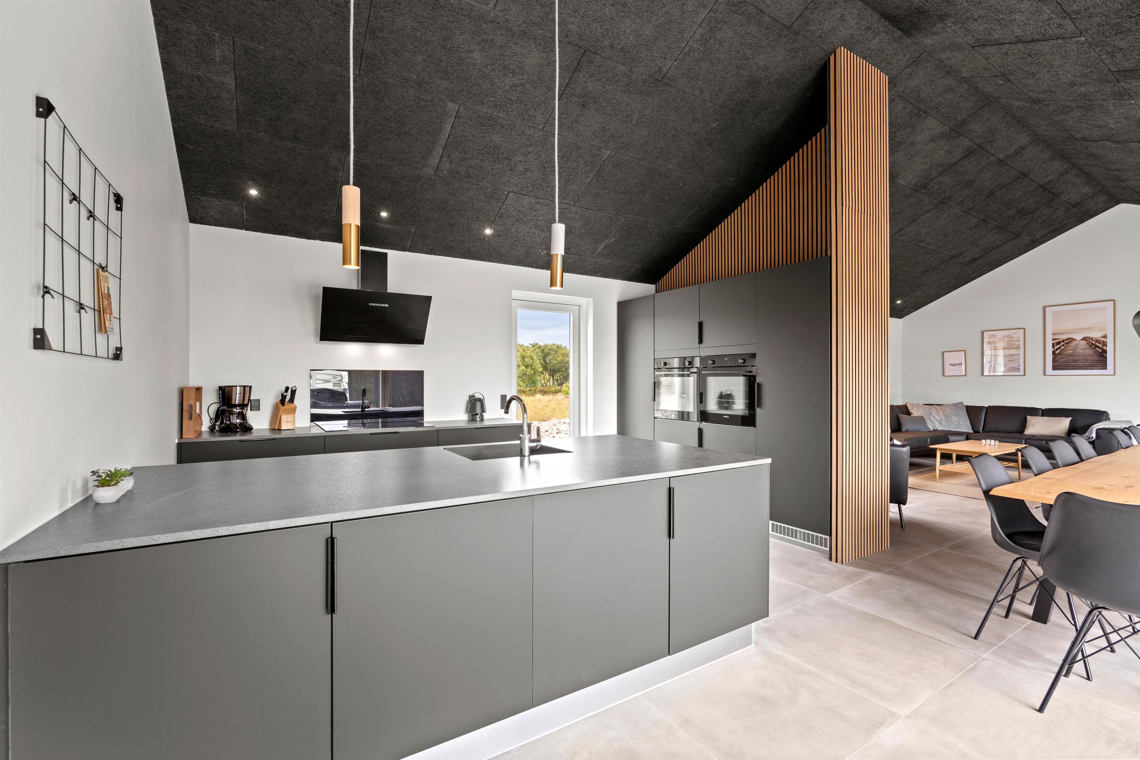Hjertet i sommerhuset er den rummelige og åbne stue med spisebord og åbent køkken, som er en fornøjelse at opholde sig i. De mange vinduer bader ikke kun opholdsrummet i et fantastisk lys, men giver jer også en følelse af at være helt tæt på naturen.