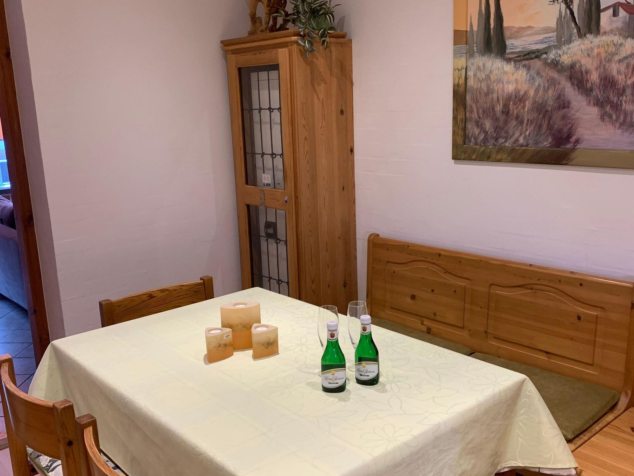 Die Ferienwohnung hat ein Schlafzimmer mit einem Doppelbett(kann auseinandergesetzt werden) und einer neuen Schlafcouch für 2 Personen mit den Maßen 140 x 200 cm. Eine weitere Schlafmöglichkeit bietet das gemütliche Schlafsofa 180 x 200 im Wohnzimmer. Es gibt eine gut ausgestatte Küche und eine separate Essecke, sodass problemlos zusammen gekocht und gegessen werden kann. Außerdem gibt es ein großes Badezimmer mit Dusche und Badewanne sowie ein separates Gäste-WC.