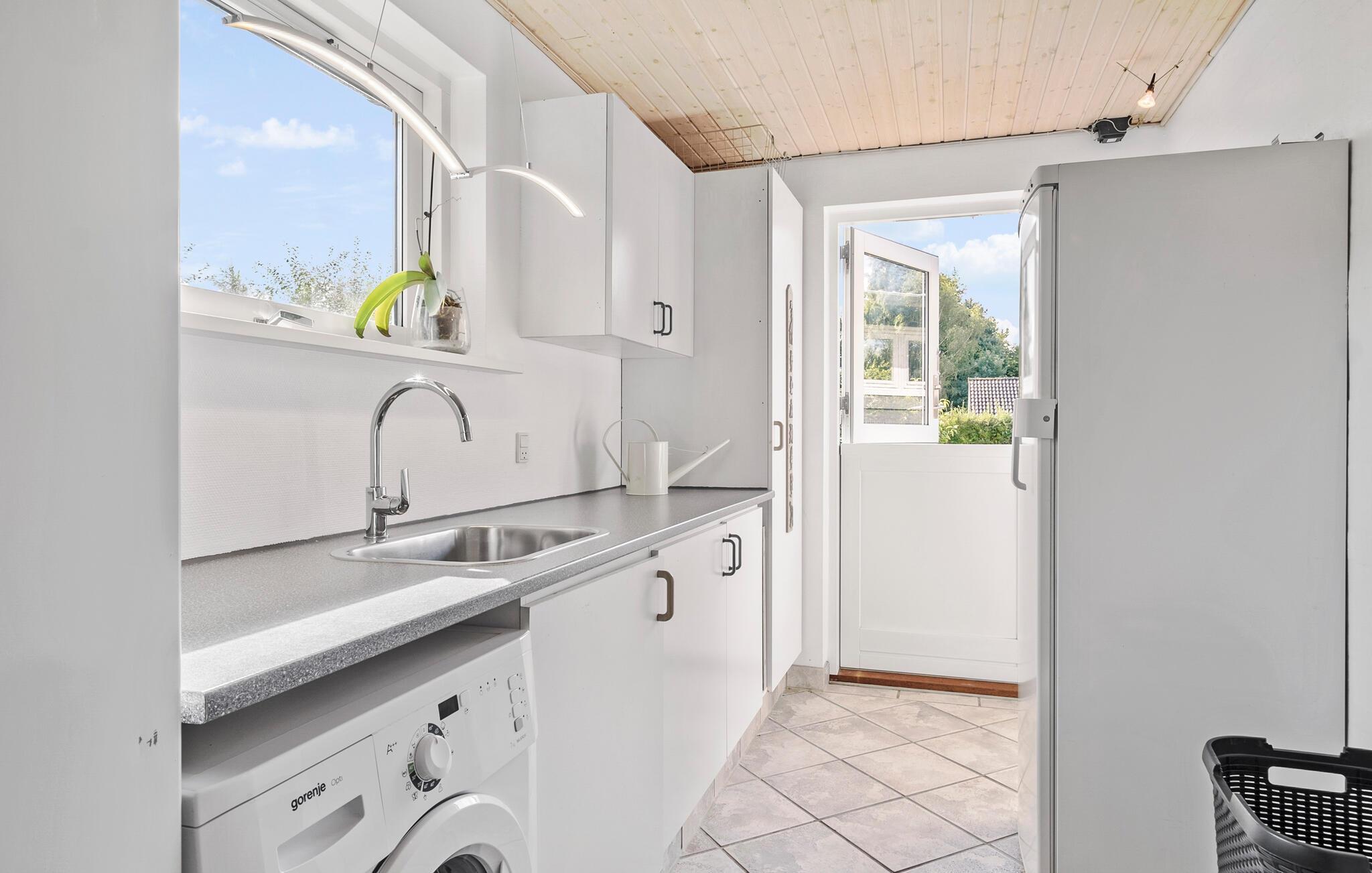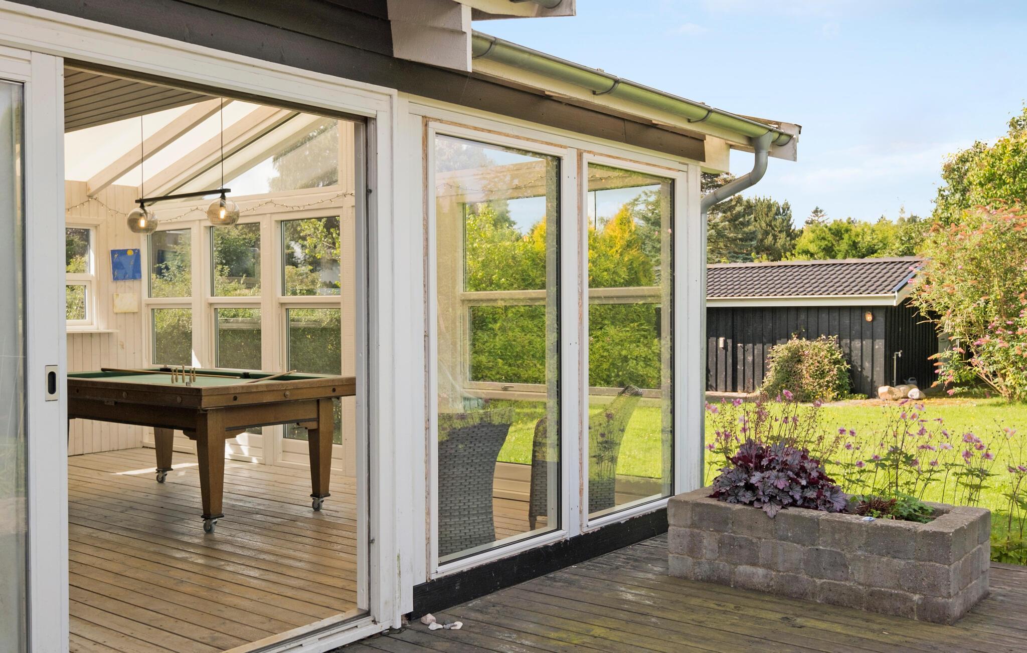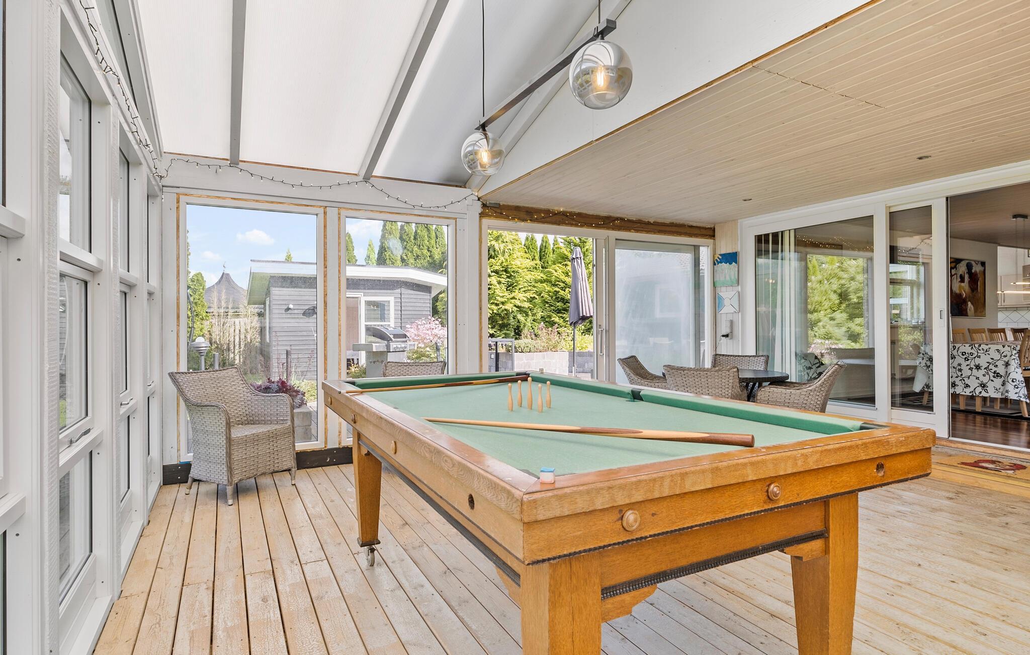 Jeres rummelige feriehus, der har plads nok til en stor familie, tilbyder alt, hvad I behøver for et afslappende ophold. Start jeres morgener med en lækker morgenmad i det lyse, moderne spiseområde, der ligger i direkte forbindelse til det veludstyrede køkken. Her kan I tilberede lækre måltider sammen. Den rummelige stue indbyder til afslappende stunder, og hvis vejret ikke arter sig, kan I tilbringe tiden i udestuen med en spændende bog eller en omgang billard. Eller afholde sjove turneringer i bordfodbold eller bordtennis.