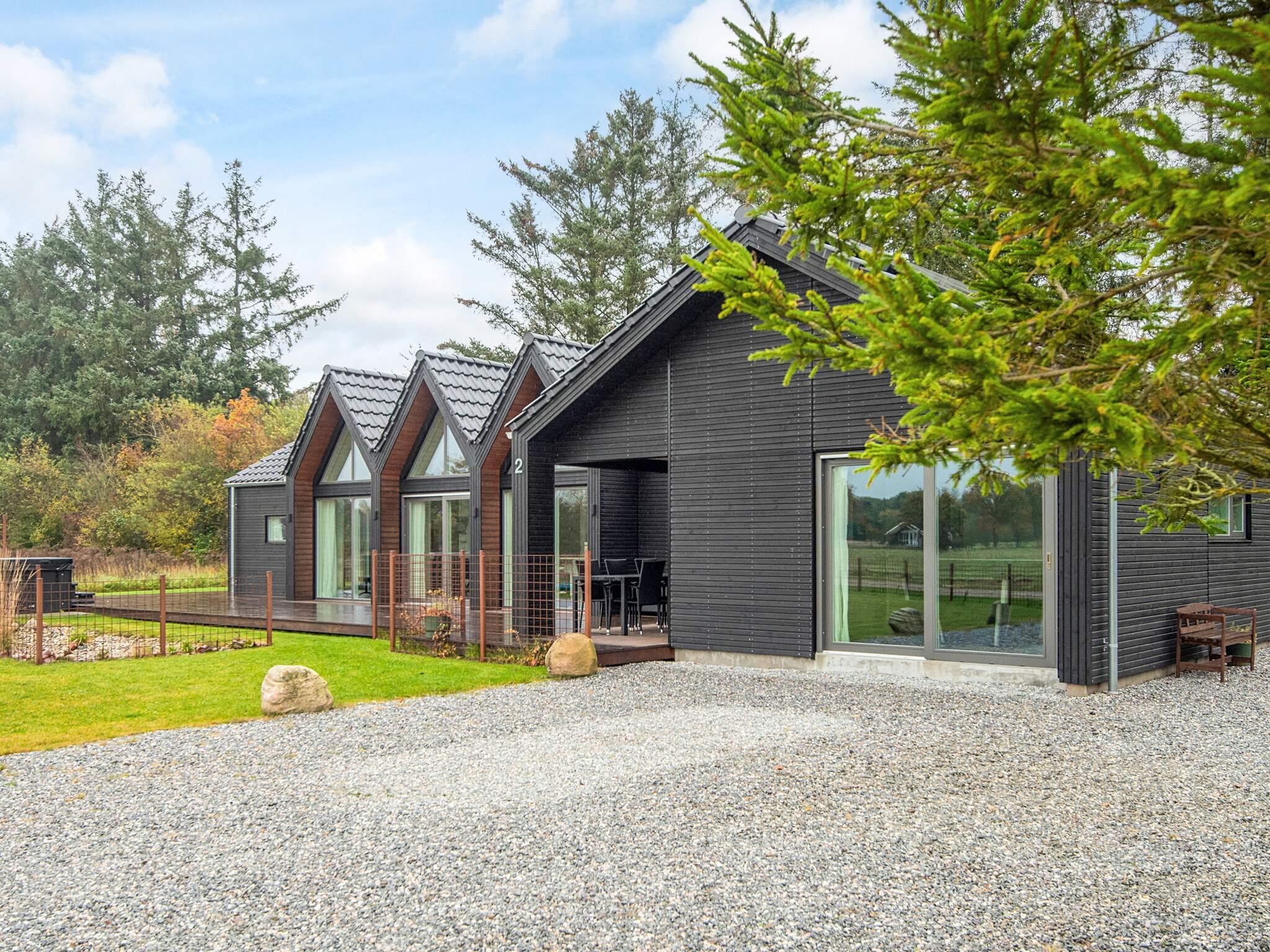 Ikke langt fra bredden af ??Kvie Sø finder I dette moderne feriehus bygget i 2022 i typisk skandinavisk stil, som kan rumme op til 12 personer. Til afslapning er der et udendørs spabad for op til seks personer. Feriehuset byder på de perfekte rammer for hyggeligt samvær, afslapning eller aktive ferier. Husets midtpunkt er absolut det store, lyse køkken med glasfacade mod vest. Stuen er hyggeligt indrettet med plads til alle. I det 25 m² store separate aktivitetsrum er der forskellige fritidsaktiviteter og spil at vælge imellem til sjov og leg med både store og små.