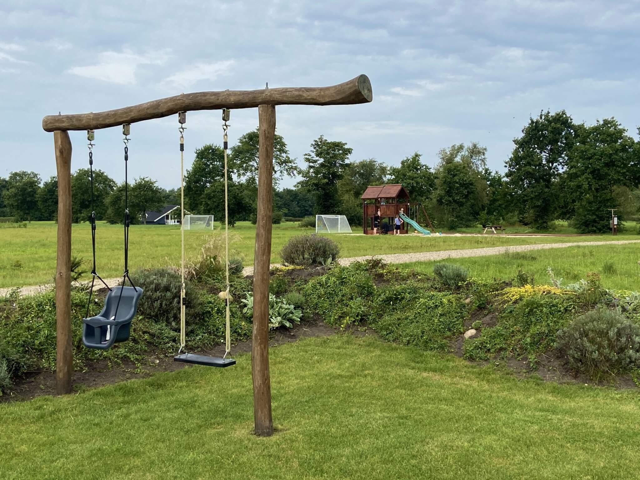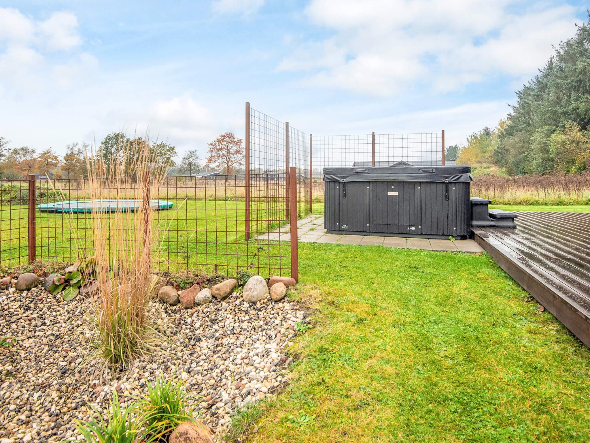 Ejendommen har desuden en 150 m² stor træterrasse til solrige dage og hyggelige grillaftener. Selv i de køligere måneder kan du slappe af i det varme vand i det store udendørs spabad. Den naturlige ejendom byder på en græsplæne med et fodboldmål til lille Messis og Ronaldos. Til de mindste er der også gynge, sandkasse og havetrampolin (brug på eget ansvar). Huset er udstyret med solcellepaneler, hvilket reducerer mængden af ??elforbrug markant.