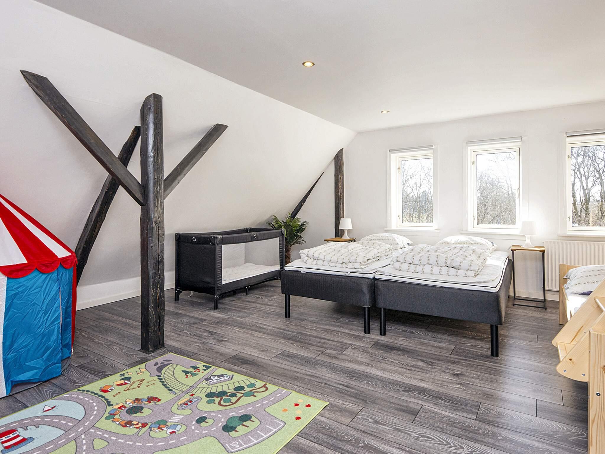 På første sal er der fire soveværelser og et stort åbent fællesareal med møbler og poolbord. To soveværelser har king-size dobbeltsenge (to enkeltsenge skubbet sammen) og en køjeseng med en dobbeltseng i bunden. Det ene soveværelse har to enkeltsenge og en køjeseng med dobbeltseng i bunden, og det sidste soveværelse har en king-size dobbeltseng og en juniorseng. Der er også toilet med vaskemaskine og tørretumbler.