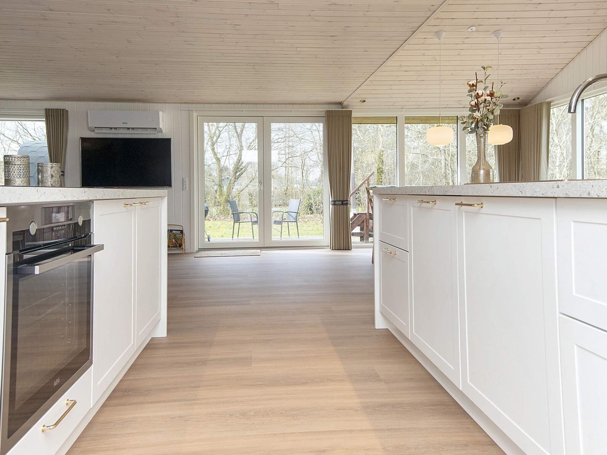 Indvendigt byder huset på en generøs stue og spisestue i åbent plan, ideel til familieliv og sammenkomster. Det moderne og komfortable interiør blander funktionalitet med en hyggelig, indbydende atmosfære, hvilket sikrer et behageligt ophold for alle gæster. Store vinduer giver uforstyrret udsigt over søen, fylder hjemmet med naturligt lys og forbinder dig med de fredfyldte omgivelser.