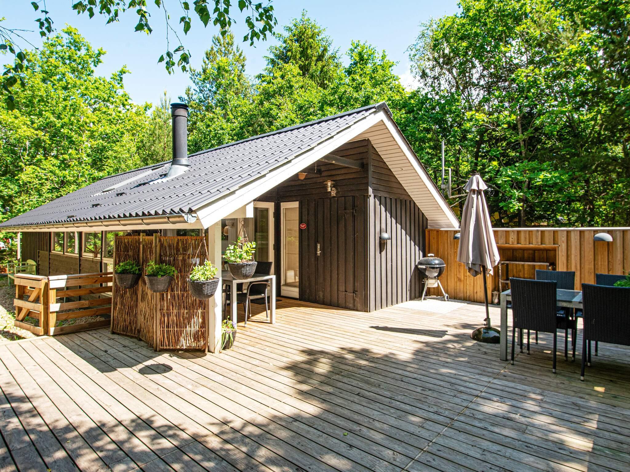 Beliggende for enden af lukket vej finder I dette veludstyrede sommerhus kun ca. 75 meter fra Kvie Sø med sandstrand. Sommerhuset er udstyret med energivenlig varmepumpe, brændeovn, vaskemaskine, tørretumbler, gratis trådløst internet og tv med danske og tyske kanaler. Huset er indrettet med opholds- og spisestue i åben forbindelse med køkkenet. Foruden badeværelset er der to soveværelser, hvoraf det ene er udstyret med en dobbeltseng, mens det andet er udstyret med en enkeltseng og en køjeseng. Fra stuen er der udgang til sommerhusets delvist overdækkede terrasse. I forbindelse med terrassen finder I en indhegning for mindre hunde, så de har mulighed for selv at rende lidt rundt på sommerhusets grundstykke. Udlejes ikke til ungdomsgrupper.